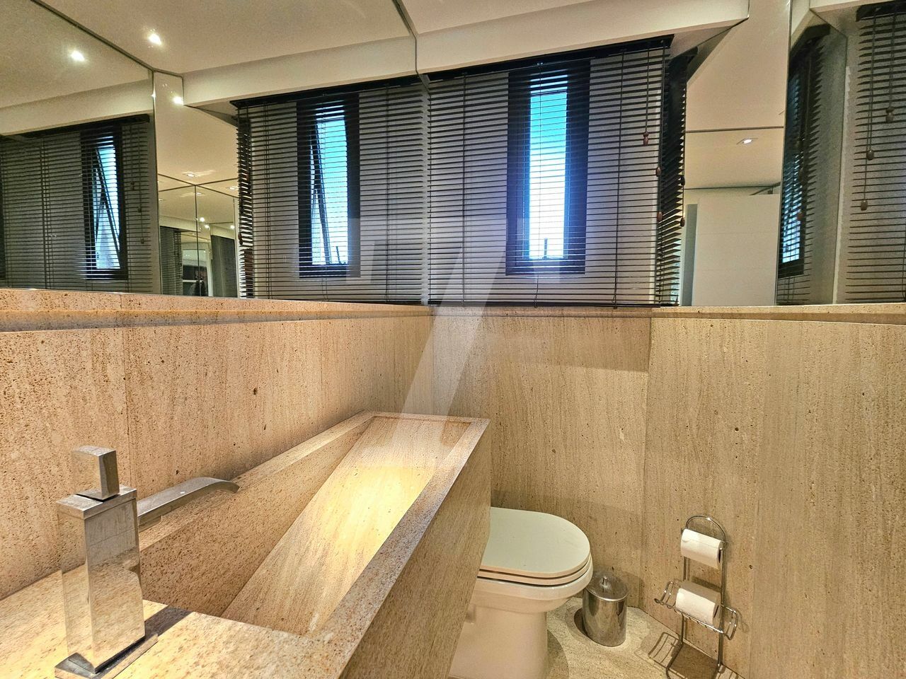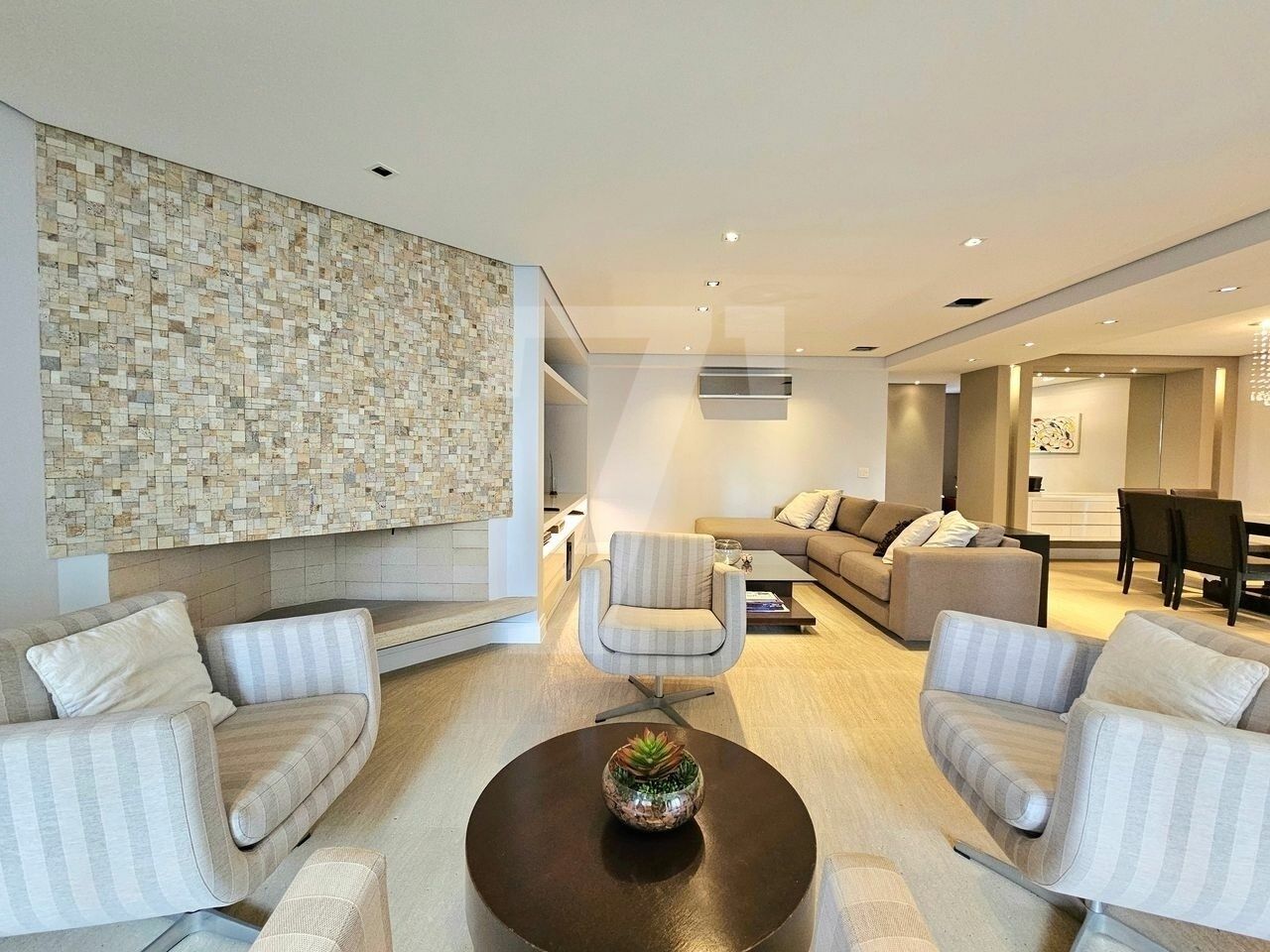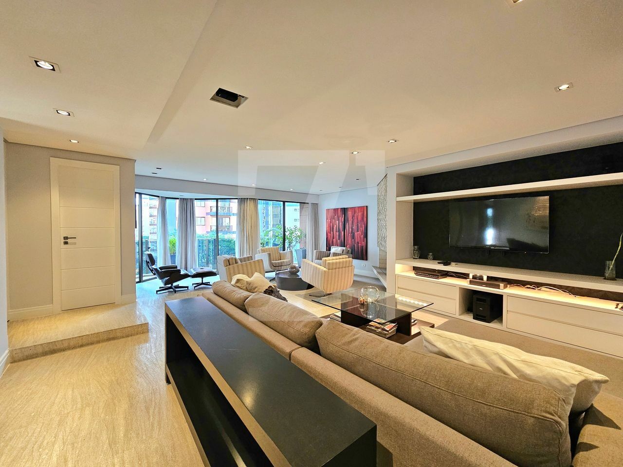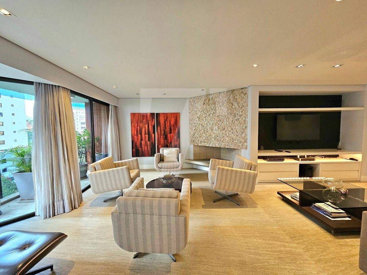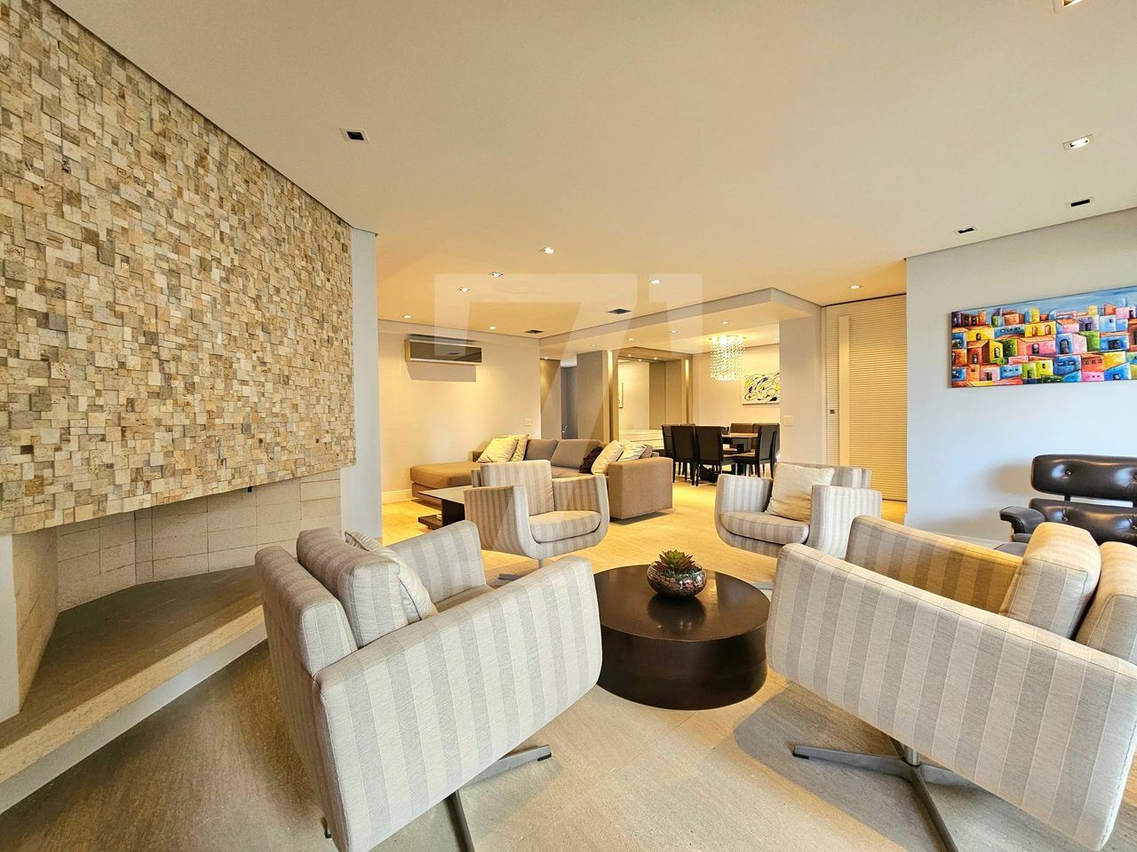 O living oferece três ambientes: sala com lareira e varanda que se estende de parede a parede, uma confortável sala de TV e a sala de jantar, que acomoda oito pessoas também com varanda. O piso é em mármore e a mobília é de excelente qualidade. No lavabo, a pia é esculpida e o revestimento em mármore. Além disso, o hall social é individualizado, garantindo privacidade.