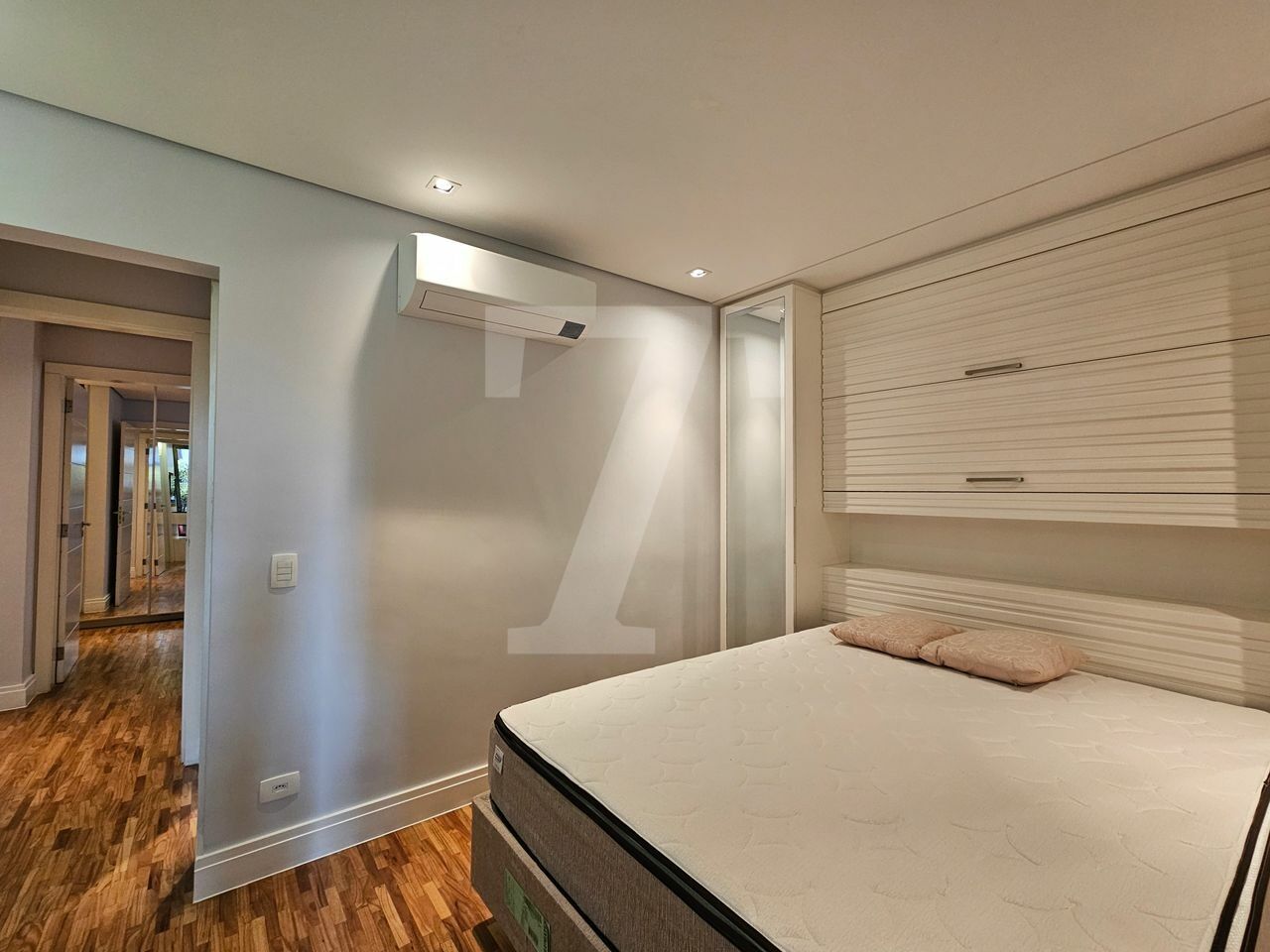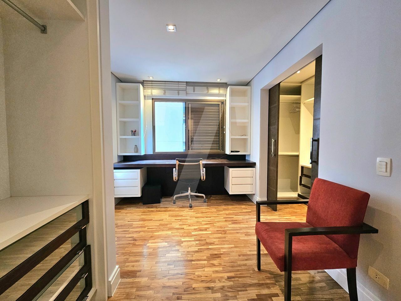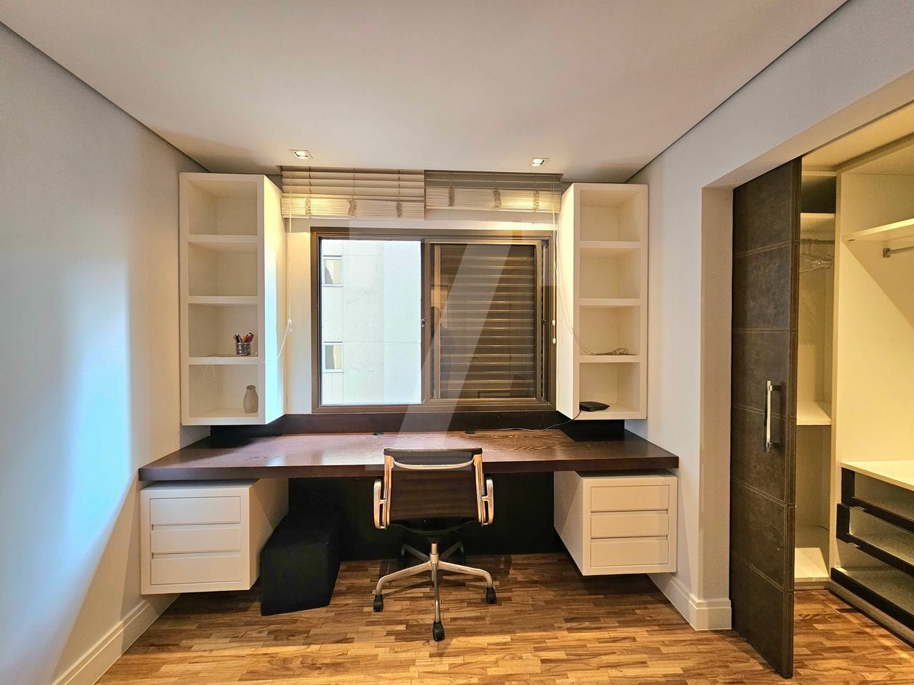Na área íntima, o piso em madeira traz aconchego. A suíte máster possui dois closets, um escritório, varanda privativa e ar-condicionado. A segunda suíte também conta com varanda.