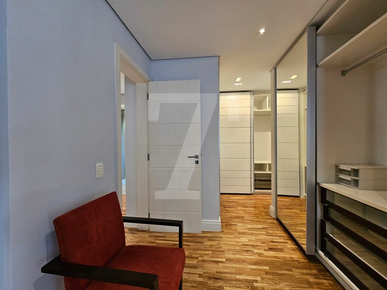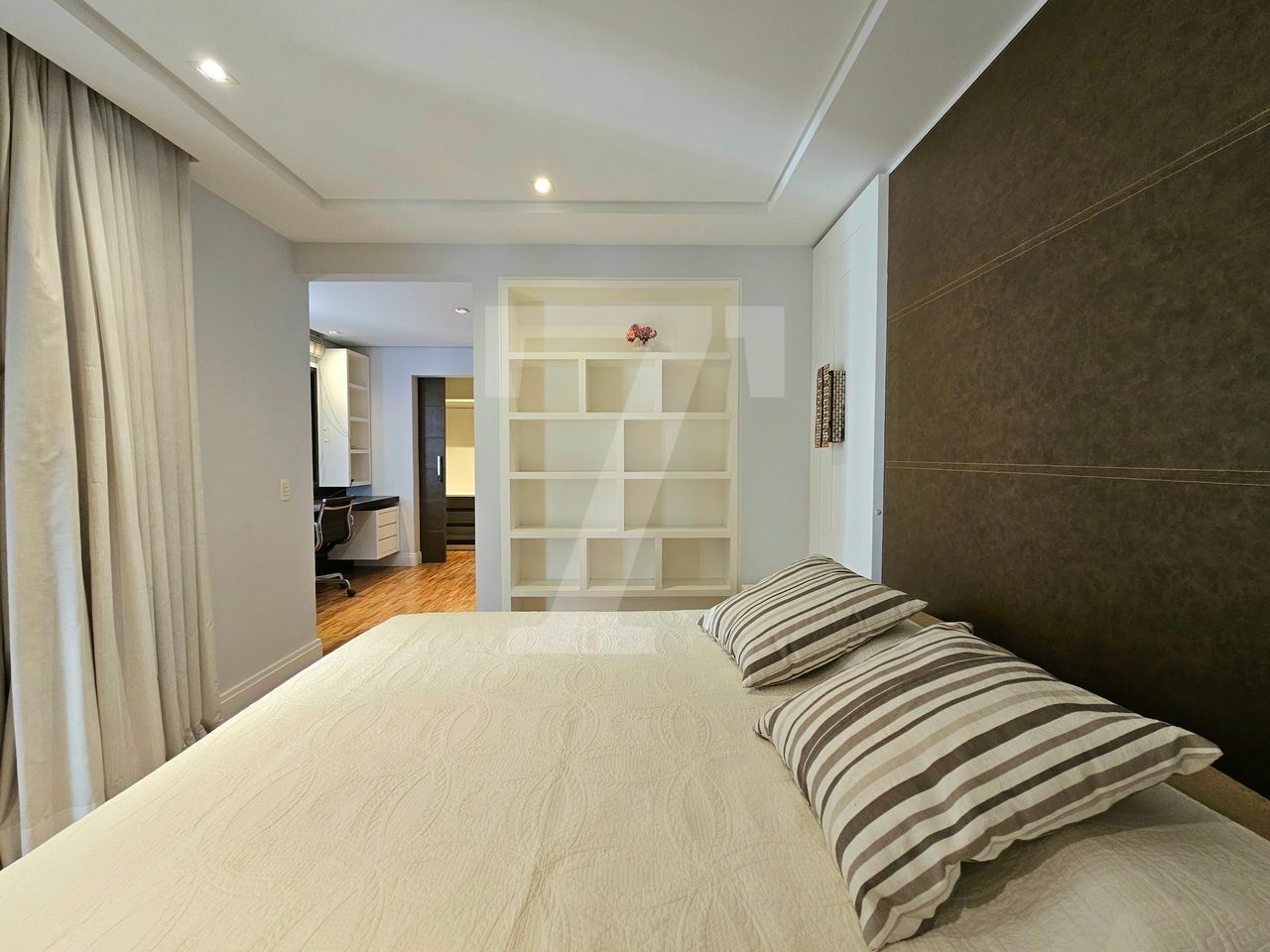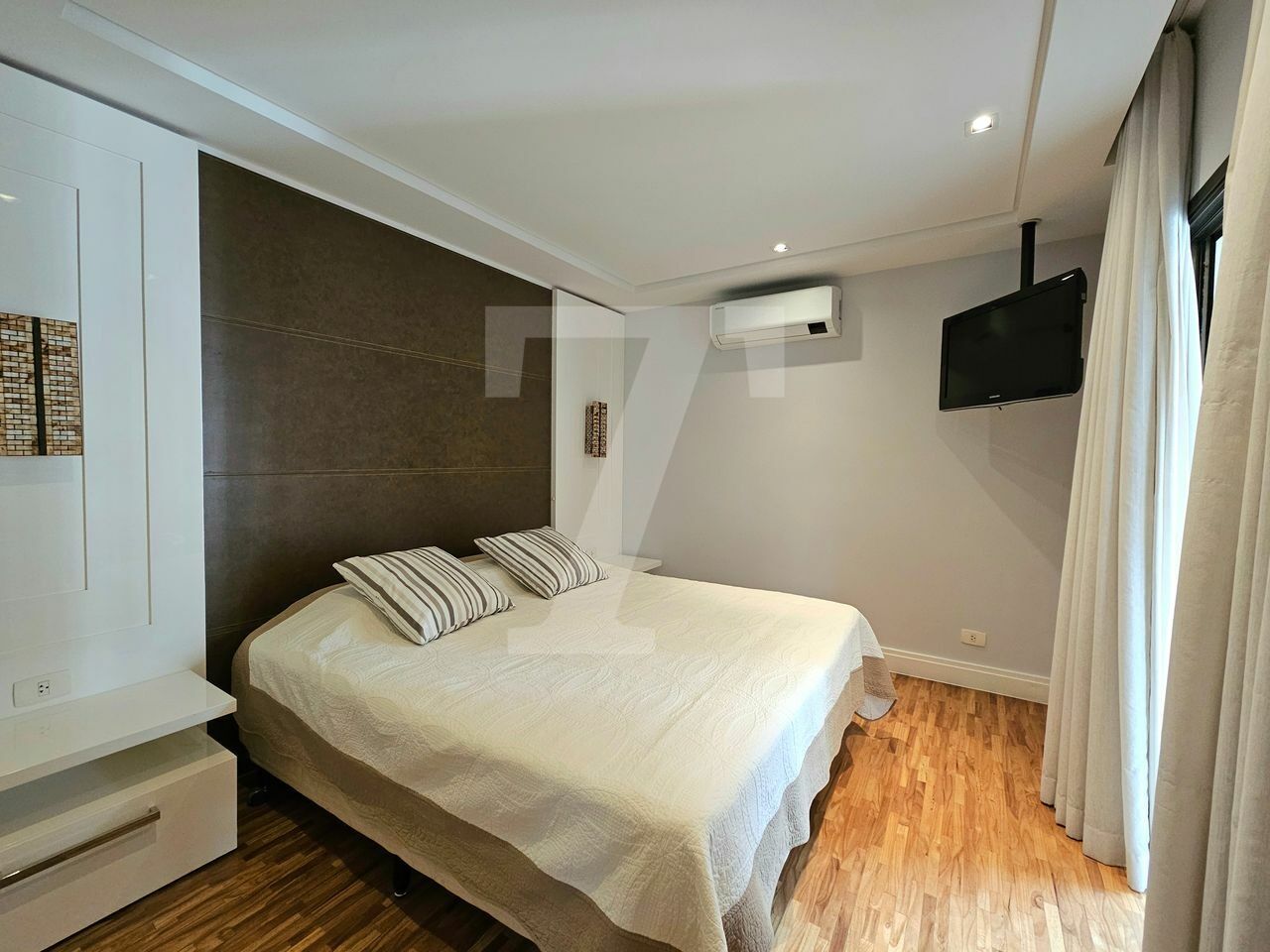 Na área íntima, o piso em madeira traz aconchego. A suíte máster possui dois closets, um escritório, varanda privativa e ar-condicionado. A segunda suíte também conta com varanda.
