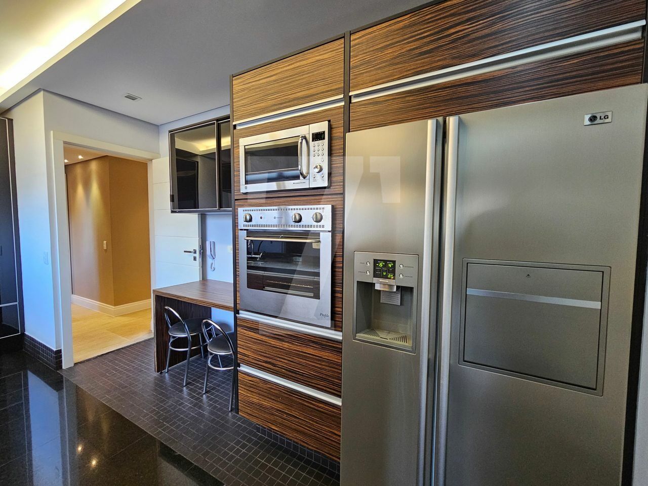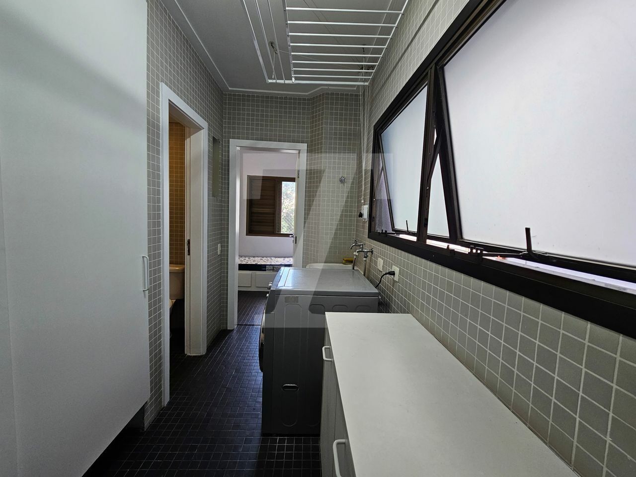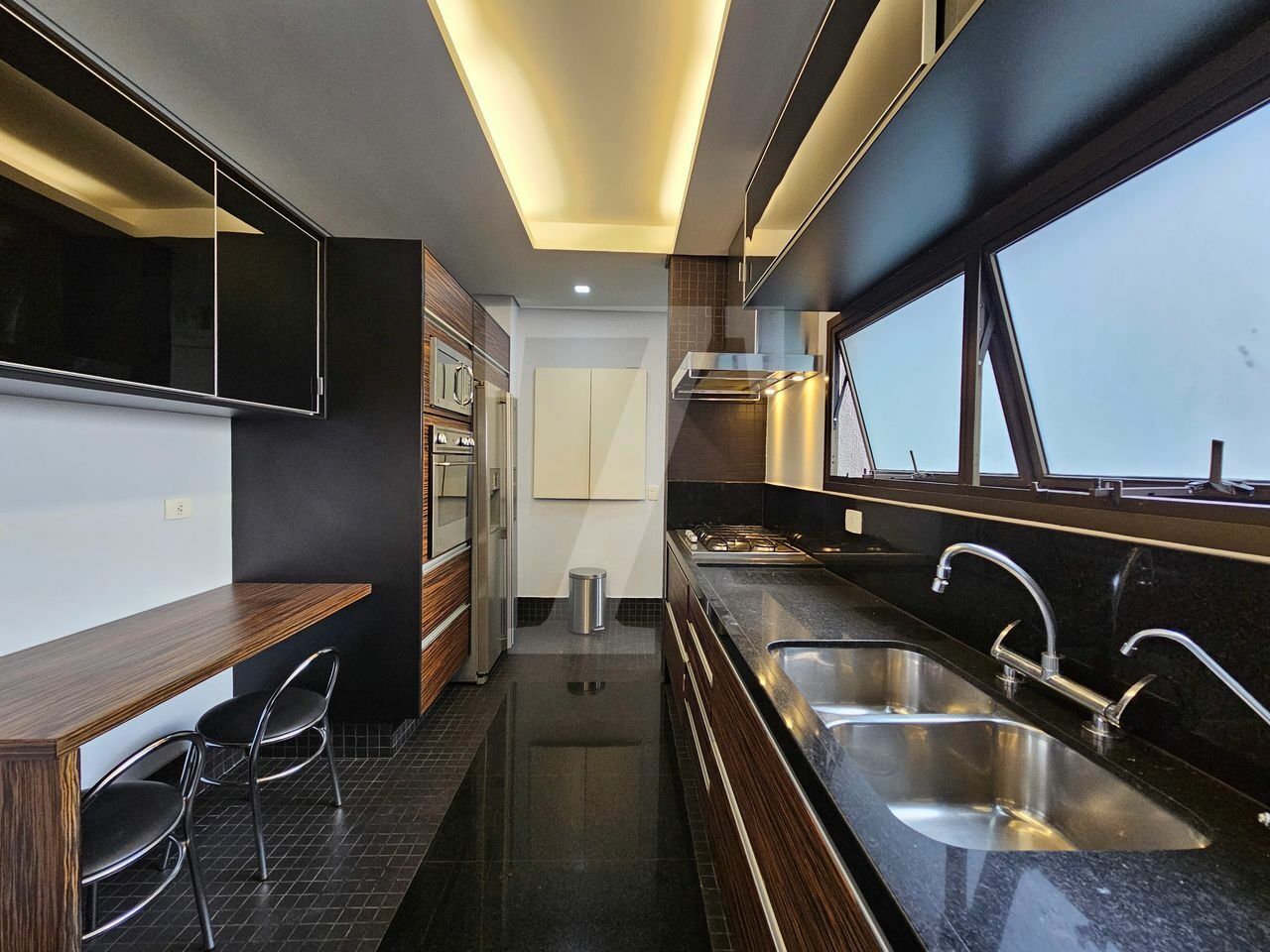 A cozinha é espaçosa, com janelões, muitos armários, eletrodomésticos em aço inox e utensílios e louça. A área de serviço conta com lavanderia ampla e quarto de serviço já montado com cama e armários, além de banheiro, ideal para quem possui funcionária que dorme no local.