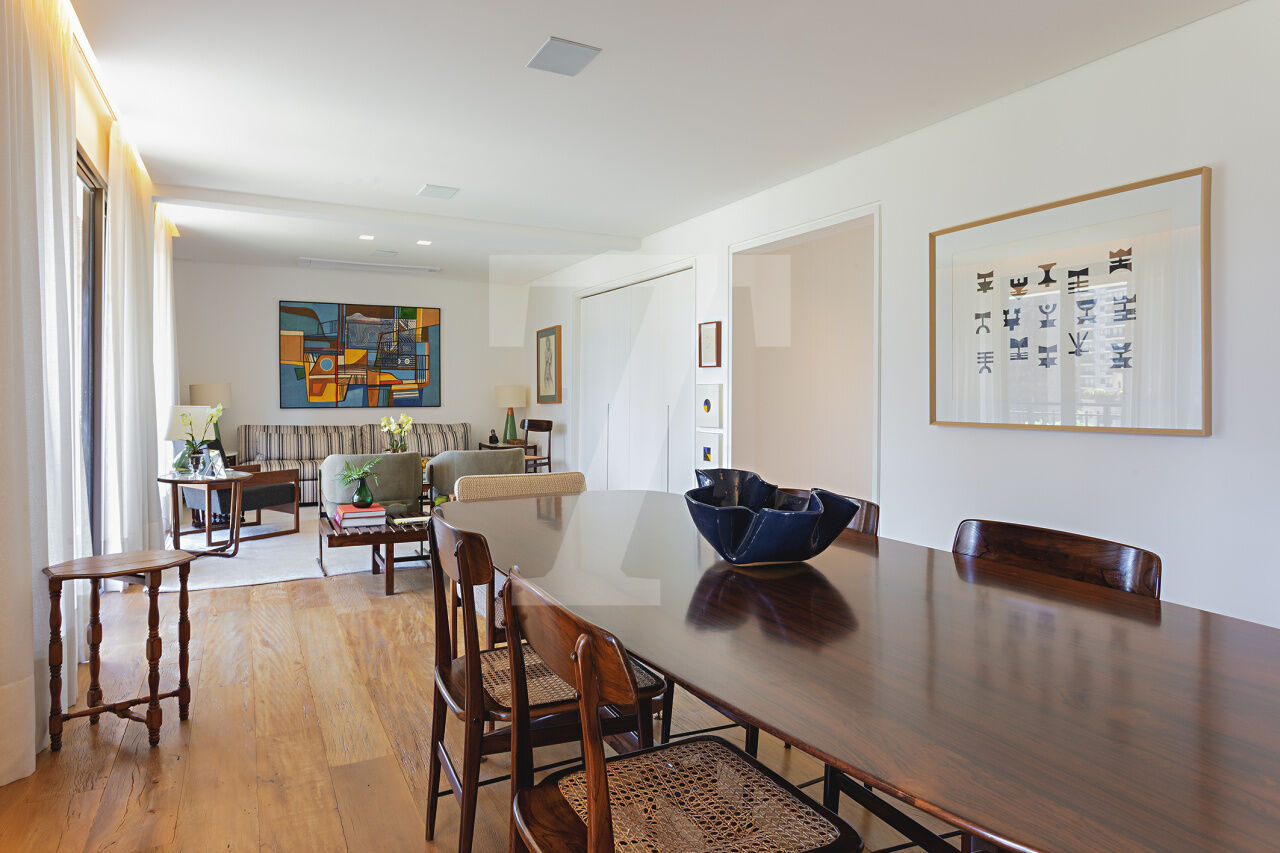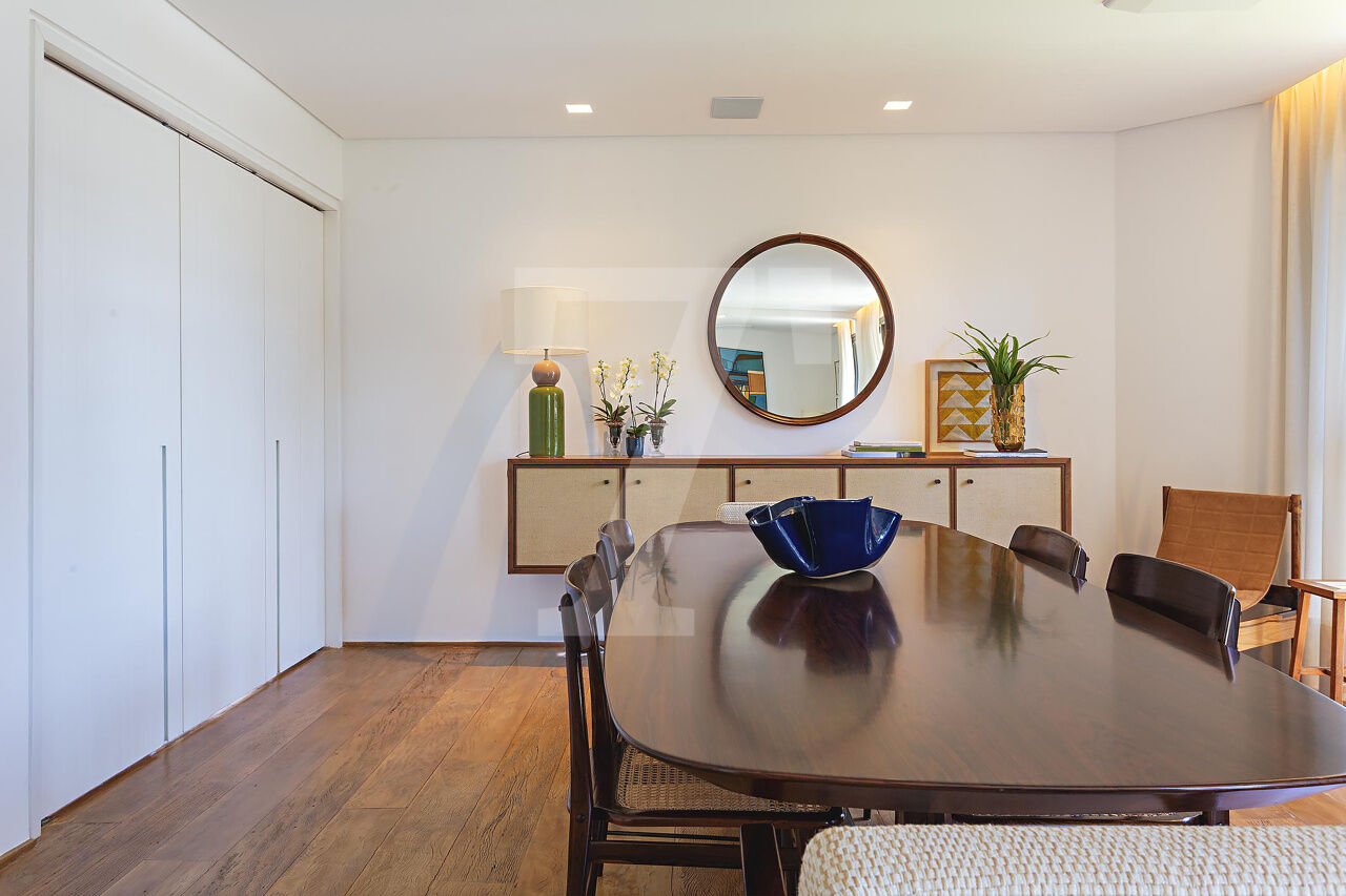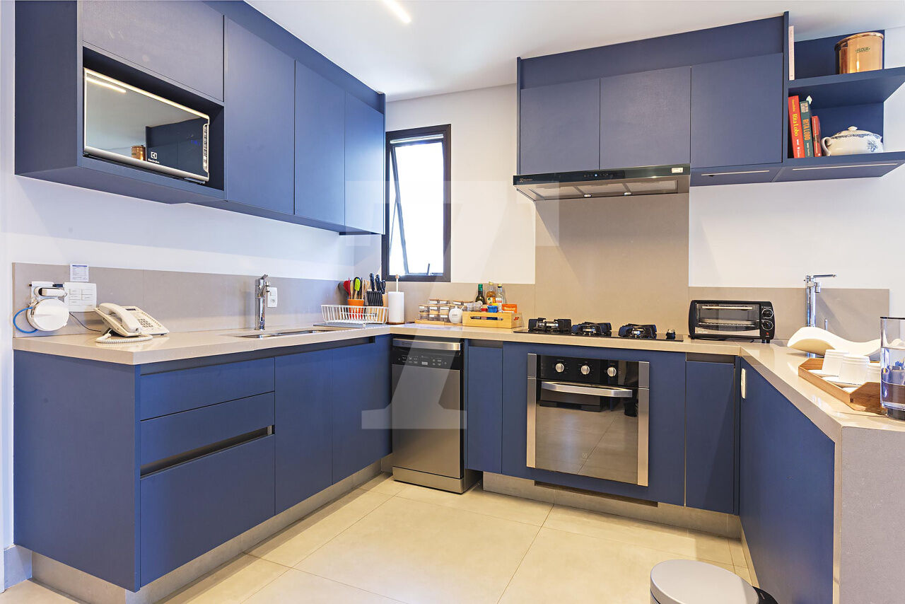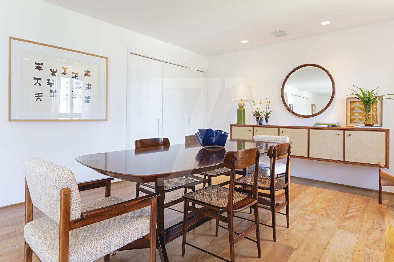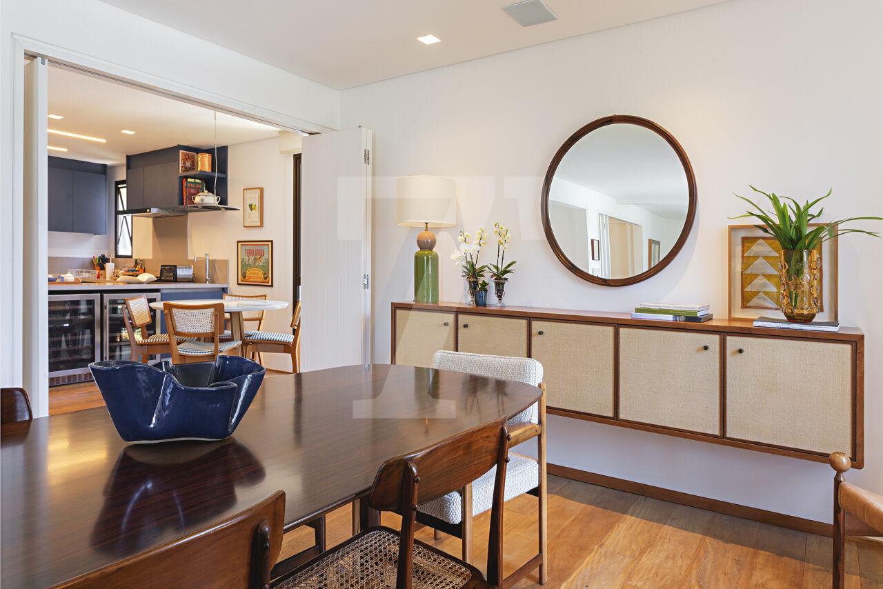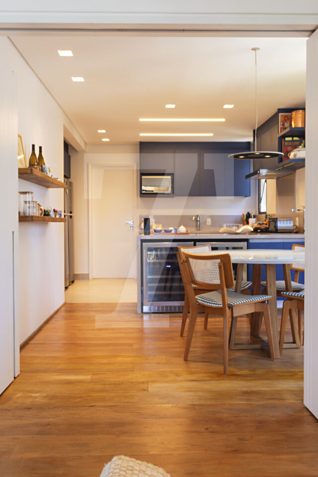Este é o tipo de apartamento que conquista no primeiro olhar. A luz entra generosa, realça a marcenaria elegante e cria uma atmosfera leve, sofisticada, pronta para viver. A sala integra estar e jantar com naturalidade, espaçosa, acolhedora e perfeita para receber com charme. A cozinha, ampla e funcional, conversa com o todo: estética impecável, circulação inteligente.