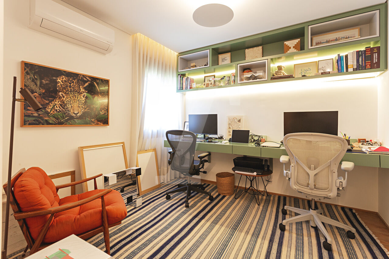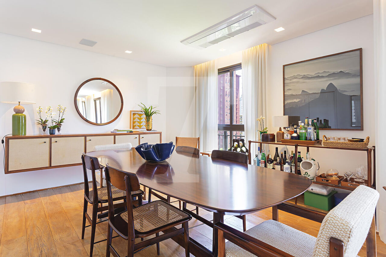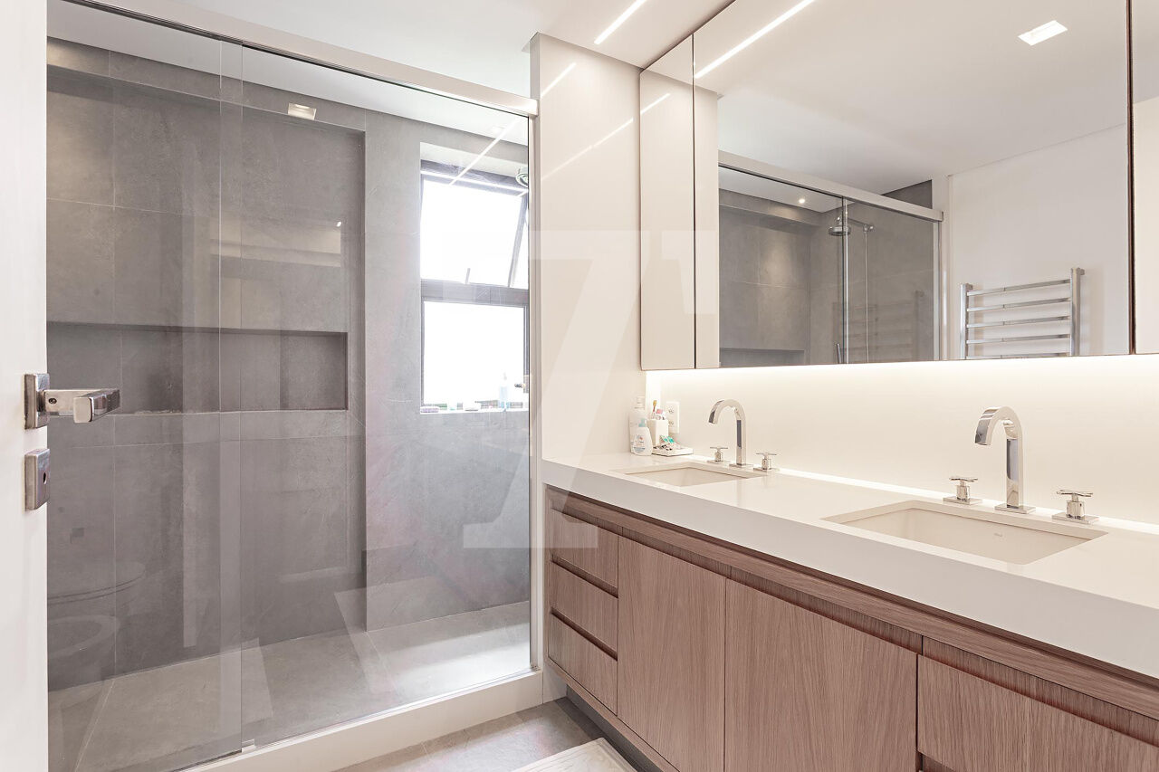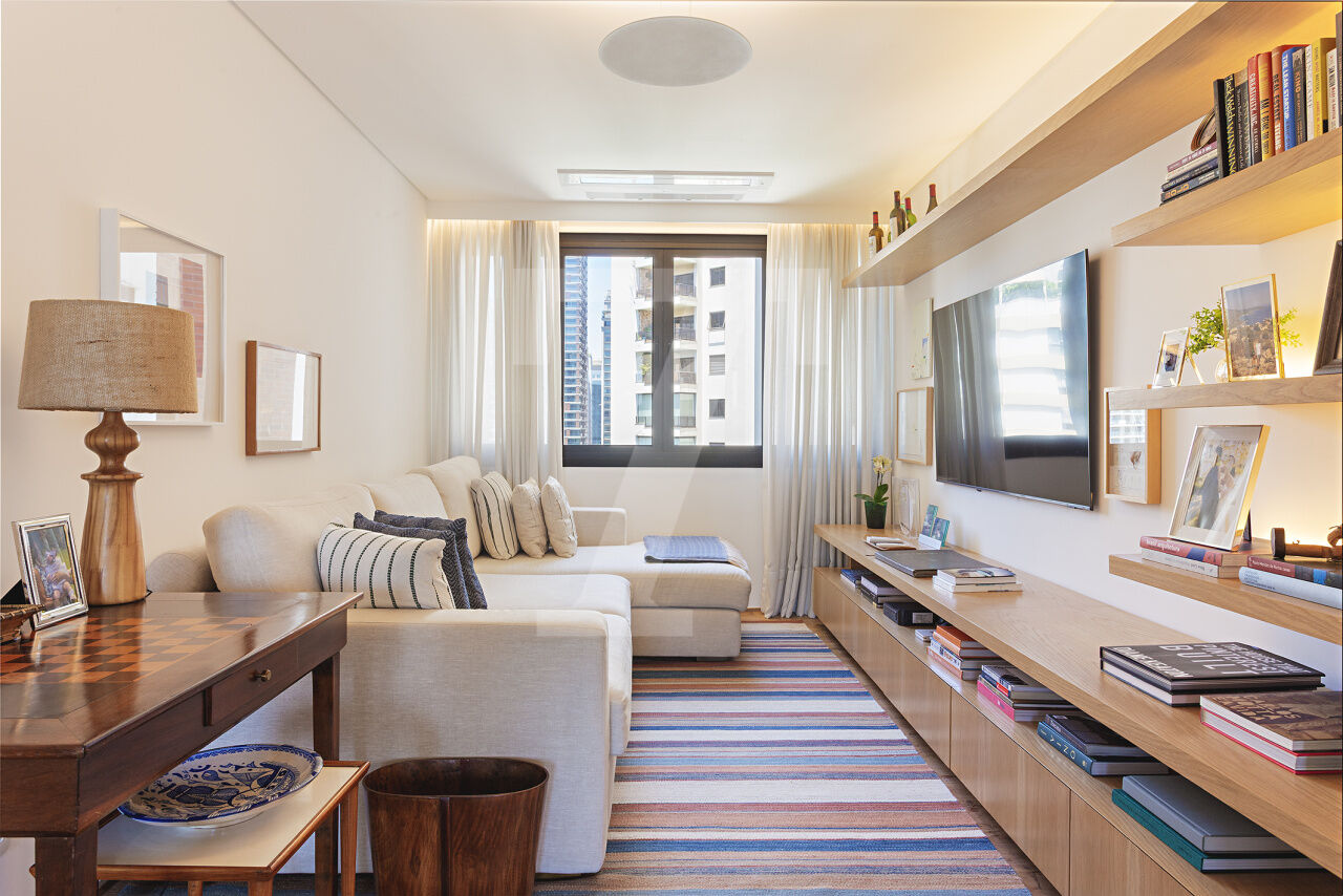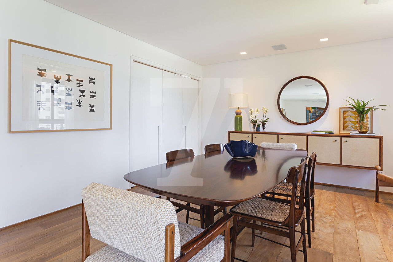 Este é o tipo de apartamento que conquista no primeiro olhar. A luz entra generosa, realça a marcenaria elegante e cria uma atmosfera leve, sofisticada, pronta para viver. A sala integra estar e jantar com naturalidade, espaçosa, acolhedora e perfeita para receber com charme. A cozinha, ampla e funcional, conversa com o todo: estética impecável, circulação inteligente.