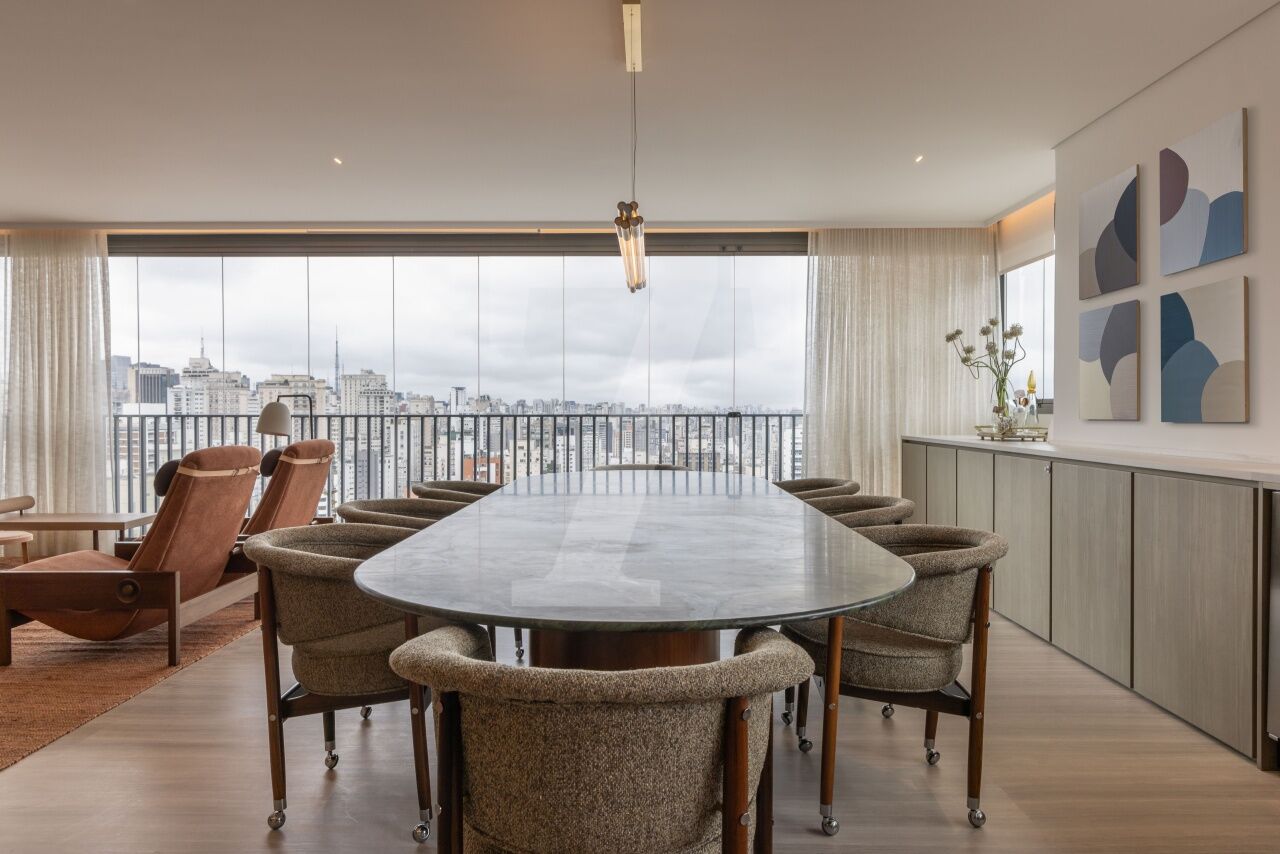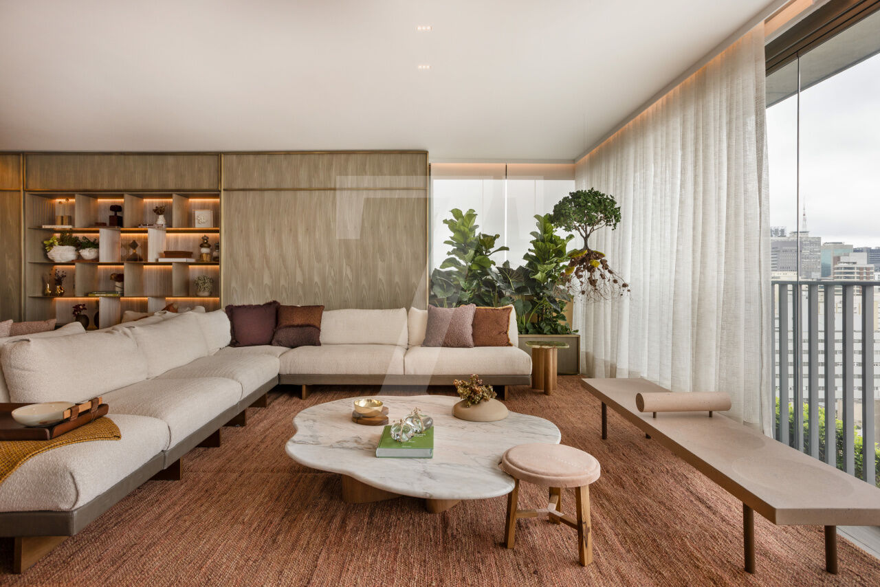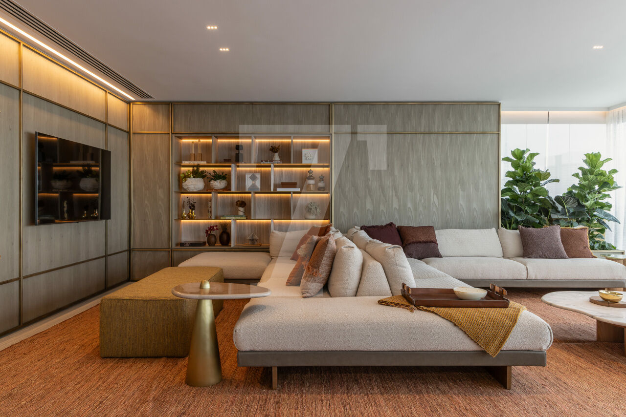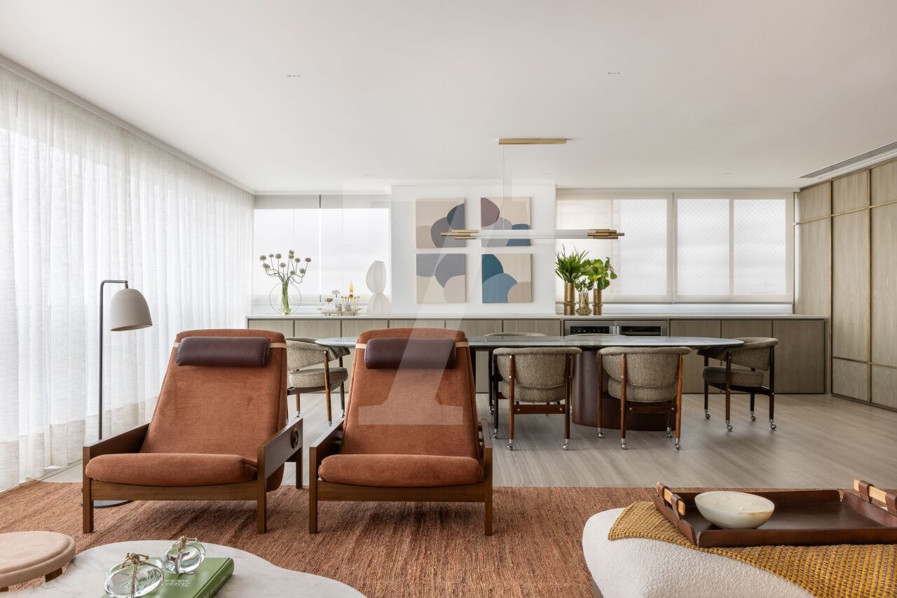 A paleta neutra, os materiais nobres e o mobiliário cuidadosamente selecionado traduzem conforto, contemporaneidade e refinamento.