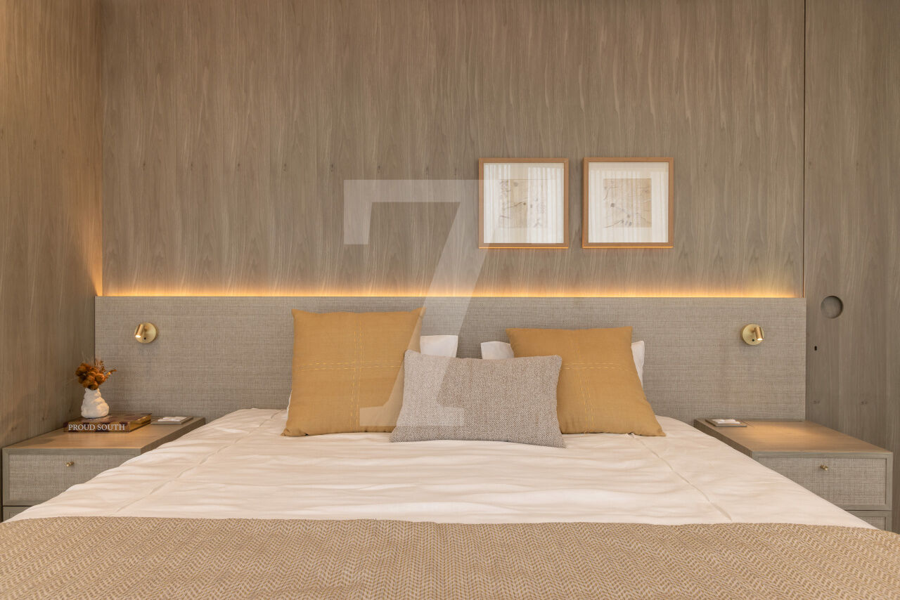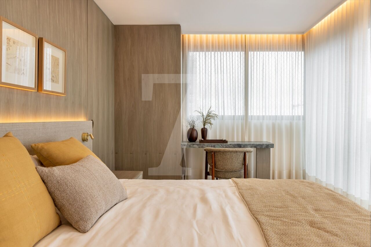 Na área íntima, os dormitórios mantêm o mesmo nível de excelência, com marcenaria sob medida, iluminação bem planejada e sensação de aconchego.