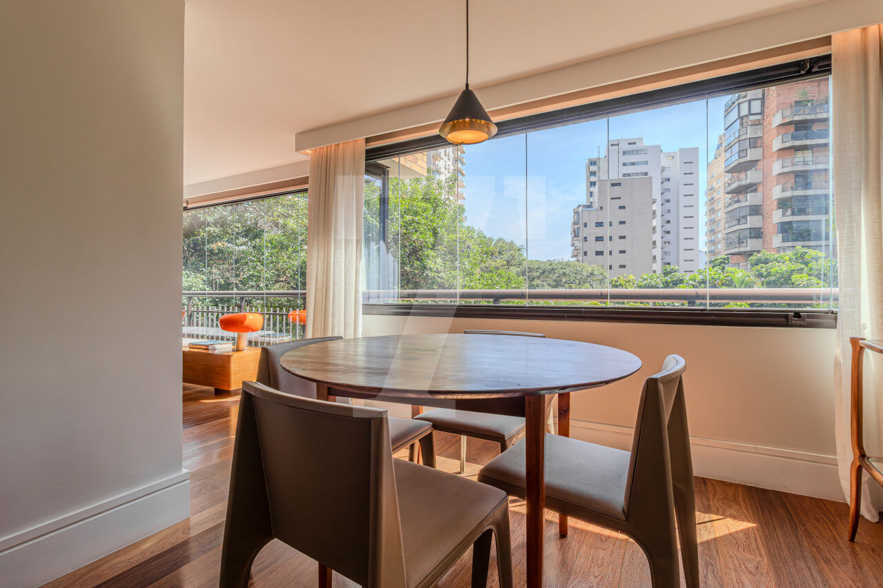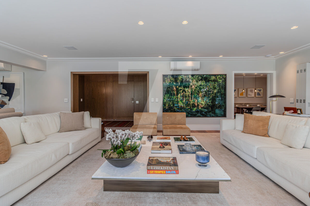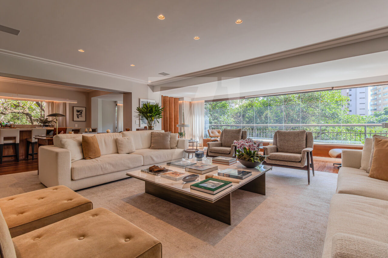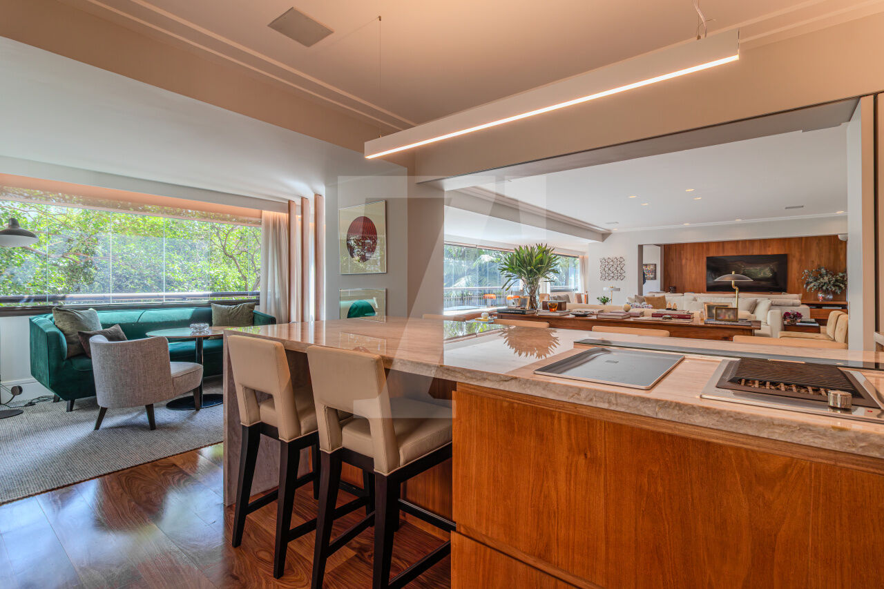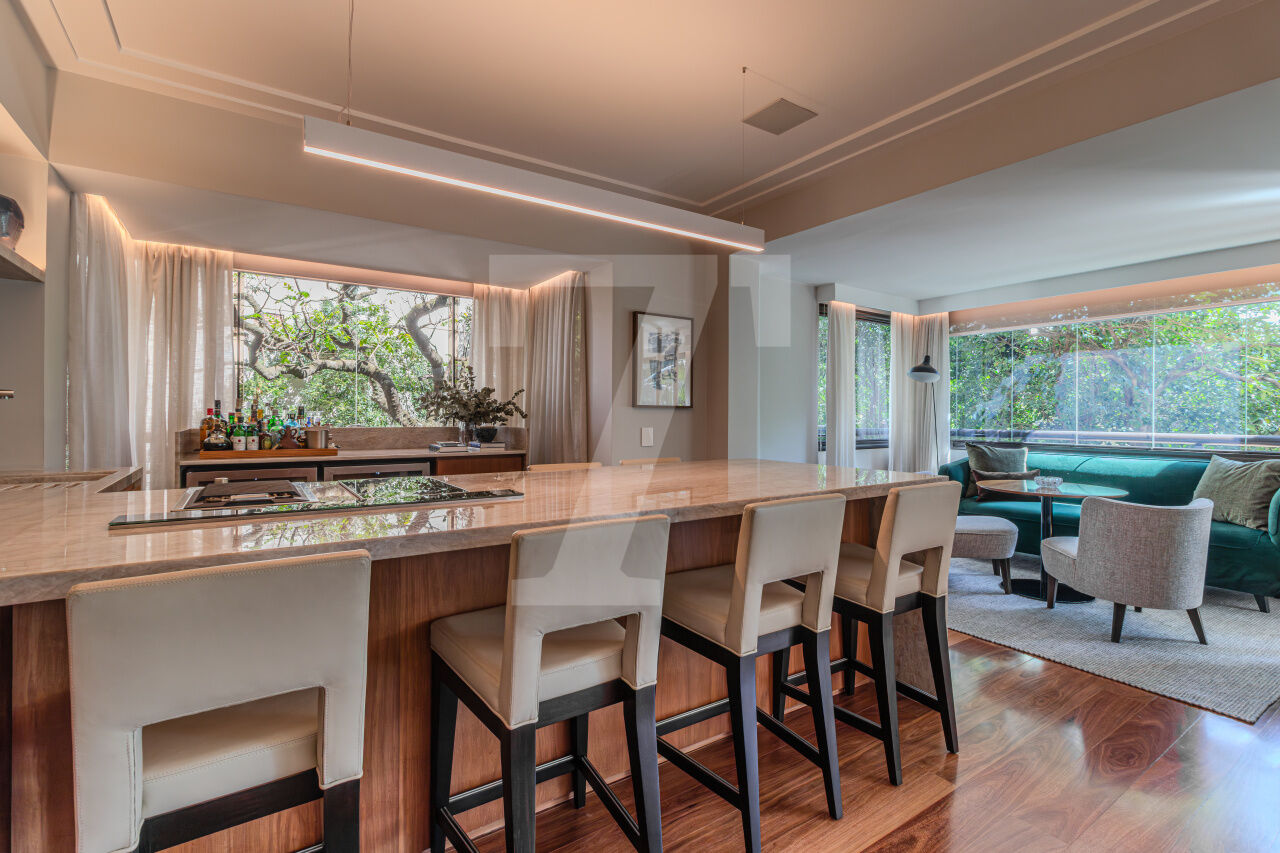 Com vista para o Clube Pinheiros e reforma assinada pelo escritório Nougalli + Serai, este apartamento à venda e locação no Jardim Europa apresenta materialidades de primeira linha, como carvalho americano, cabreúva e mármore Taj Mahal, sendo que a locação é feita toda mobiliada.