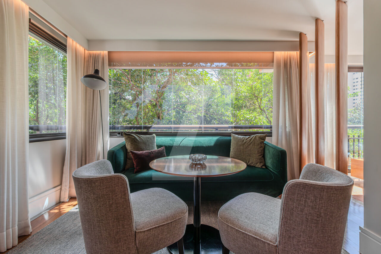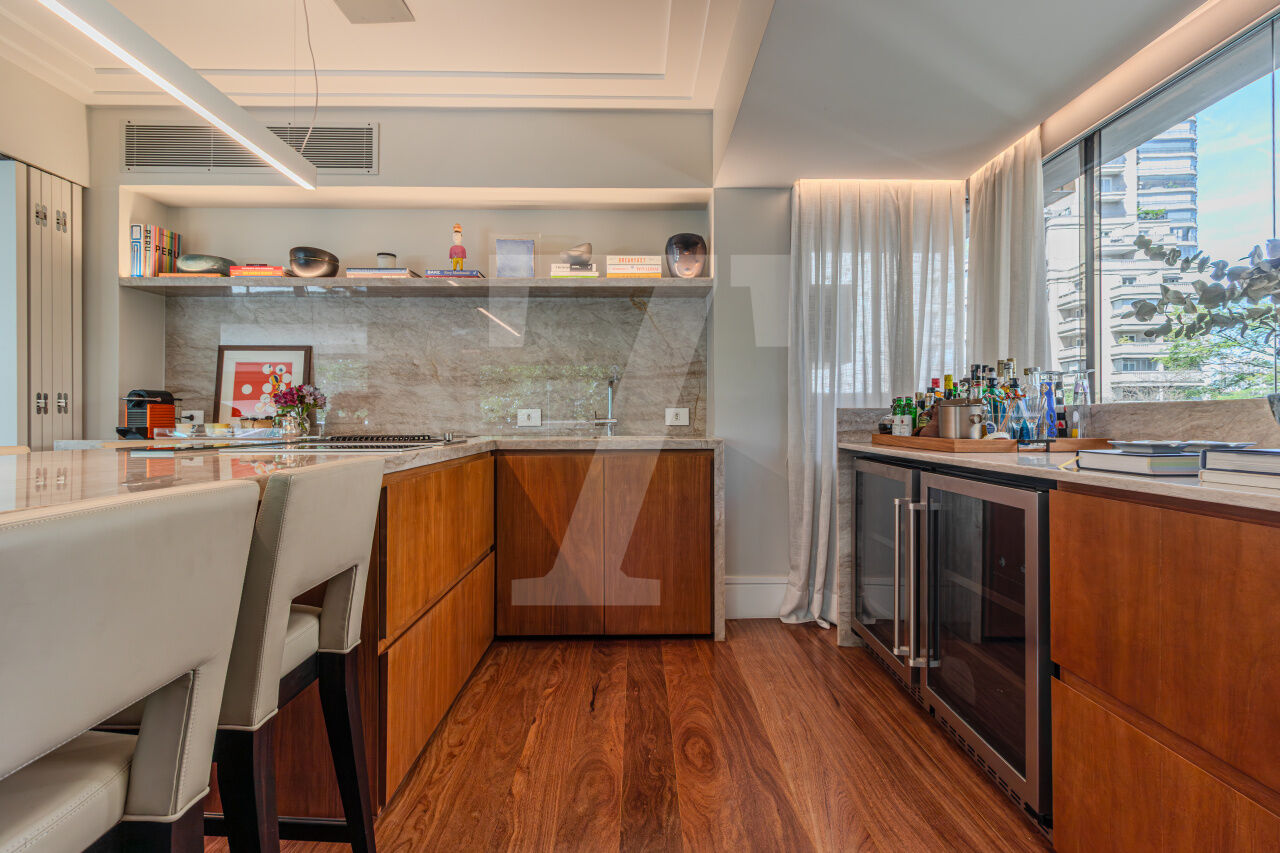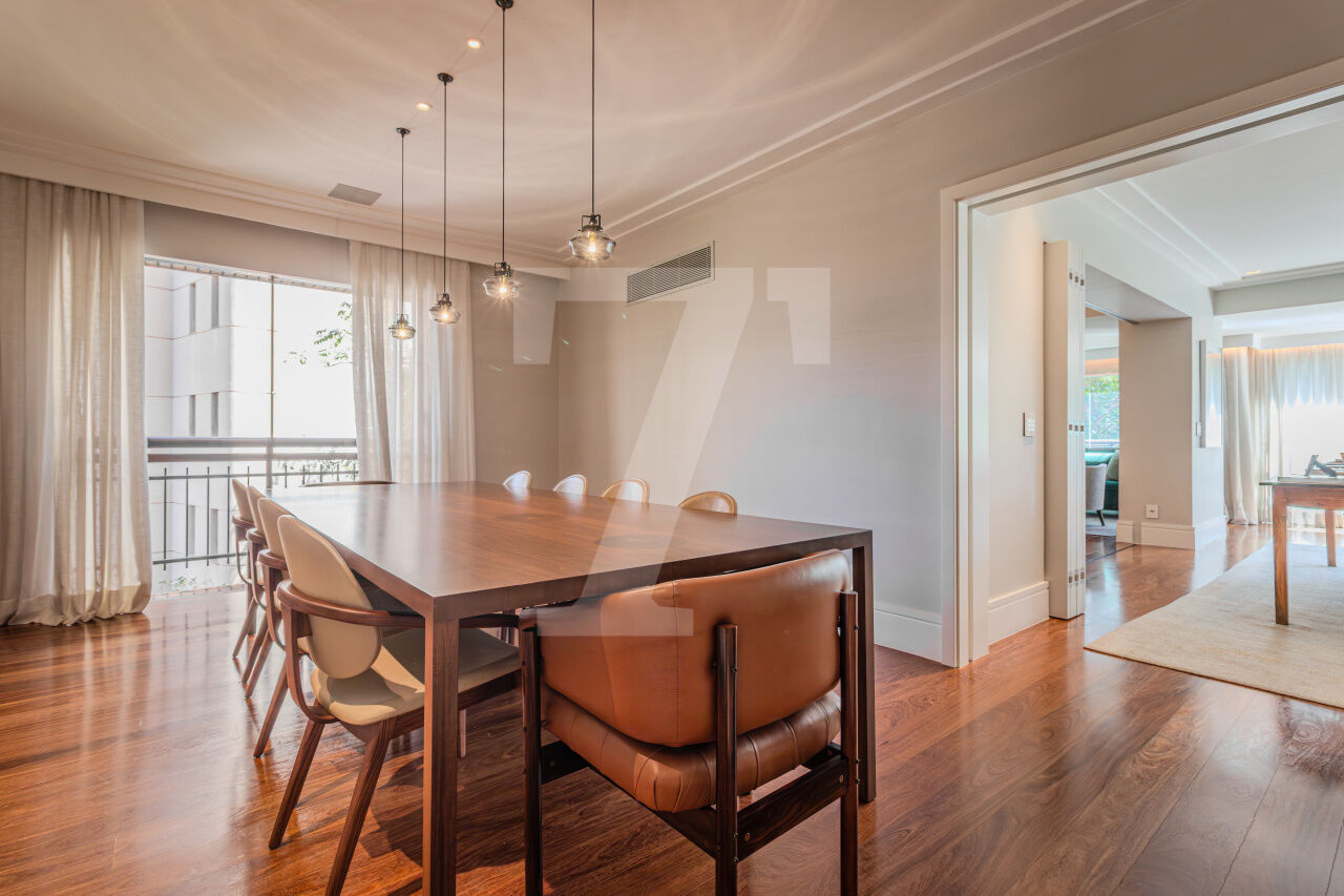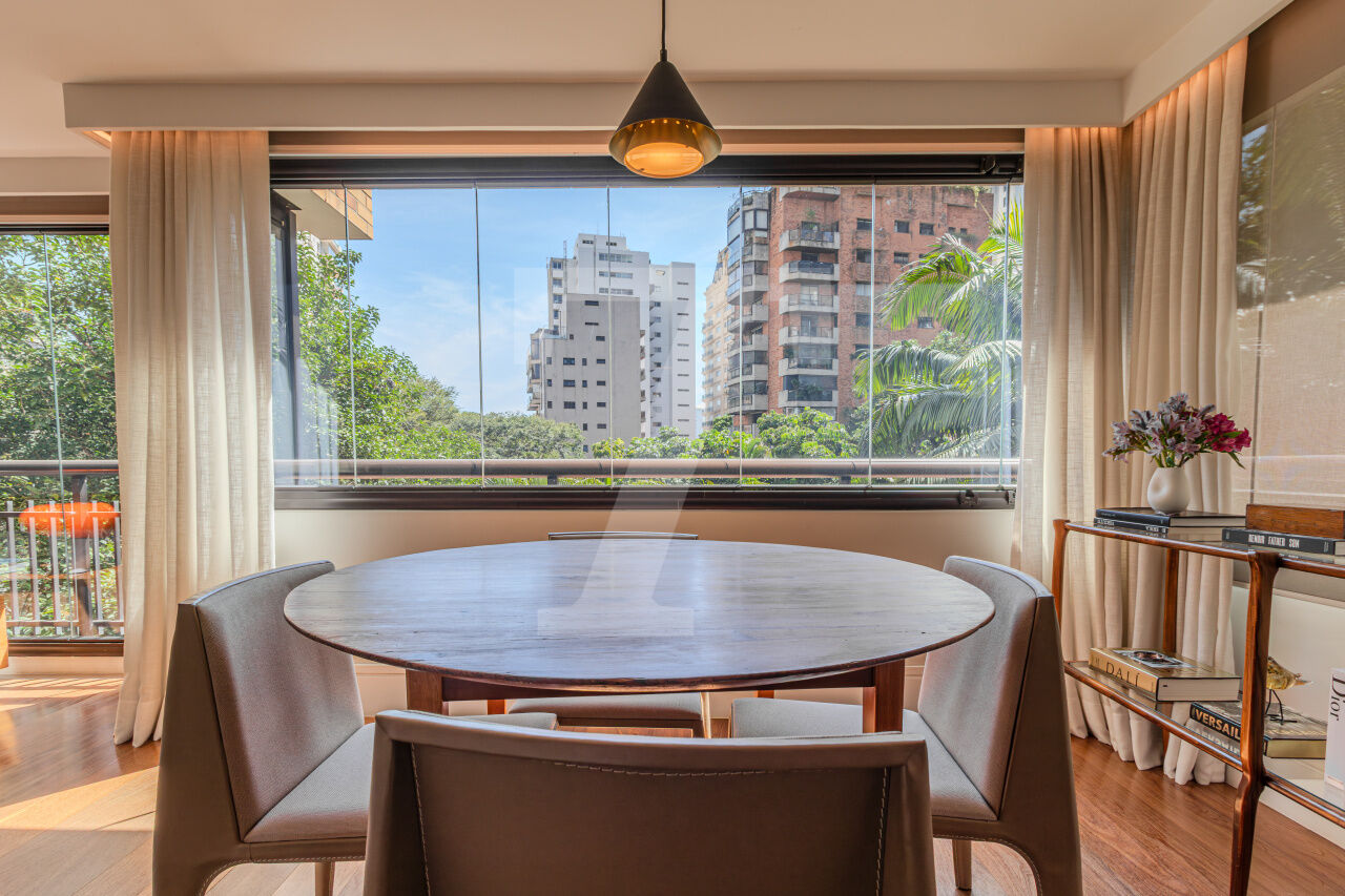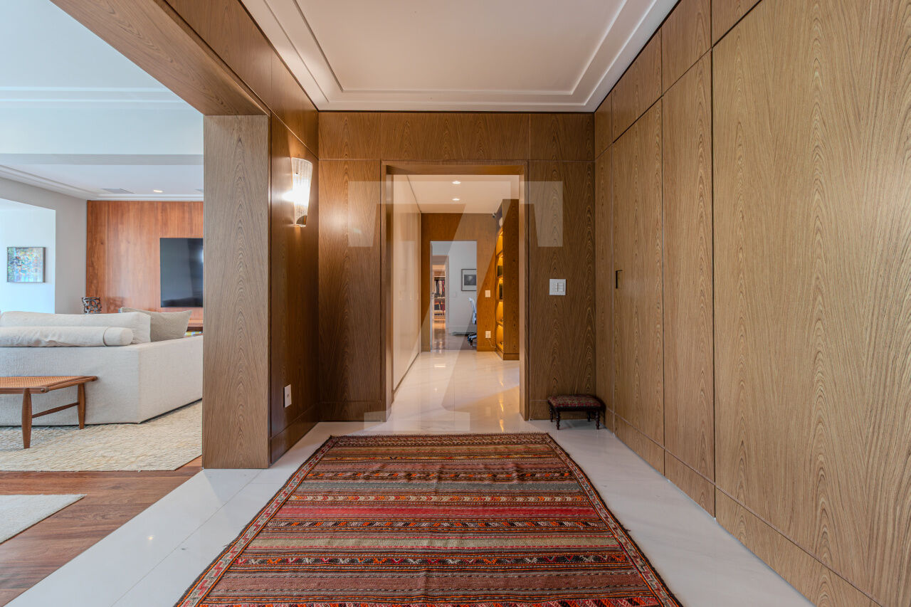 Com vista para o Clube Pinheiros e reforma assinada pelo escritório Nougalli + Serai, este apartamento à venda e locação no Jardim Europa apresenta materialidades de primeira linha, como carvalho americano, cabreúva e mármore Taj Mahal, sendo que a locação é feita toda mobiliada.