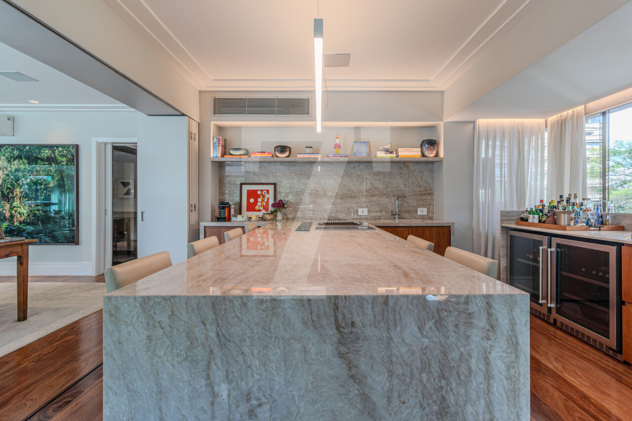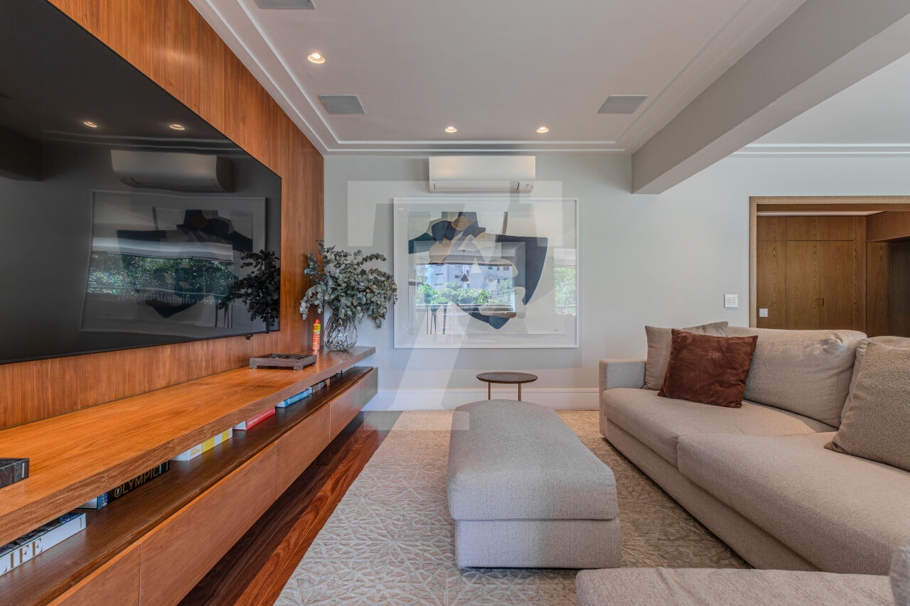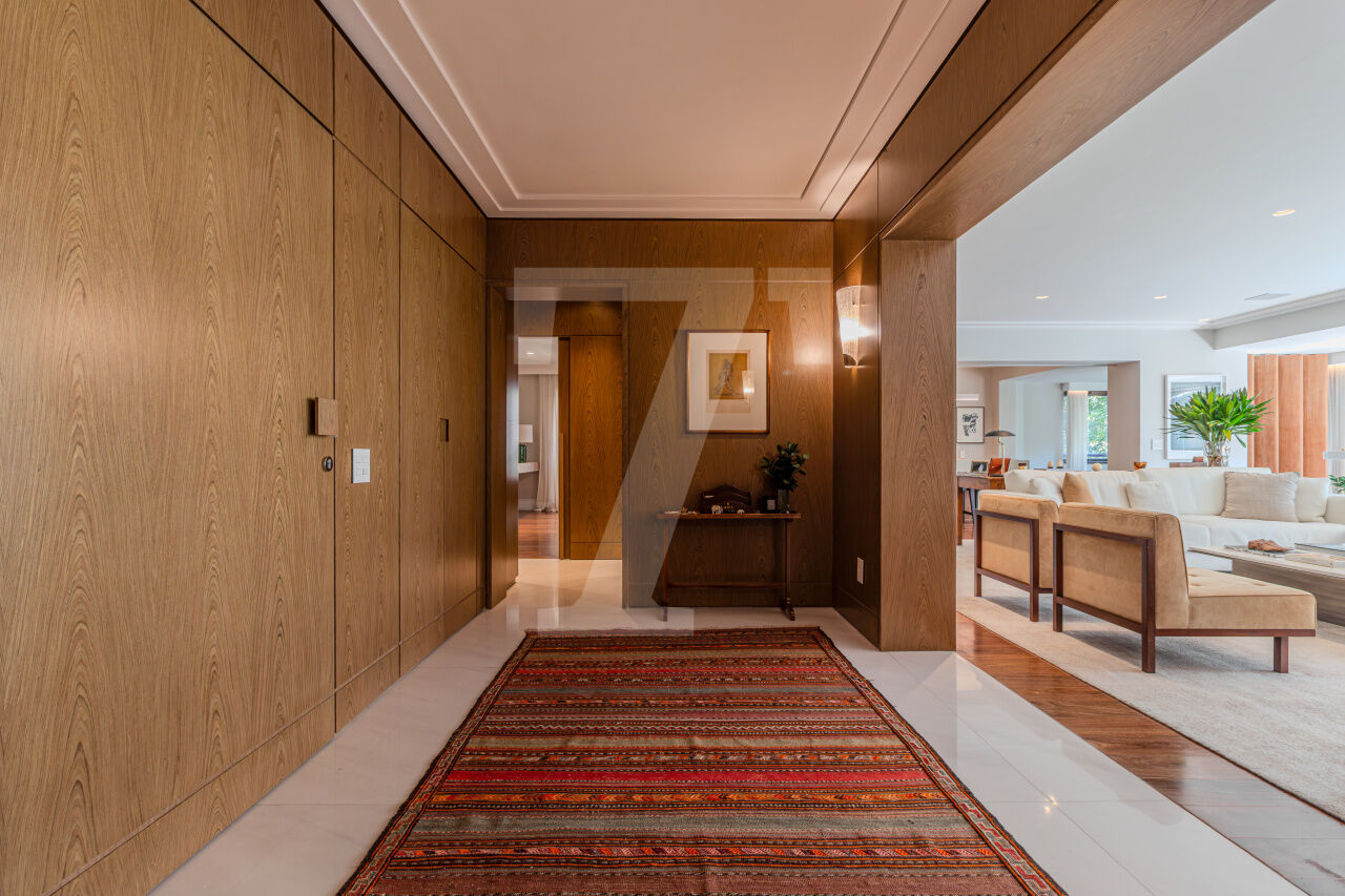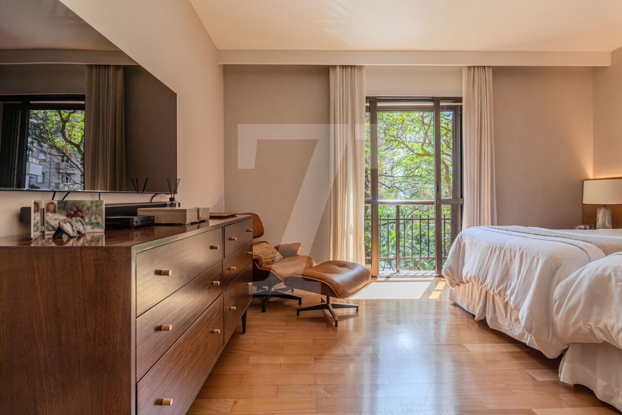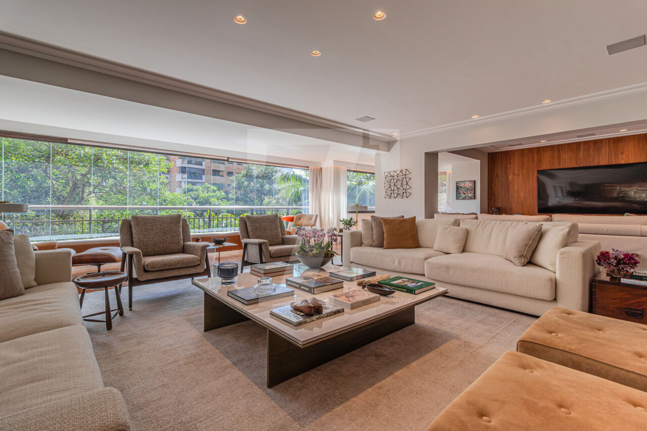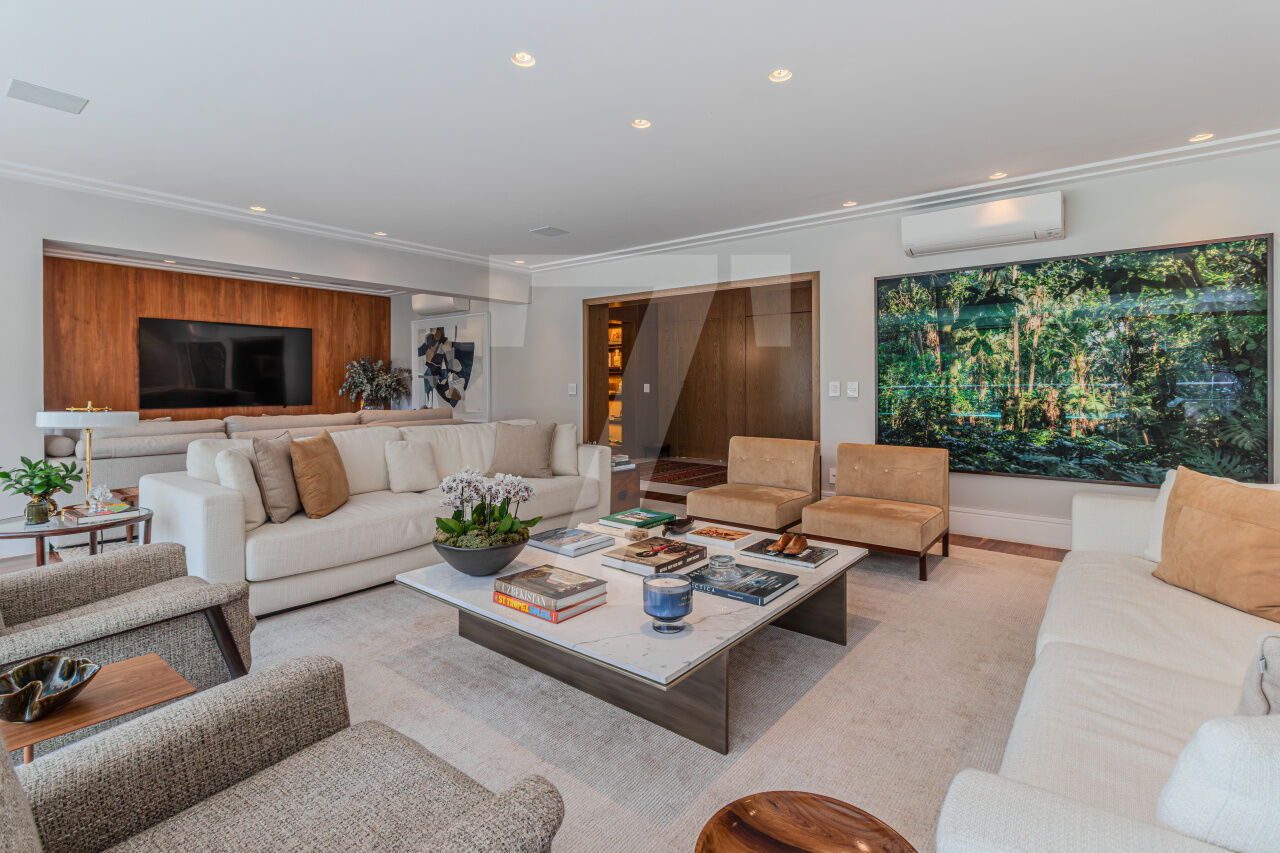Com vista para o Clube Pinheiros e reforma assinada pelo escritório Nougalli + Serai, este apartamento à venda e locação no Jardim Europa apresenta materialidades de primeira linha, como carvalho americano, cabreúva e mármore Taj Mahal, sendo que a locação é feita toda mobiliada.