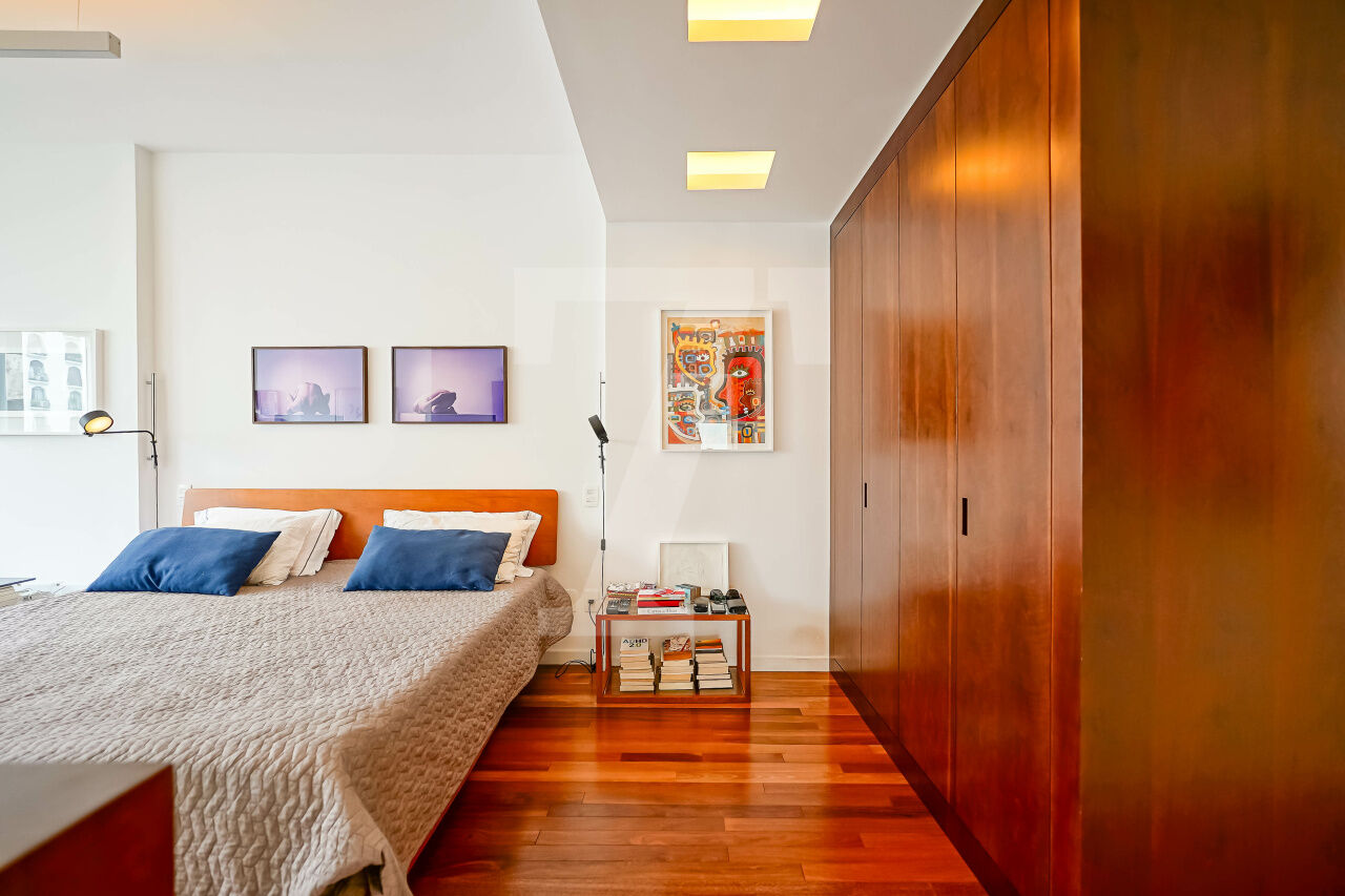 A suíte master é isolada, com closet e banheiro com dois chuveiros, criando um espaço confortável. Do outro lado, uma segunda suíte e mais um quarto garantem versatilidade. O prédio recuado da rua oferece uma vista rara no Jardins, e o fato de ocupar o andar inteiro reforça a sensação de conforto.