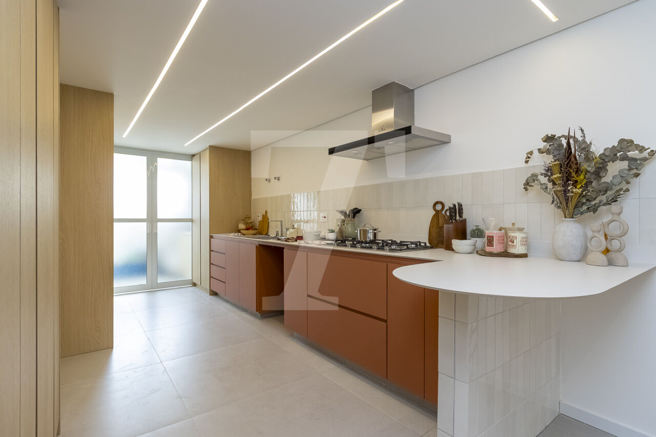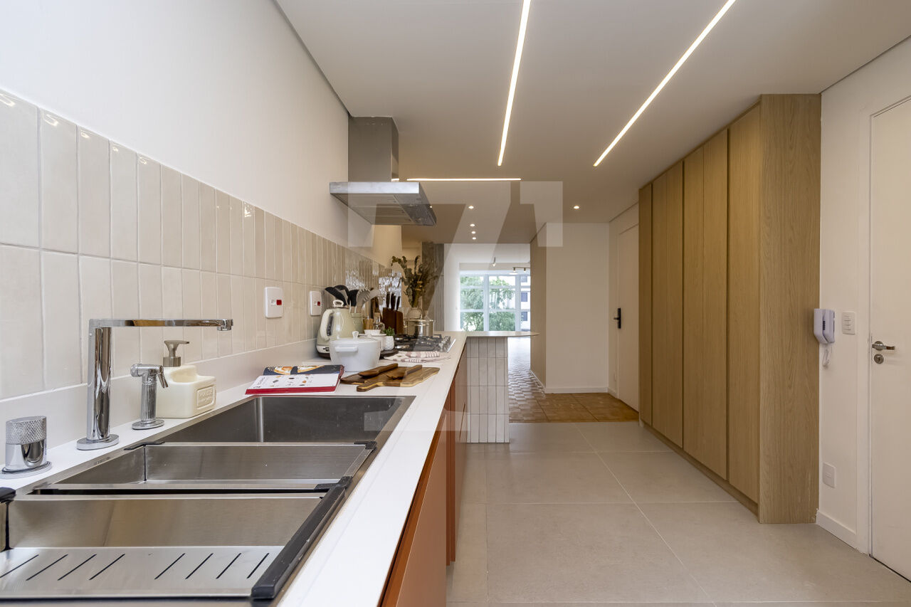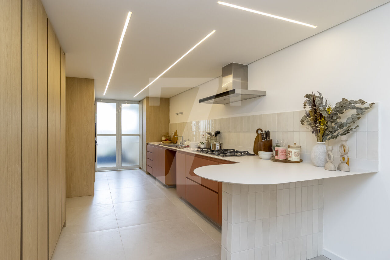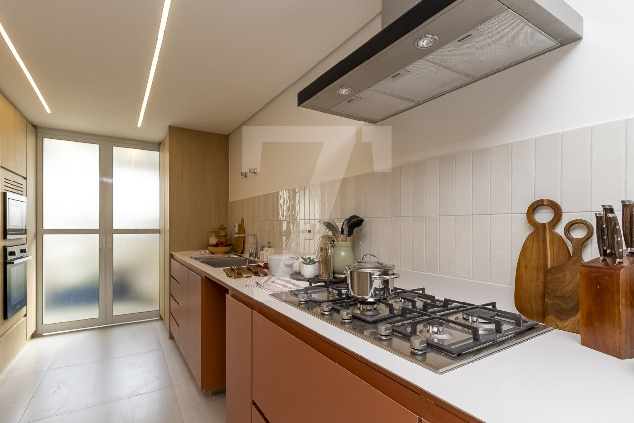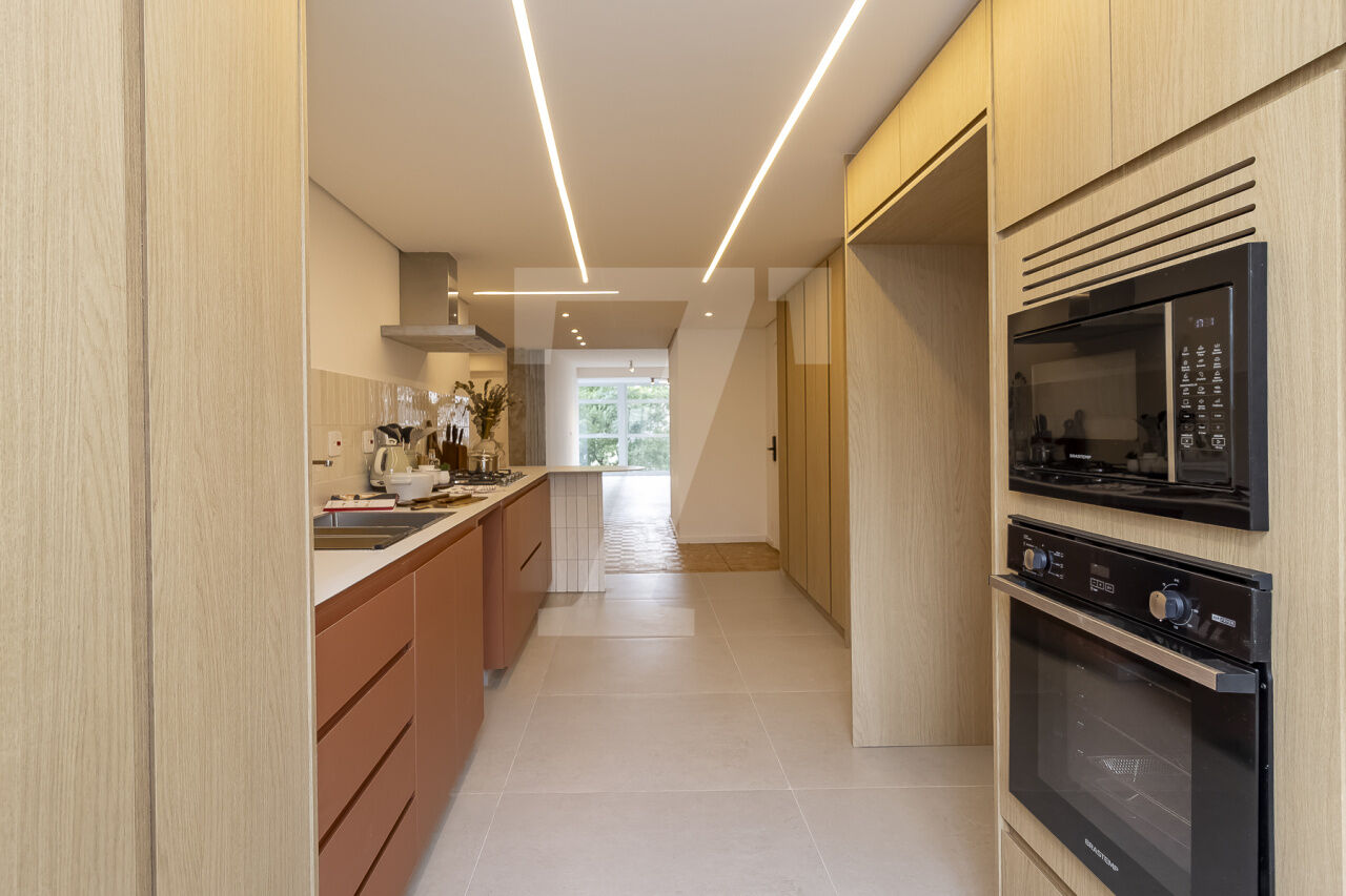 Cozinha completa, com eletrodomésticos e armários em estilo moderno, e área de serviço.