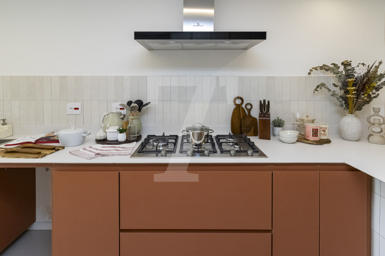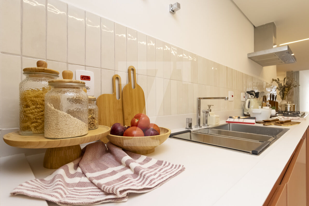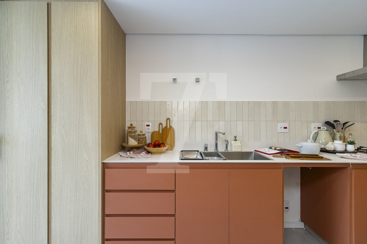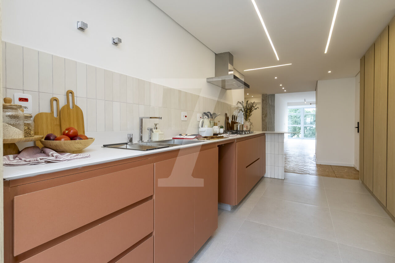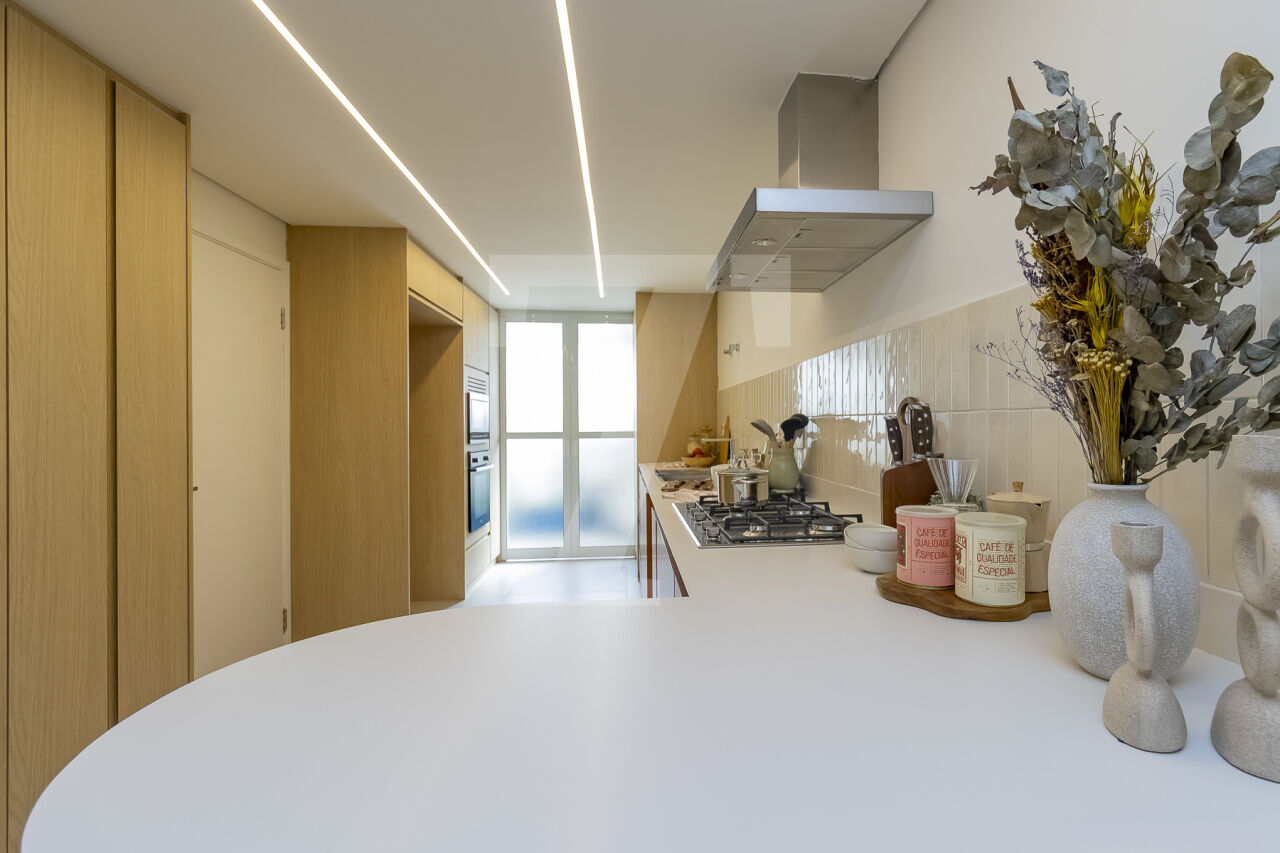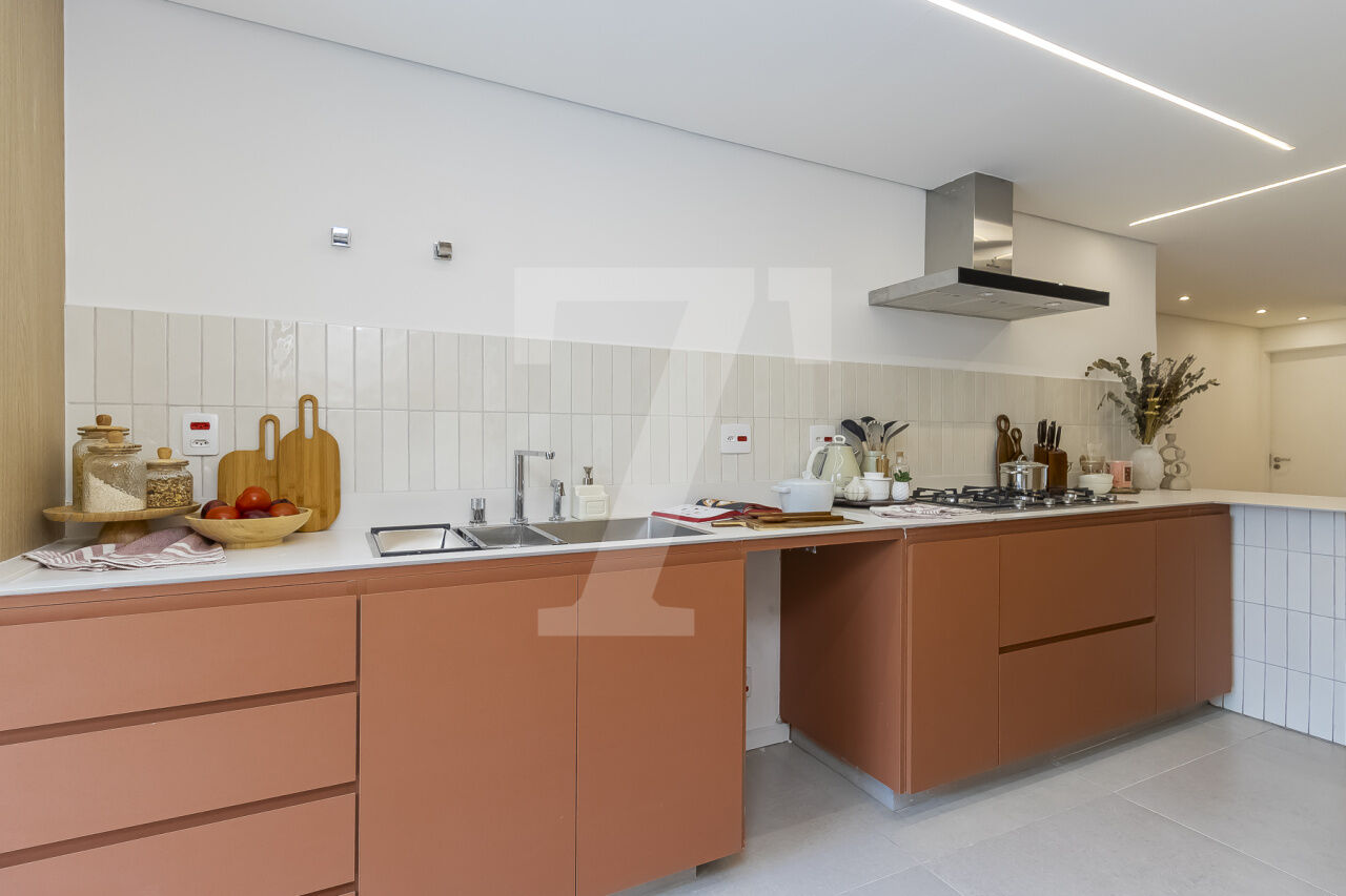 Cozinha completa, com eletrodomésticos e armários em estilo moderno, e área de serviço.