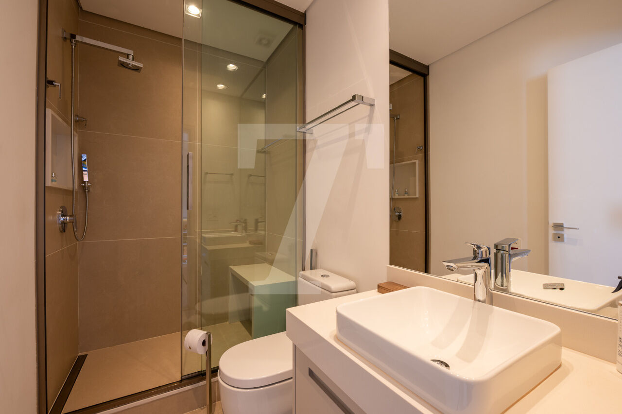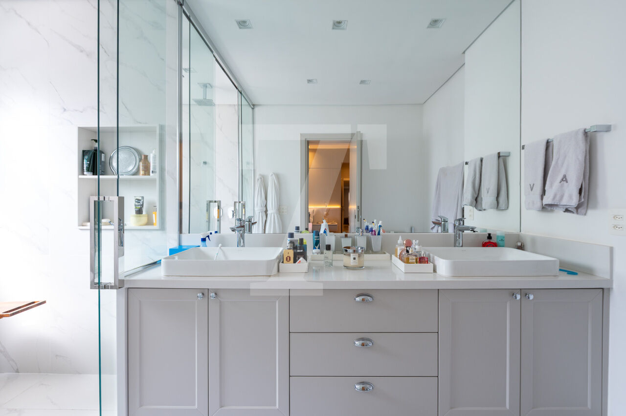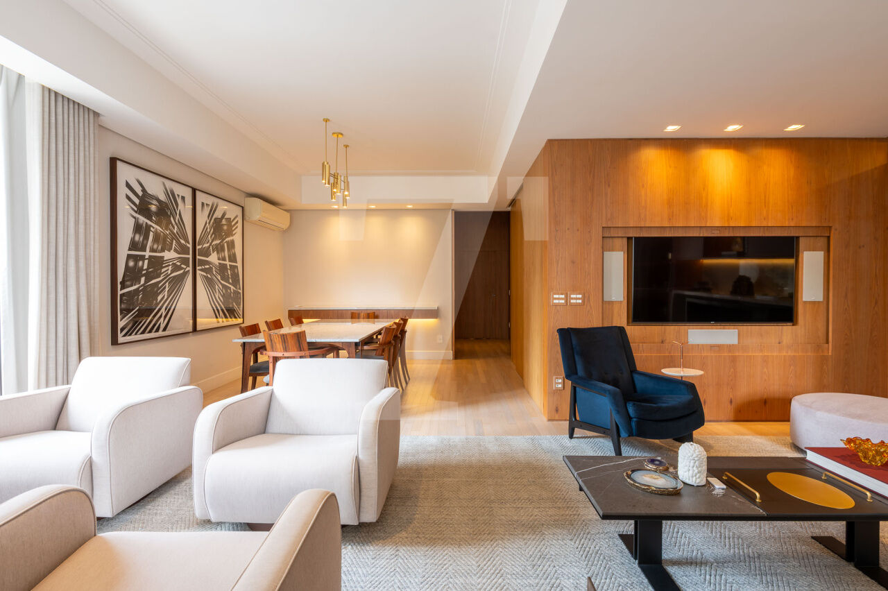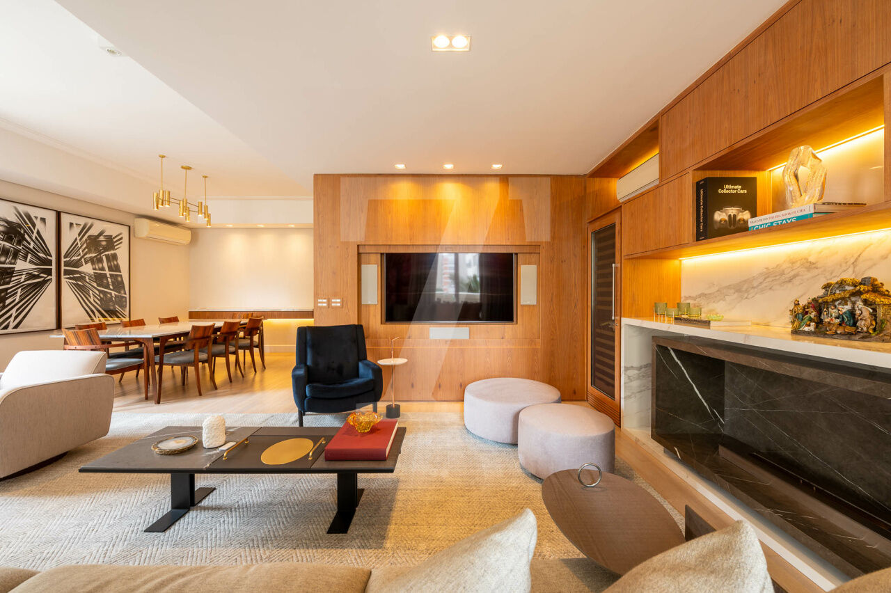 Forte aplauso para o equilíbrio sofisticado entre texturas e materiais. O assoalho em madeira tauari nas áreas sociais e íntimas traz calor, aconchego, enquanto o porcelanato Munari Marfim nas áreas molhadas garante luminosidade, praticidade e um ar contemporâneo. A marcenaria Ornare desenha volumes limpos e elegantes, integrando armazenamento e estética com discrição, sem excessos. Nas louças e metais, a escolha por Deca e Hansgrohe reforça o cuidado com o toque, o conforto no uso e a durabilidade - são detalhes que não aparecem à primeira vista, mas fazem diferença no dia a dia e falam diretamente com quem entende.