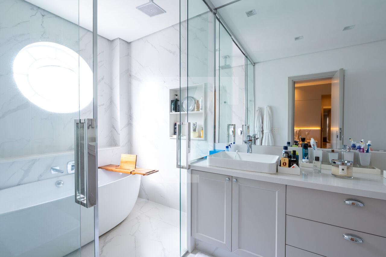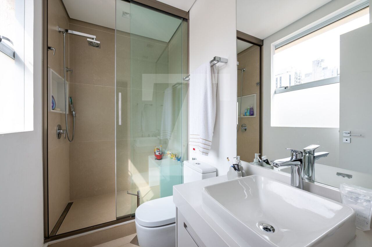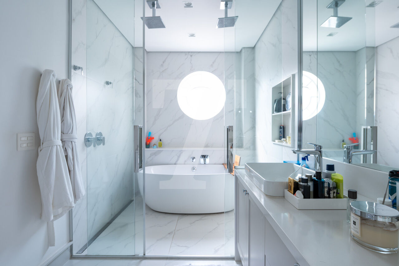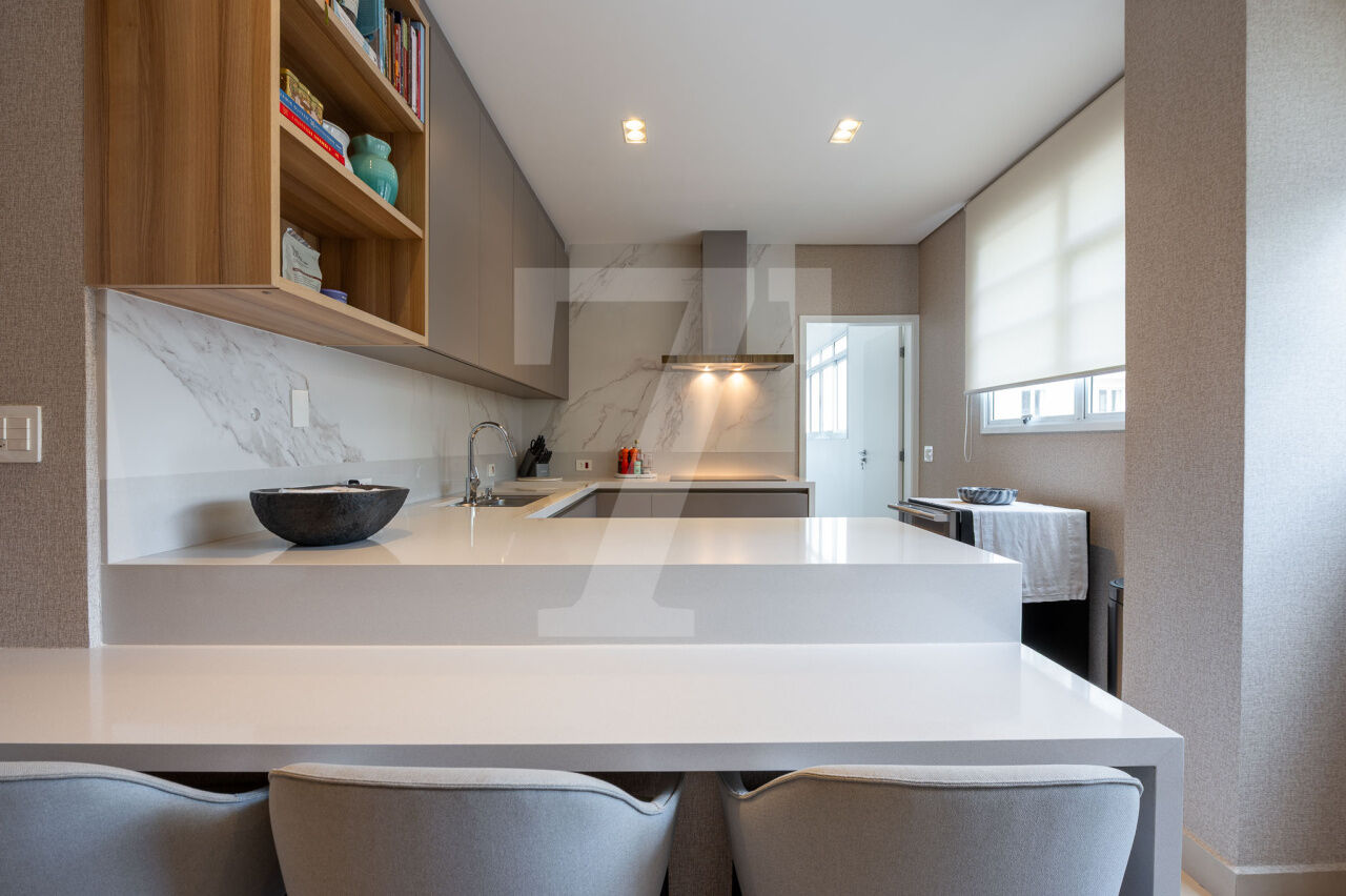 Forte aplauso para o equilíbrio sofisticado entre texturas e materiais. O assoalho em madeira tauari nas áreas sociais e íntimas traz calor, aconchego, enquanto o porcelanato Munari Marfim nas áreas molhadas garante luminosidade, praticidade e um ar contemporâneo. A marcenaria Ornare desenha volumes limpos e elegantes, integrando armazenamento e estética com discrição, sem excessos. Nas louças e metais, a escolha por Deca e Hansgrohe reforça o cuidado com o toque, o conforto no uso e a durabilidade - são detalhes que não aparecem à primeira vista, mas fazem diferença no dia a dia e falam diretamente com quem entende.