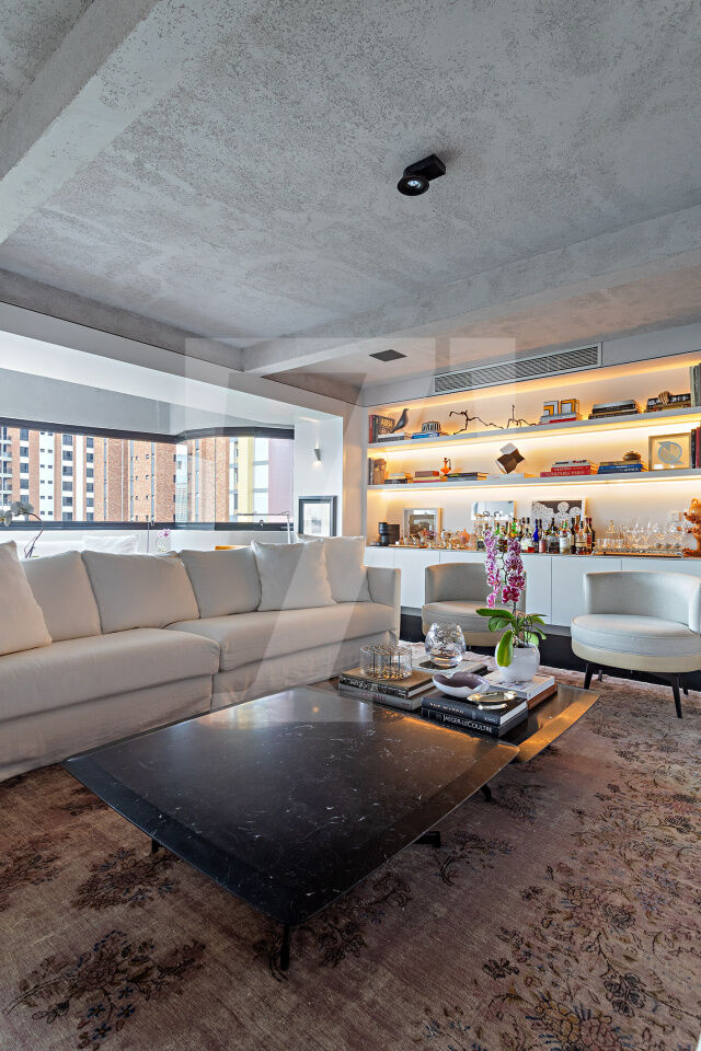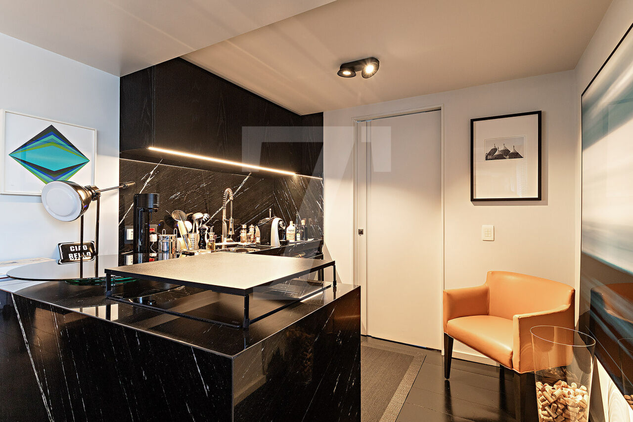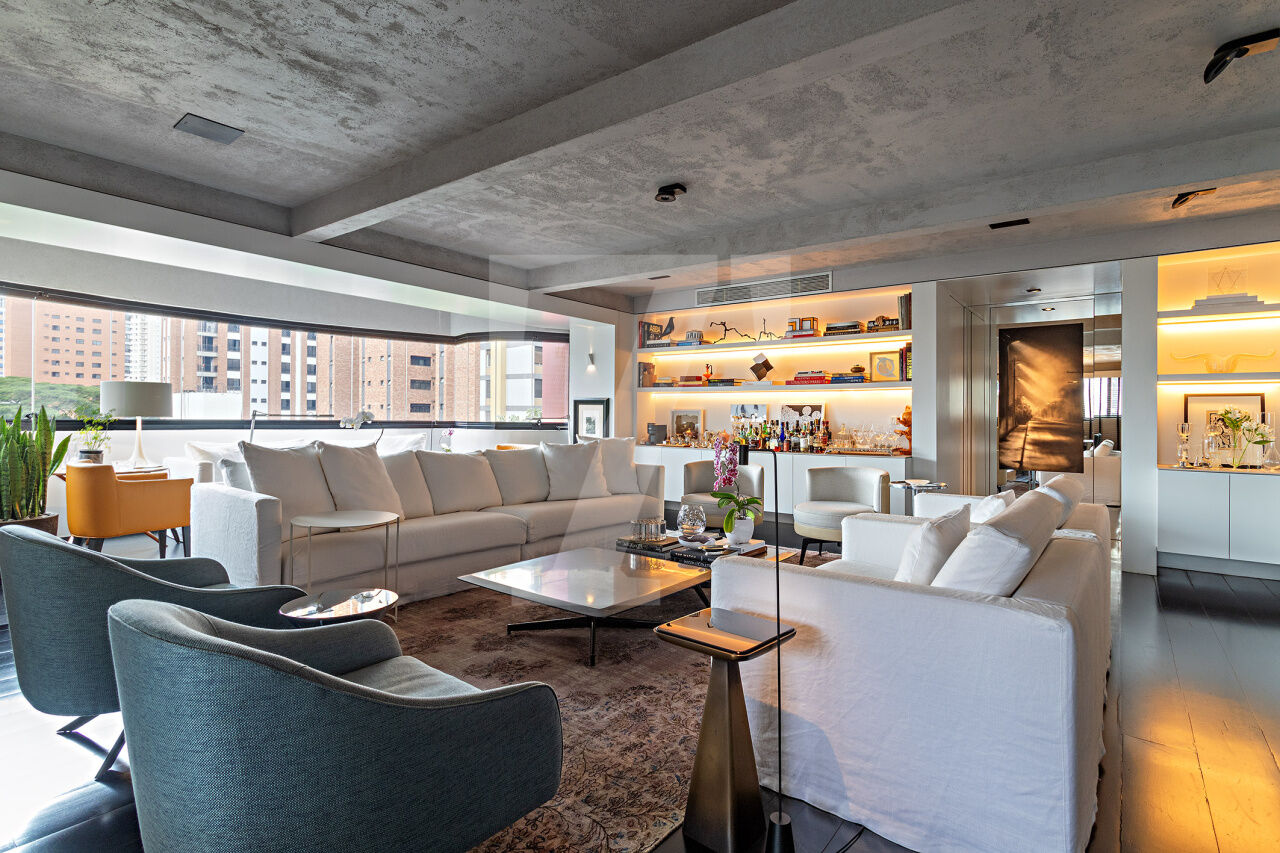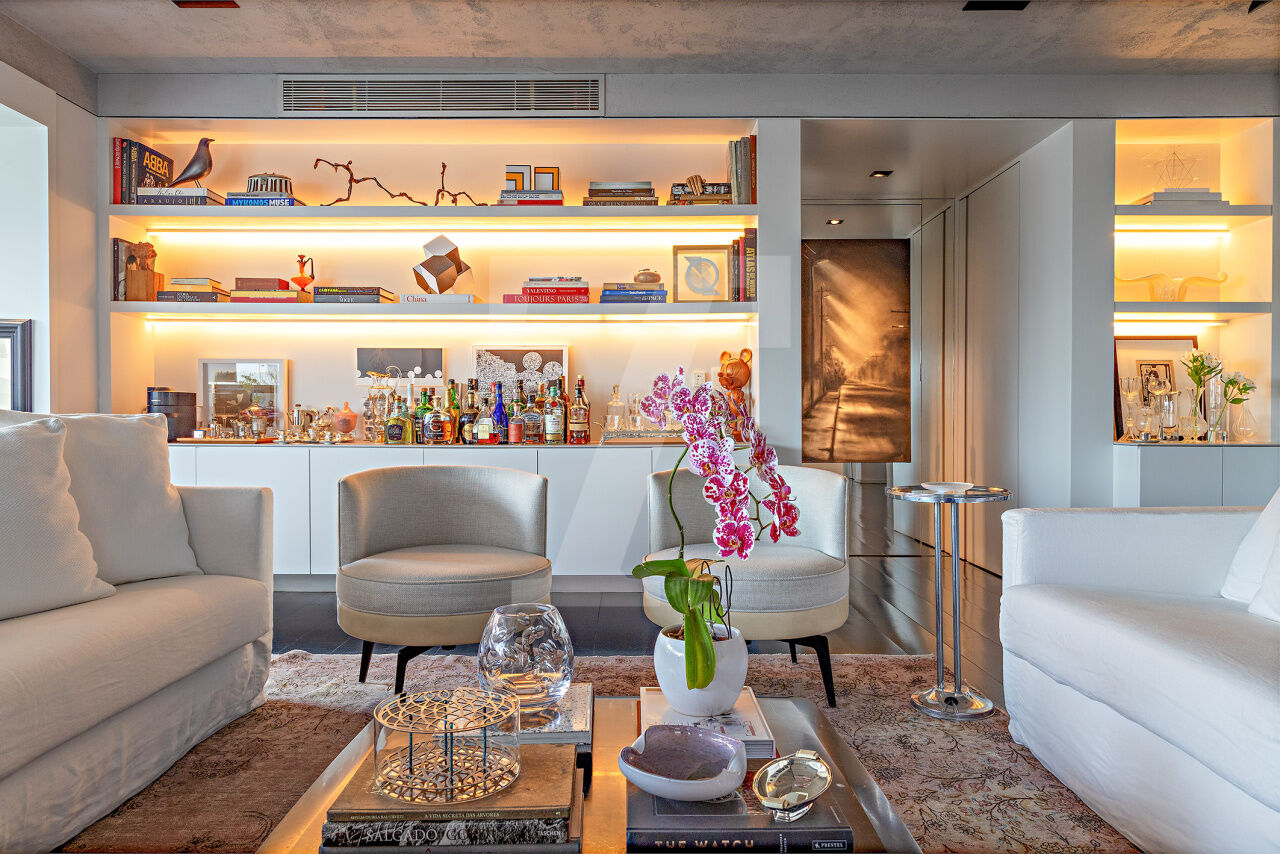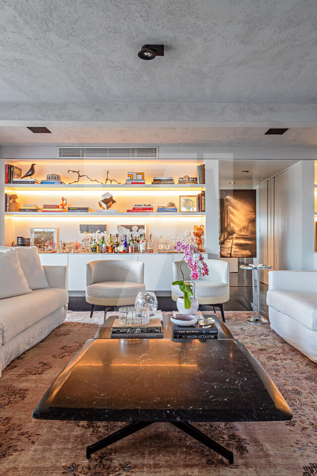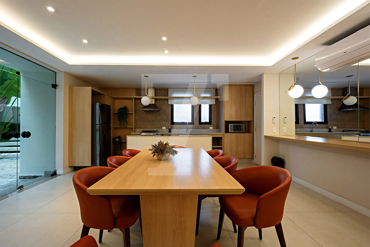A cozinha, dividida em ambientes integrados, apresenta um espaço gourmet sofisticado, ideal para receber com elegância. Totalmente equipado com ar-condicionado central VRF e automação completa, este apartamento oferece o equilíbrio perfeito entre conforto e modernidade em cada detalhe.