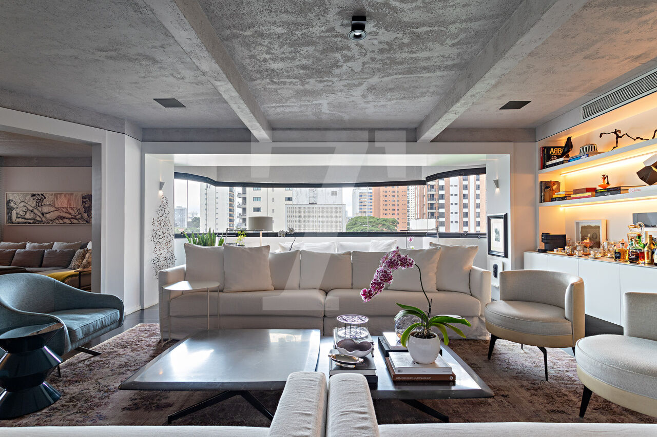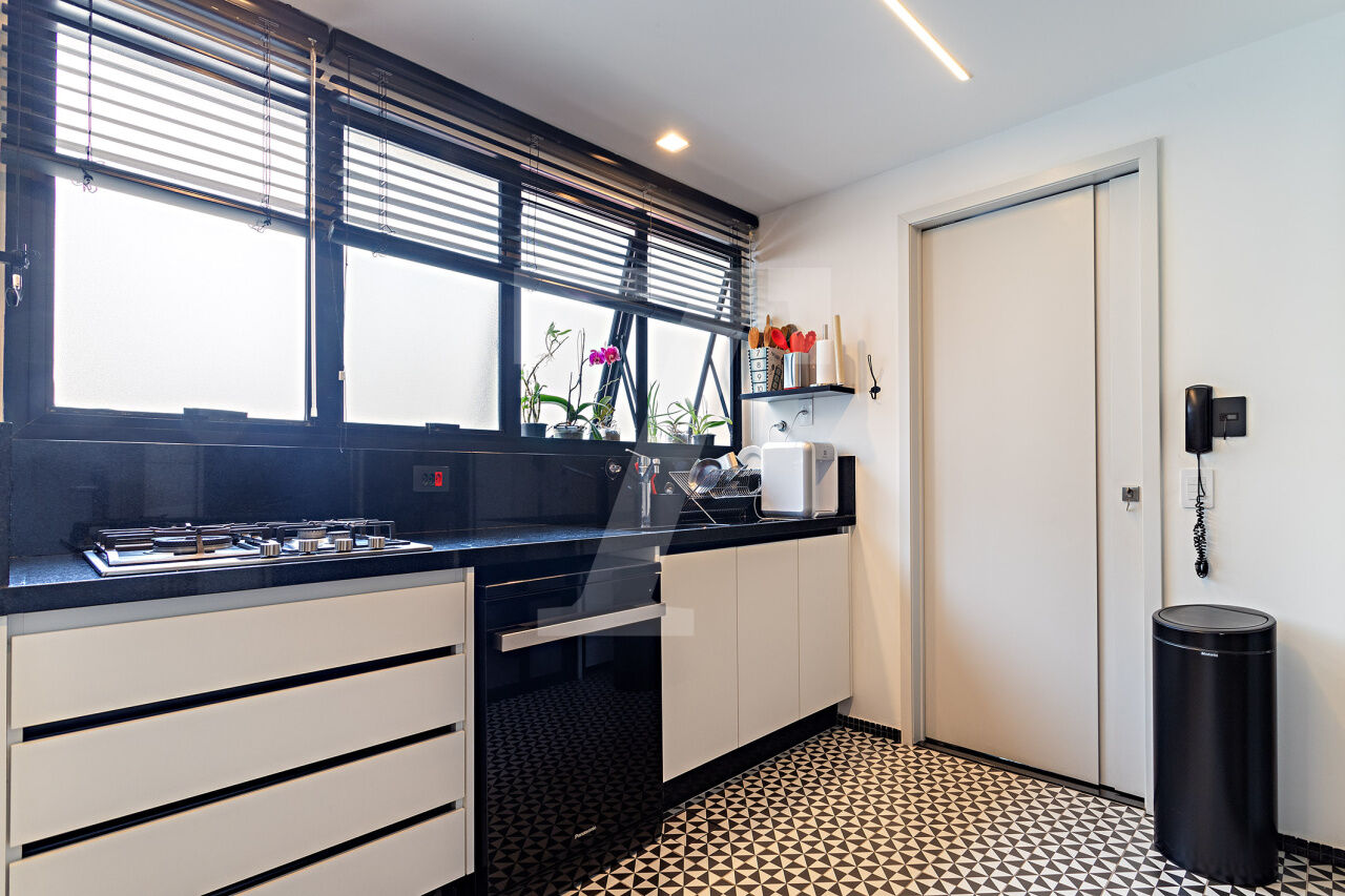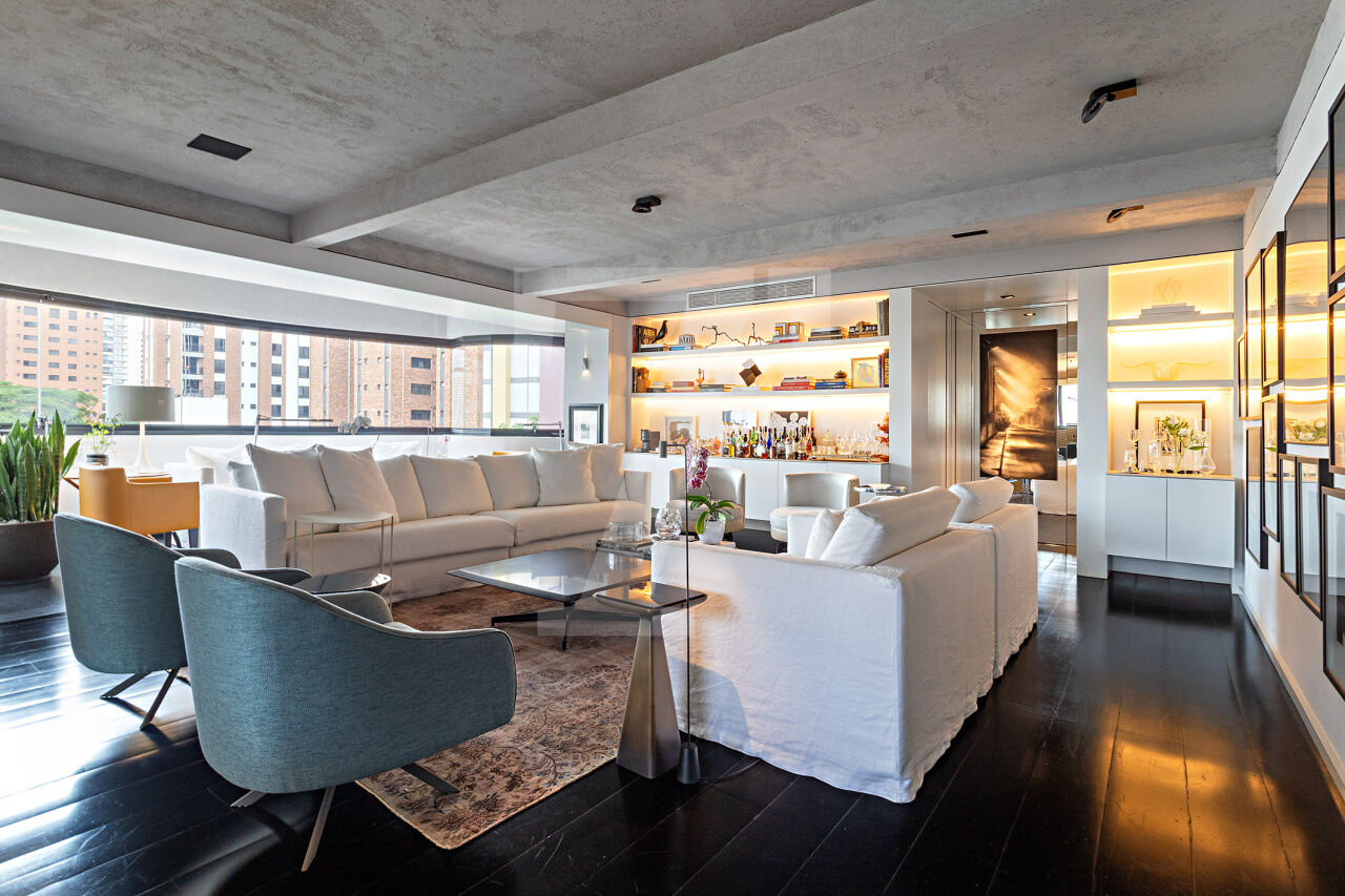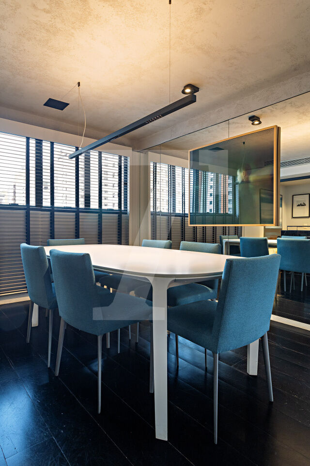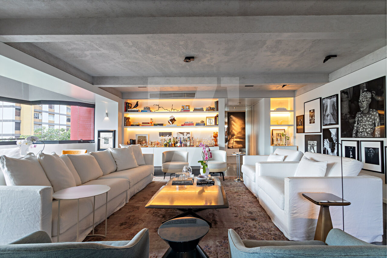A cozinha, dividida em ambientes integrados, apresenta um espaço gourmet sofisticado, ideal para receber com elegância. Totalmente equipado com ar-condicionado central VRF e automação completa, este apartamento oferece o equilíbrio perfeito entre conforto e modernidade em cada detalhe.
