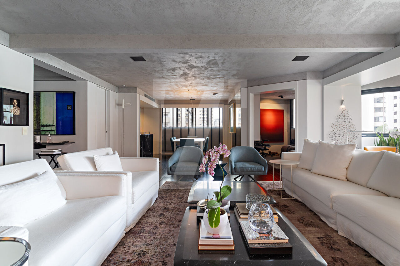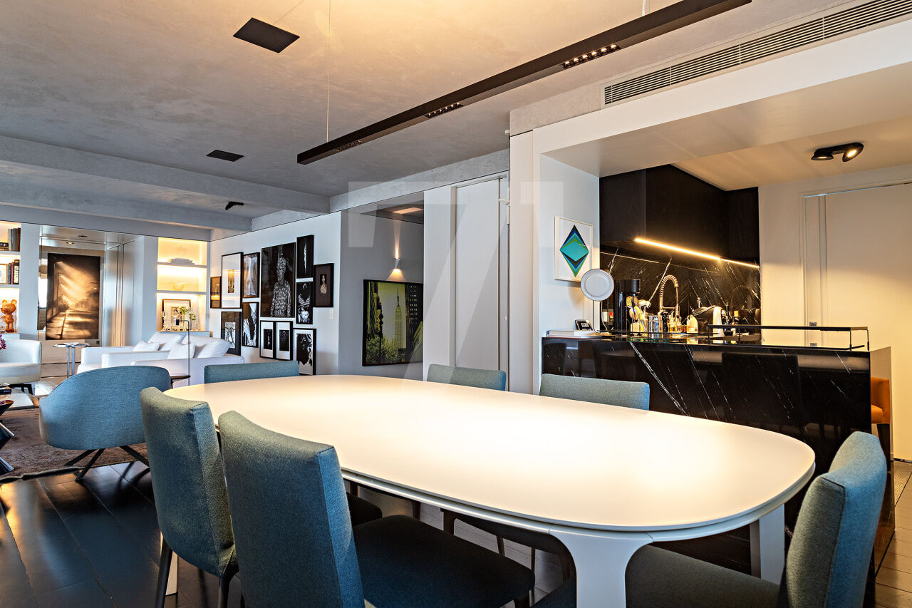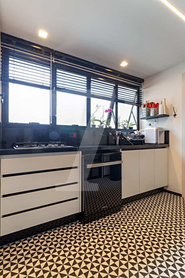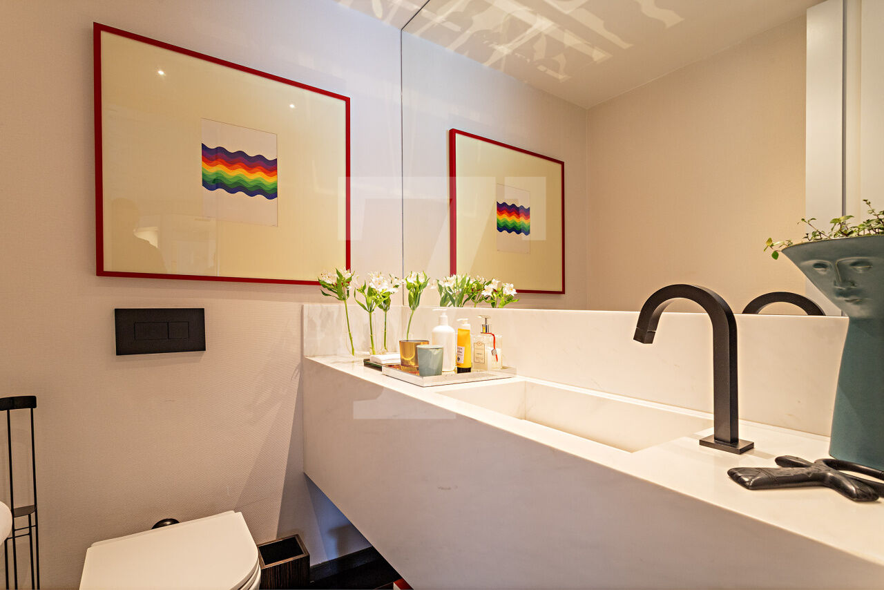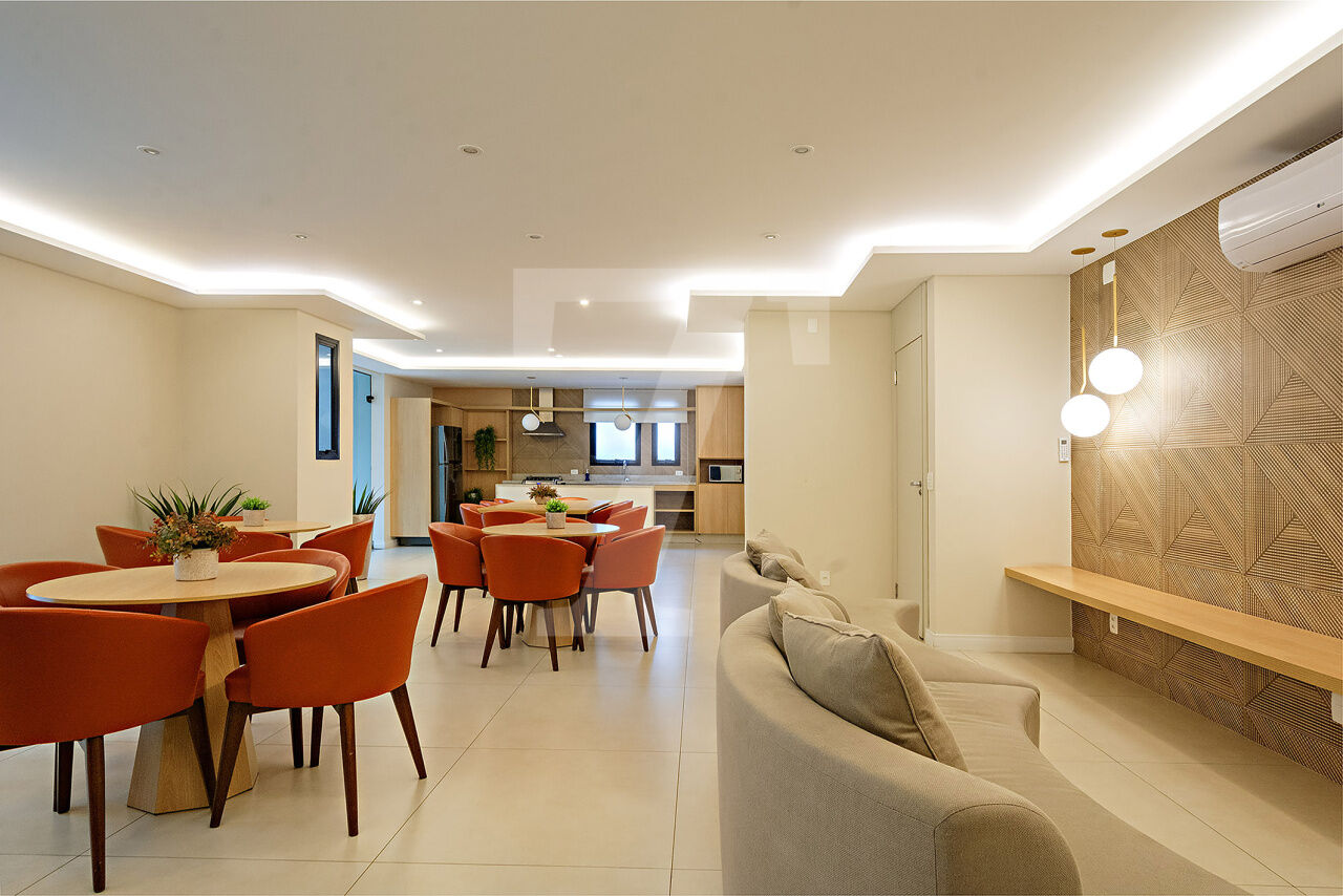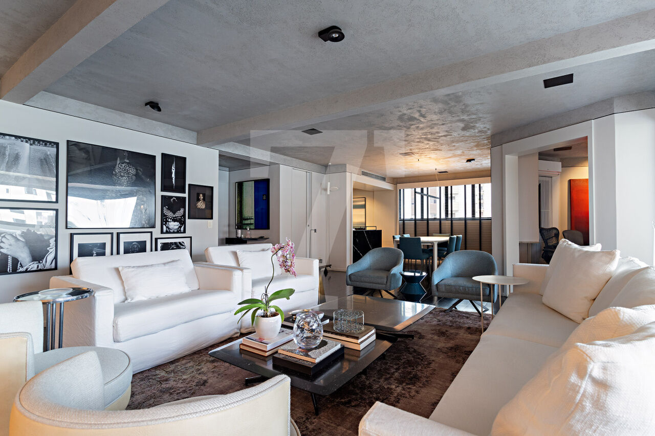 A cozinha, dividida em ambientes integrados, apresenta um espaço gourmet sofisticado, ideal para receber com elegância. Totalmente equipado com ar-condicionado central VRF e automação completa, este apartamento oferece o equilíbrio perfeito entre conforto e modernidade em cada detalhe.