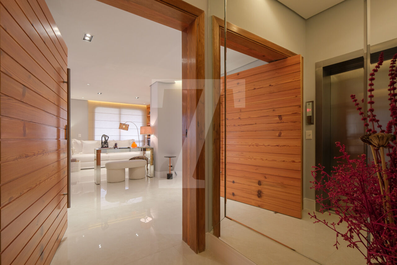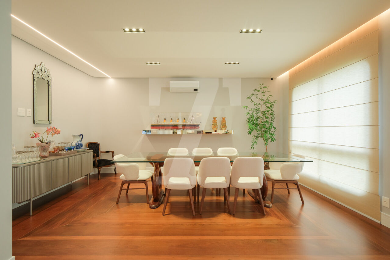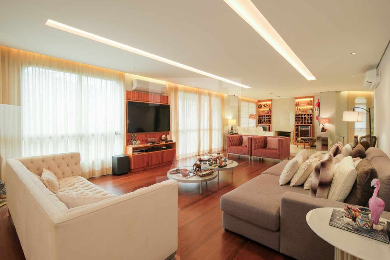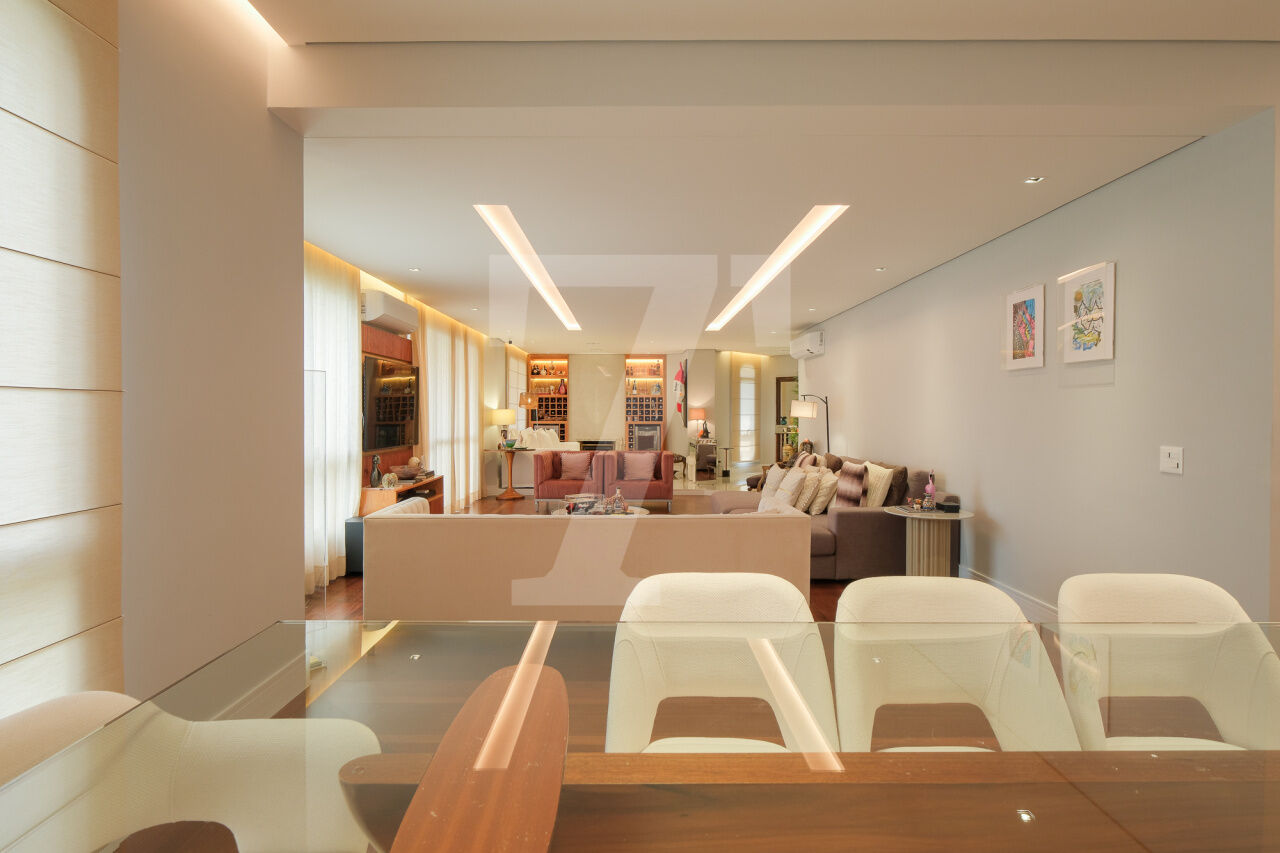Hall privativo se abre para a distribuição de entrada, à esquerda temos a área intima ao centro temos a sala de brinquedos e à direita amplo living, para vários ambientes, com varanda. Na área intima temos 3 suites e 1 escritório, a máster conta com closet e varanda. Cozinha, sala de almoço, área de serviço e dependências completas de funcionária. 4 Vagas.