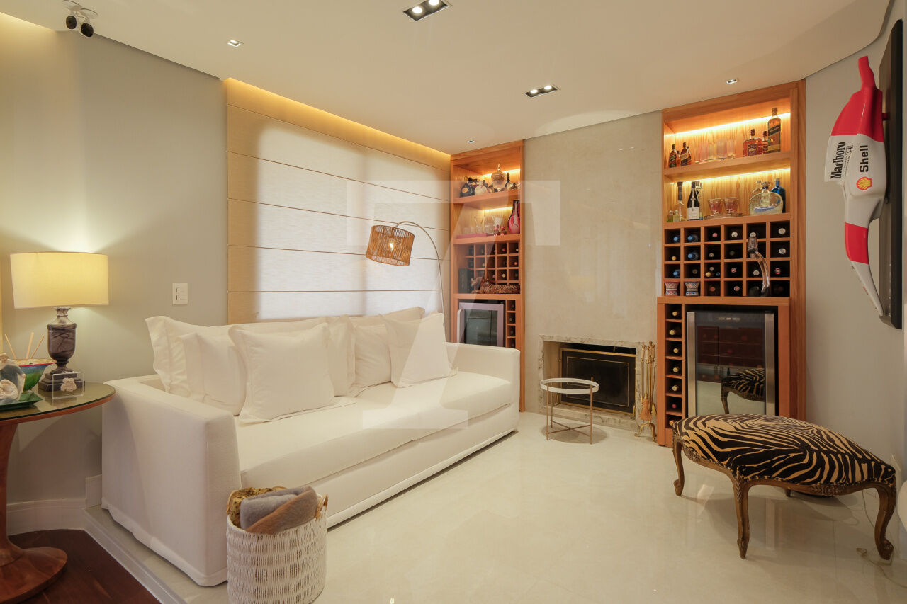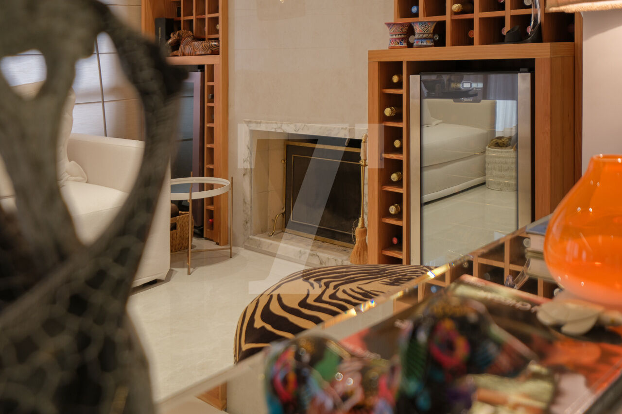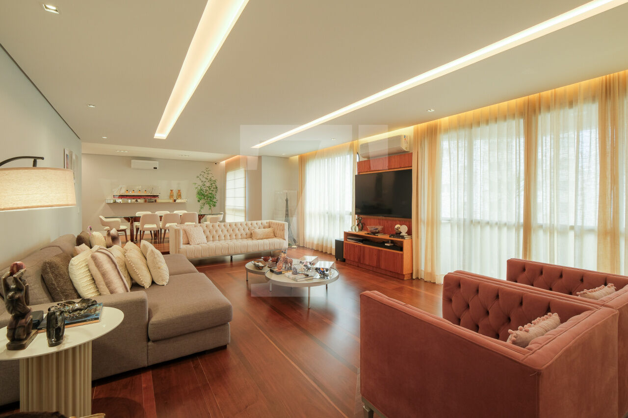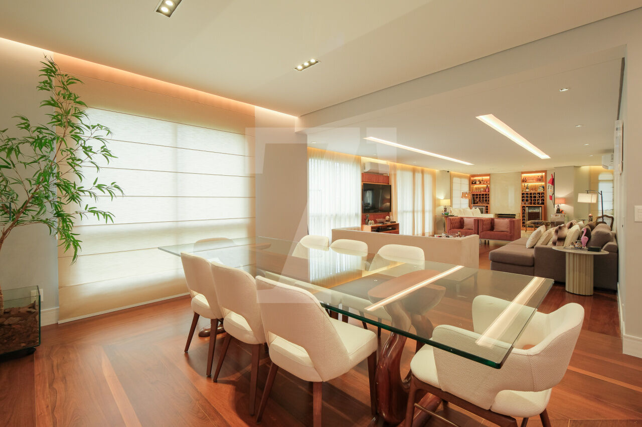 Hall privativo se abre para a distribuição de entrada, à esquerda temos a área intima ao centro temos a sala de brinquedos e à direita amplo living, para vários ambientes, com varanda. Na área intima temos 3 suites e 1 escritório, a máster conta com closet e varanda. Cozinha, sala de almoço, área de serviço e dependências completas de funcionária. 4 Vagas.