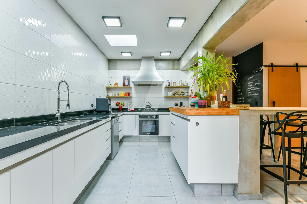 O estilo brutalista aparece nos traços e no cimento à mostra, criando uma casa moderna e cheia de identidade. Os ambientes contam com pé-direito alto e uma sensação constante de respiro. Uma casa que combina presença arquitetônica e aconchego de um jeito único.
