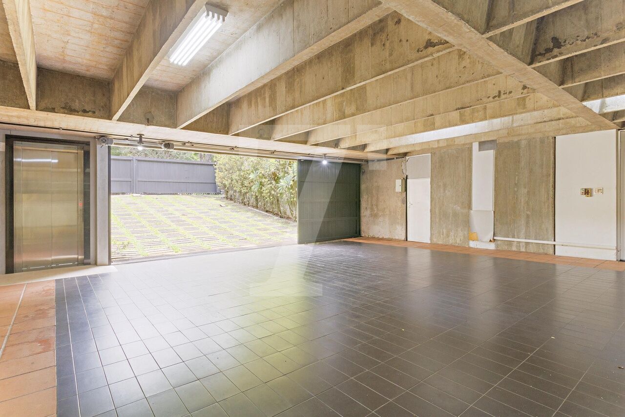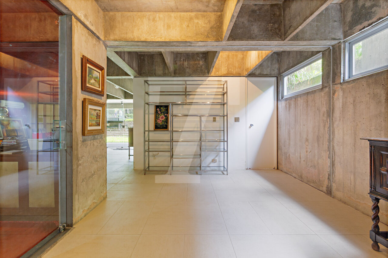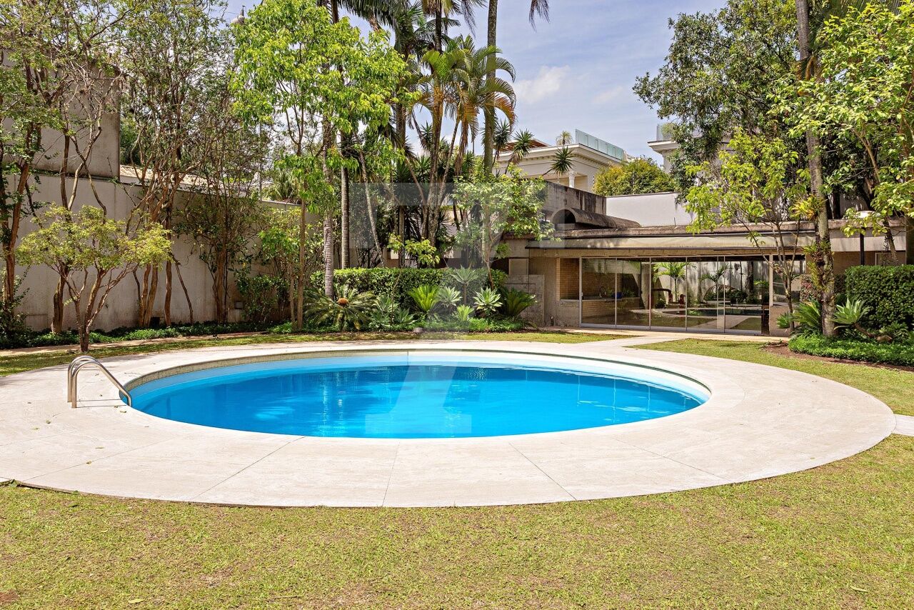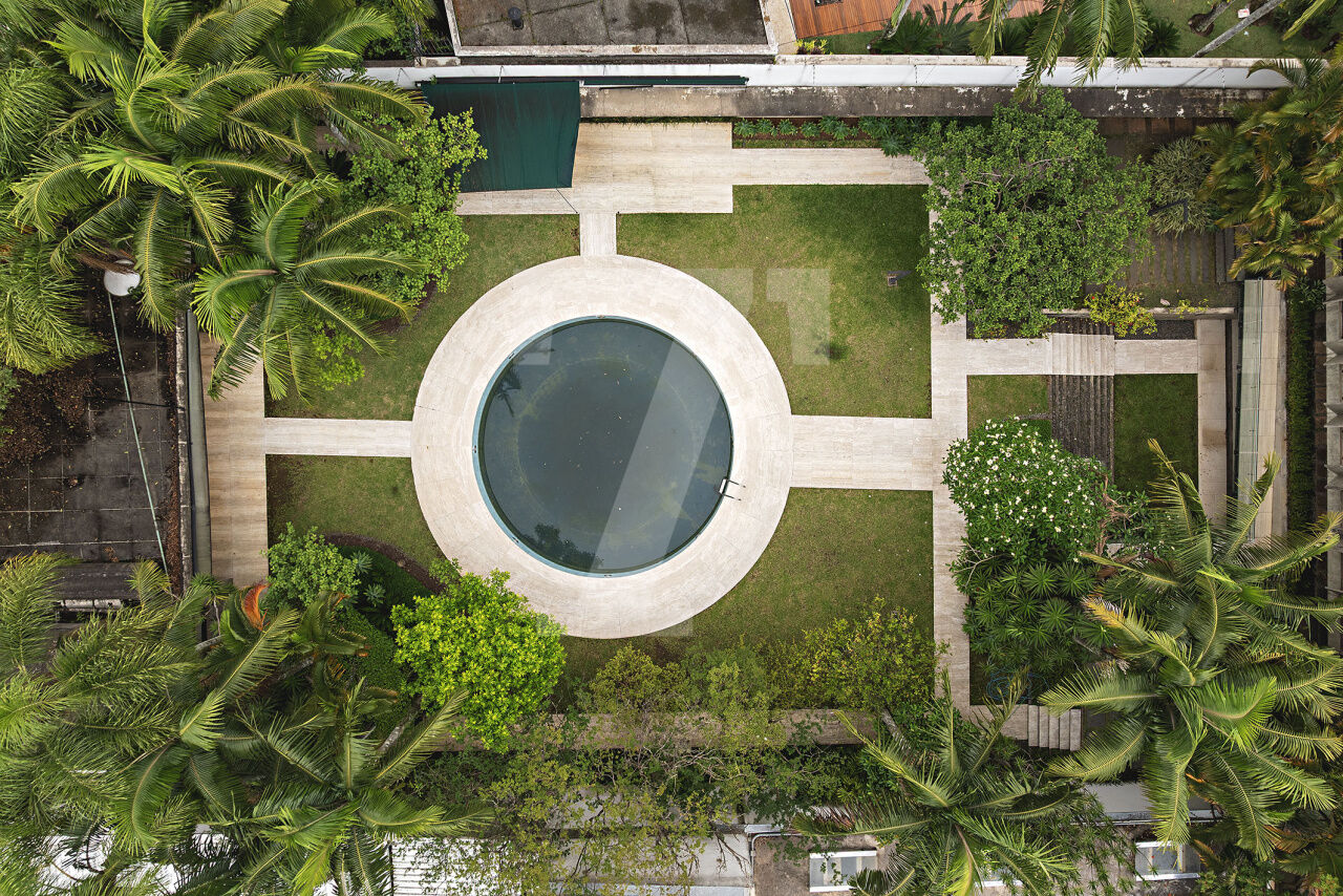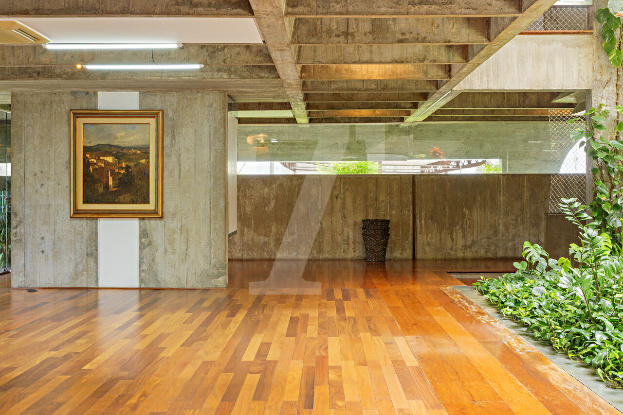 Esta residência, projetada por renomado arquiteto modernista, ocupa um terreno de 2.250 m² no Jardim Lusitânia, em localização privilegiada, com vista para o Parque Ibirapuera e voltada para uma tranquila praça. A casa possui 1.300 m² de área construída e conta com paisagismo assinado por Burle Marx, tanto com árvores nativas quanto palmeiras imperiais. A garagem tem capacidade para mais de 35 automóveis e a residência é equipada com elevador, gerador, ar-condicionado e cozinha industrial. A área externa conta com um extenso jardim e piscina. Internamente, a residência dispõe de pé direito triplo, proporcionando uma sensação de amplitude e elegância. A área íntima é composta por cinco suítes, sendo a master com mais de 150 m², e inclui uma sala íntima e escritório privativos. A casa ainda oferece um cinema, biblioteca, salas de reuniões, TV, jogos, e lareira. O living é voltado para os jardins internos e externos, com paisagismo refinado e uma piscina que complementa o ambiente.