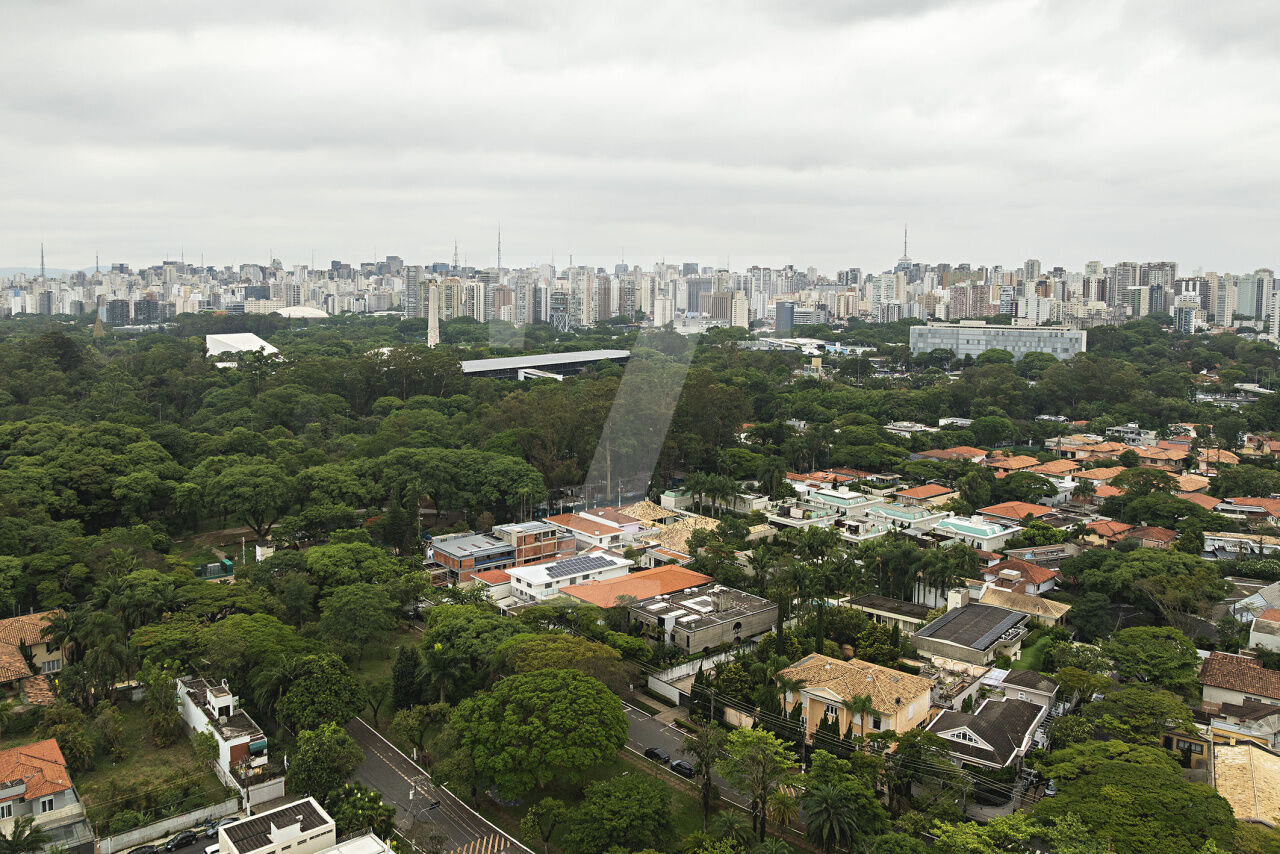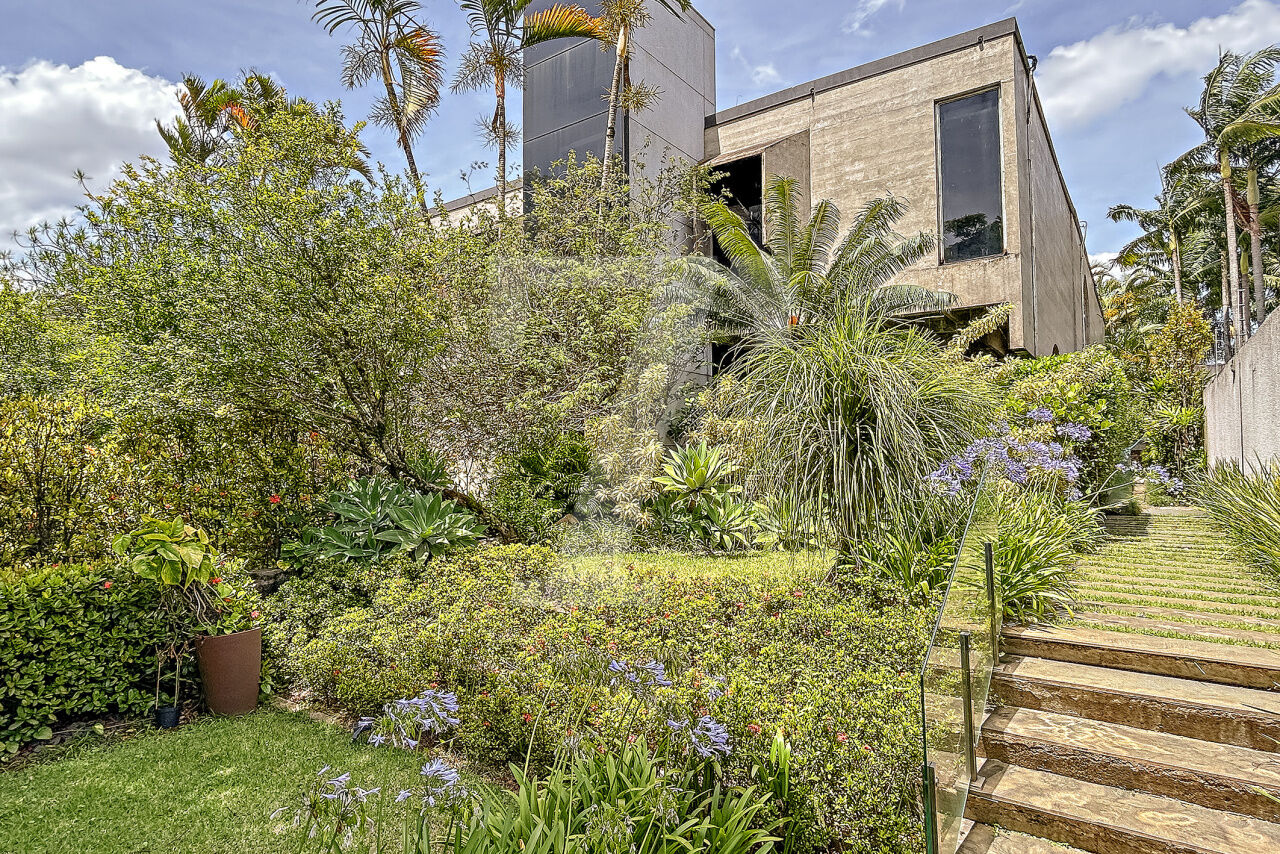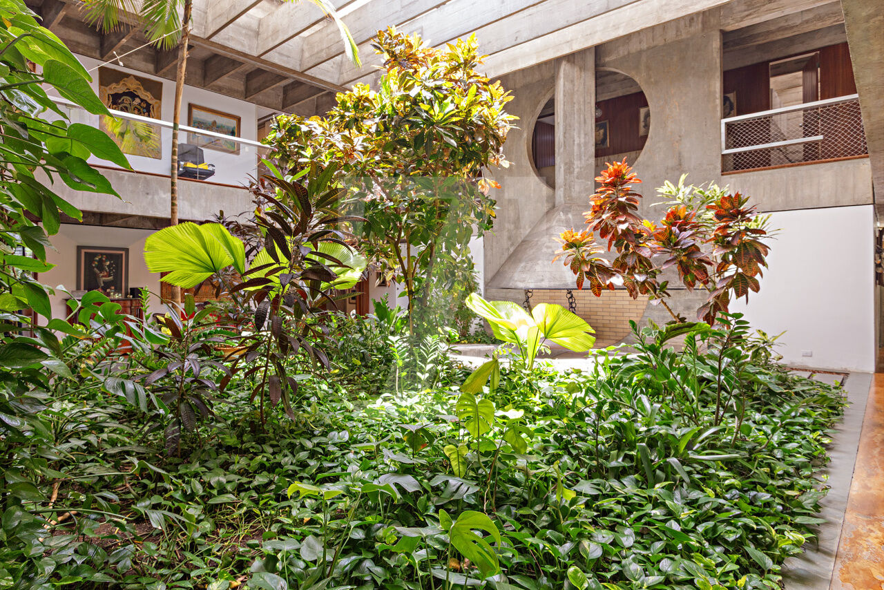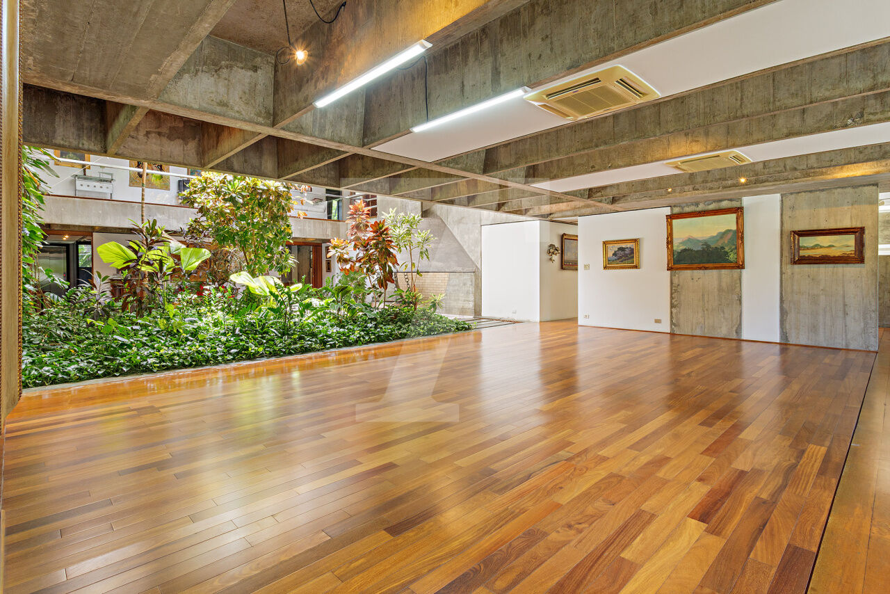 Esta residência, projetada por renomado arquiteto modernista, ocupa um terreno de 2.250 m² no Jardim Lusitânia, em localização privilegiada, com vista para o Parque Ibirapuera e voltada para uma tranquila praça. A casa possui 1.300 m² de área construída e conta com paisagismo assinado por Burle Marx, tanto com árvores nativas quanto palmeiras imperiais. A garagem tem capacidade para mais de 35 automóveis e a residência é equipada com elevador, gerador, ar-condicionado e cozinha industrial. A área externa conta com um extenso jardim e piscina. Internamente, a residência dispõe de pé direito triplo, proporcionando uma sensação de amplitude e elegância. A área íntima é composta por cinco suítes, sendo a master com mais de 150 m², e inclui uma sala íntima e escritório privativos. A casa ainda oferece um cinema, biblioteca, salas de reuniões, TV, jogos, e lareira. O living é voltado para os jardins internos e externos, com paisagismo refinado e uma piscina que complementa o ambiente.