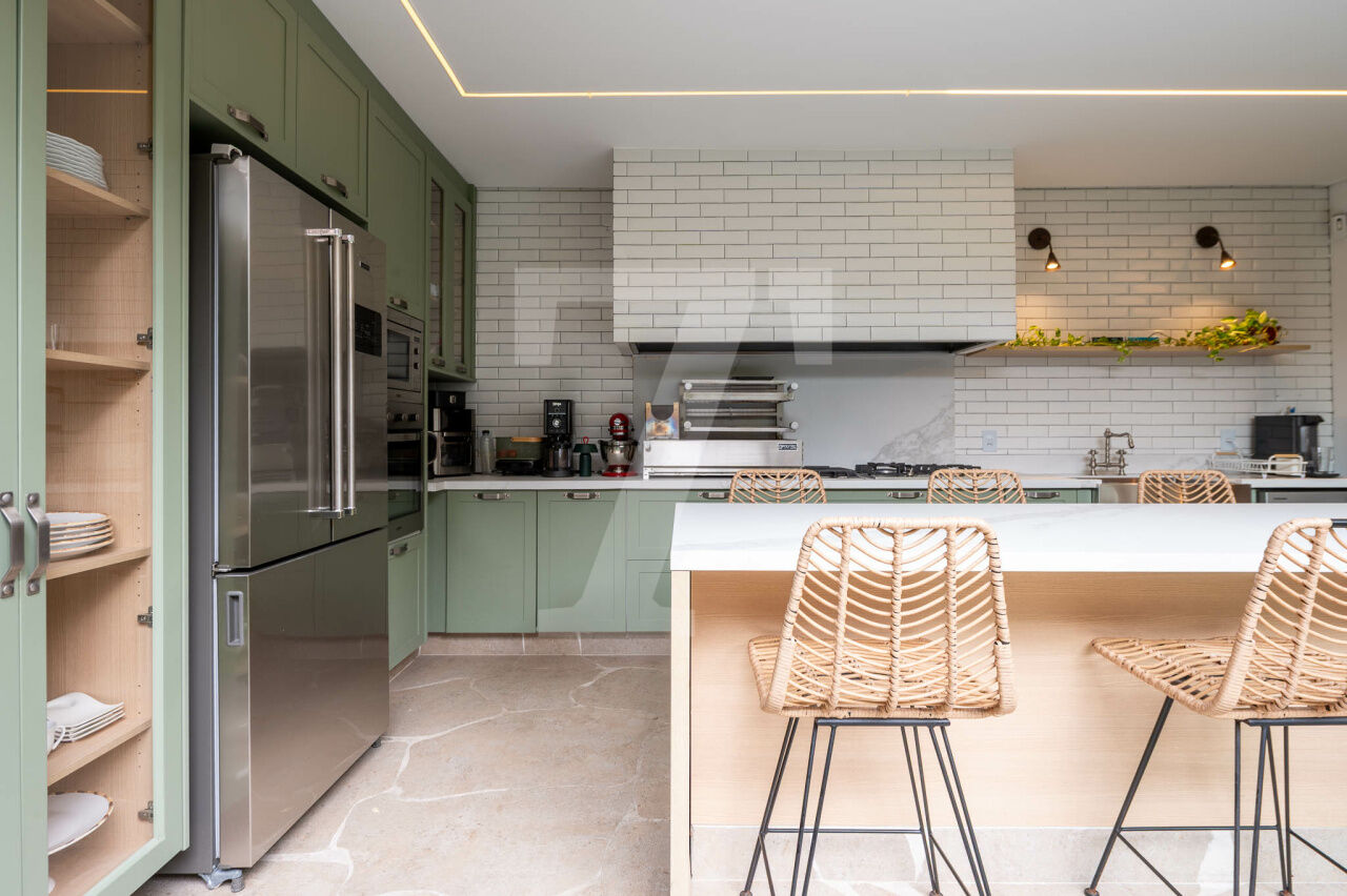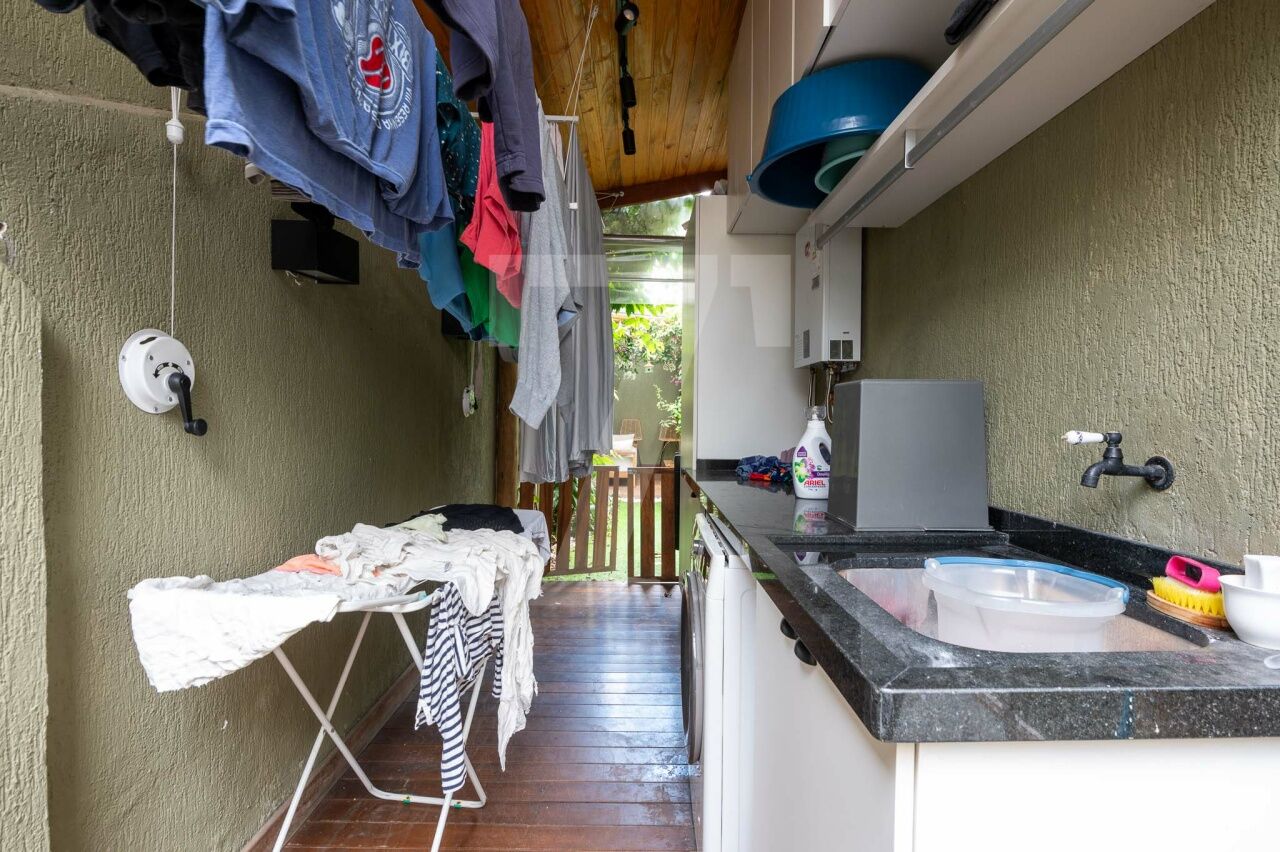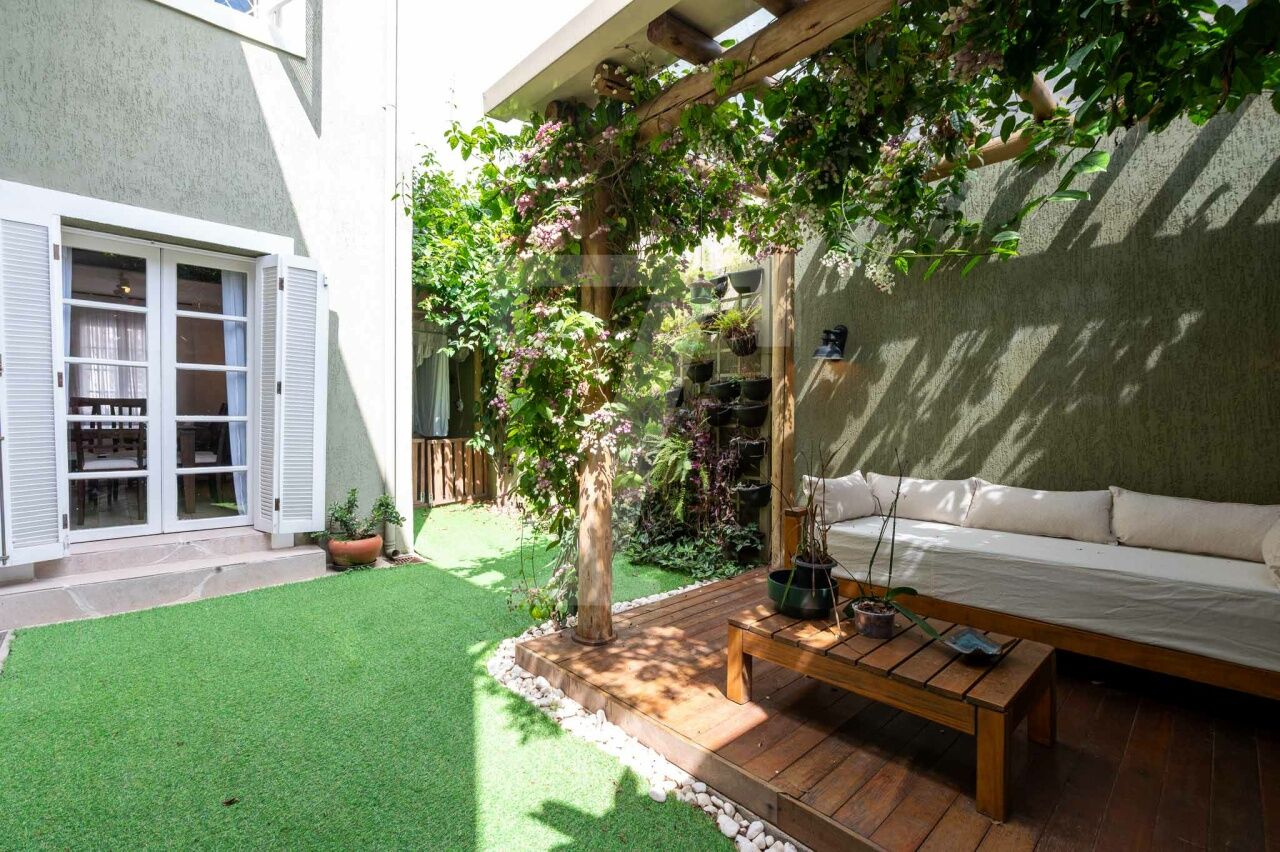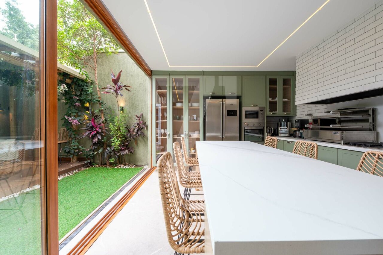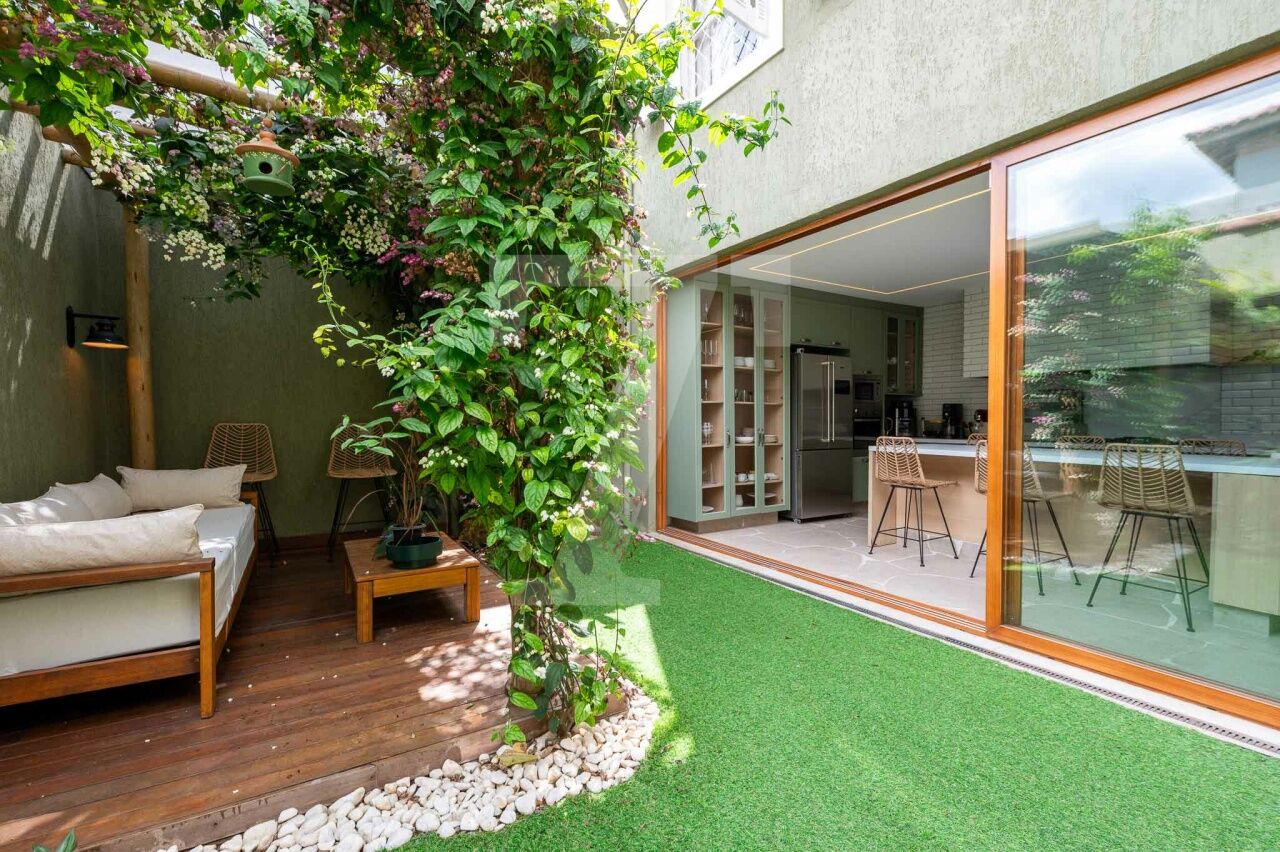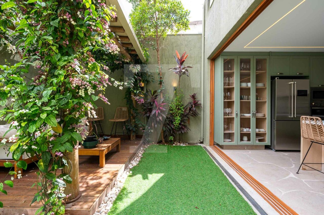 No térreo tem sala com três ambientes, cozinha moderna linda e jardim encantador. Também há lavabo, despensa e área de serviço.
