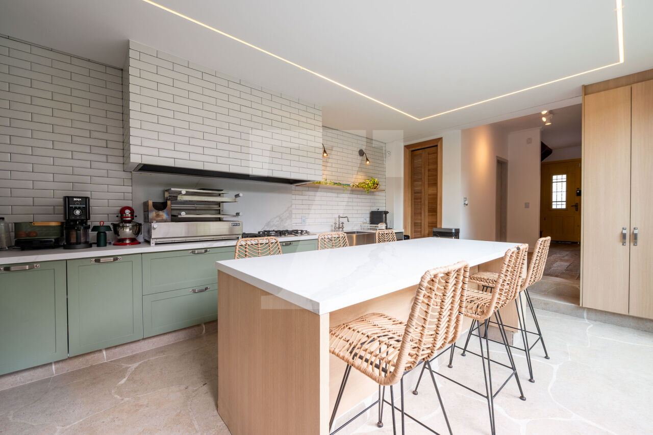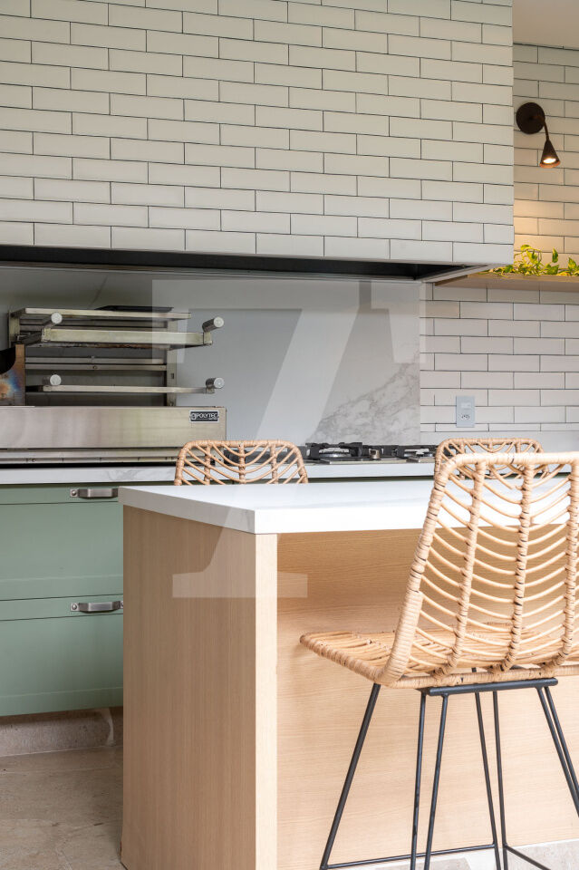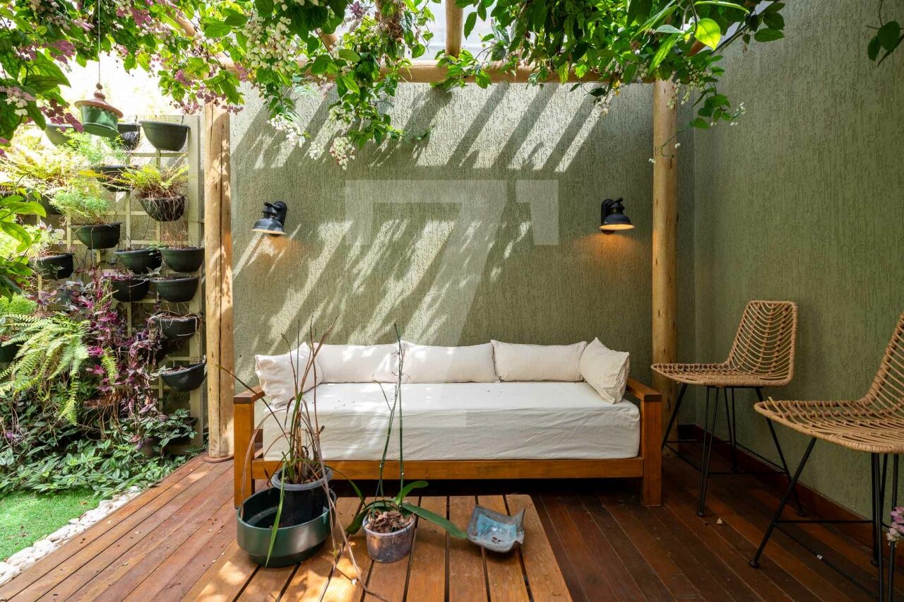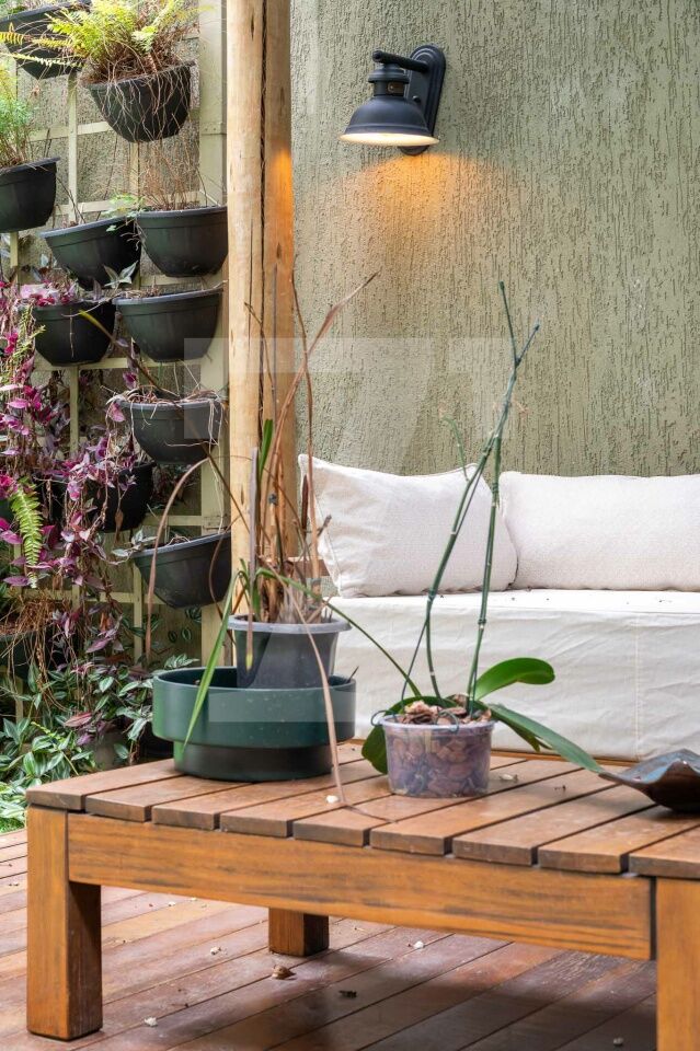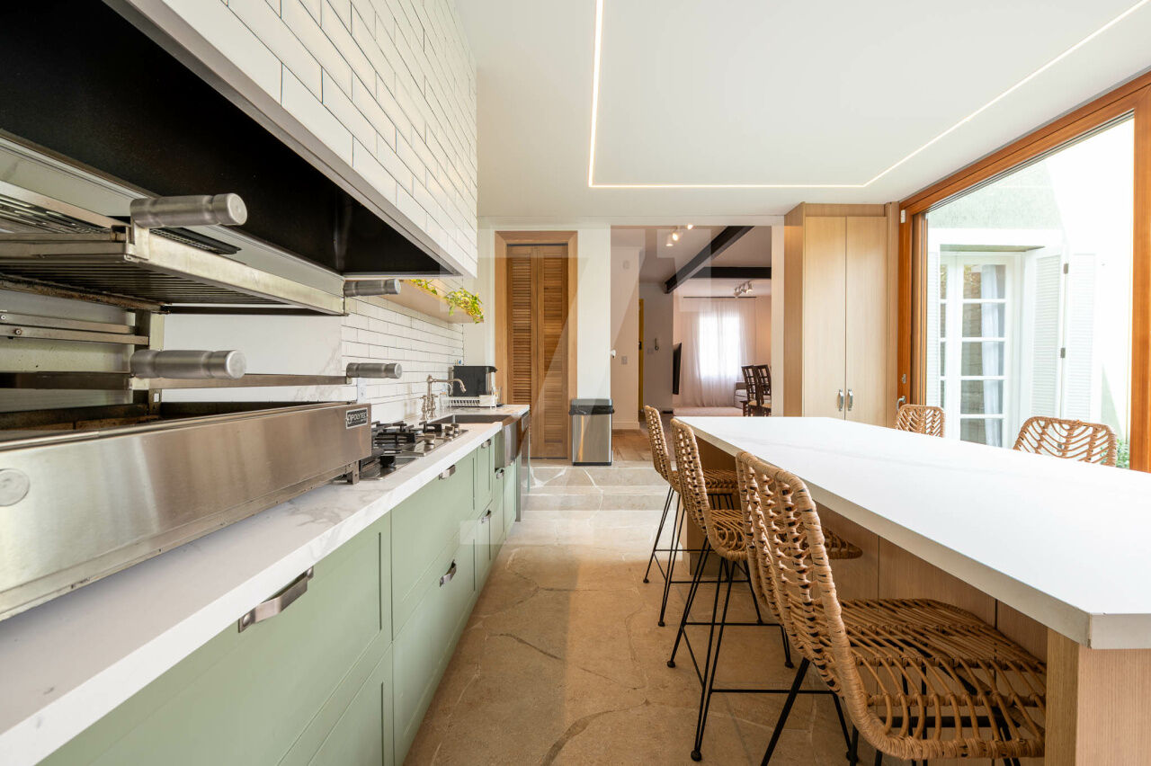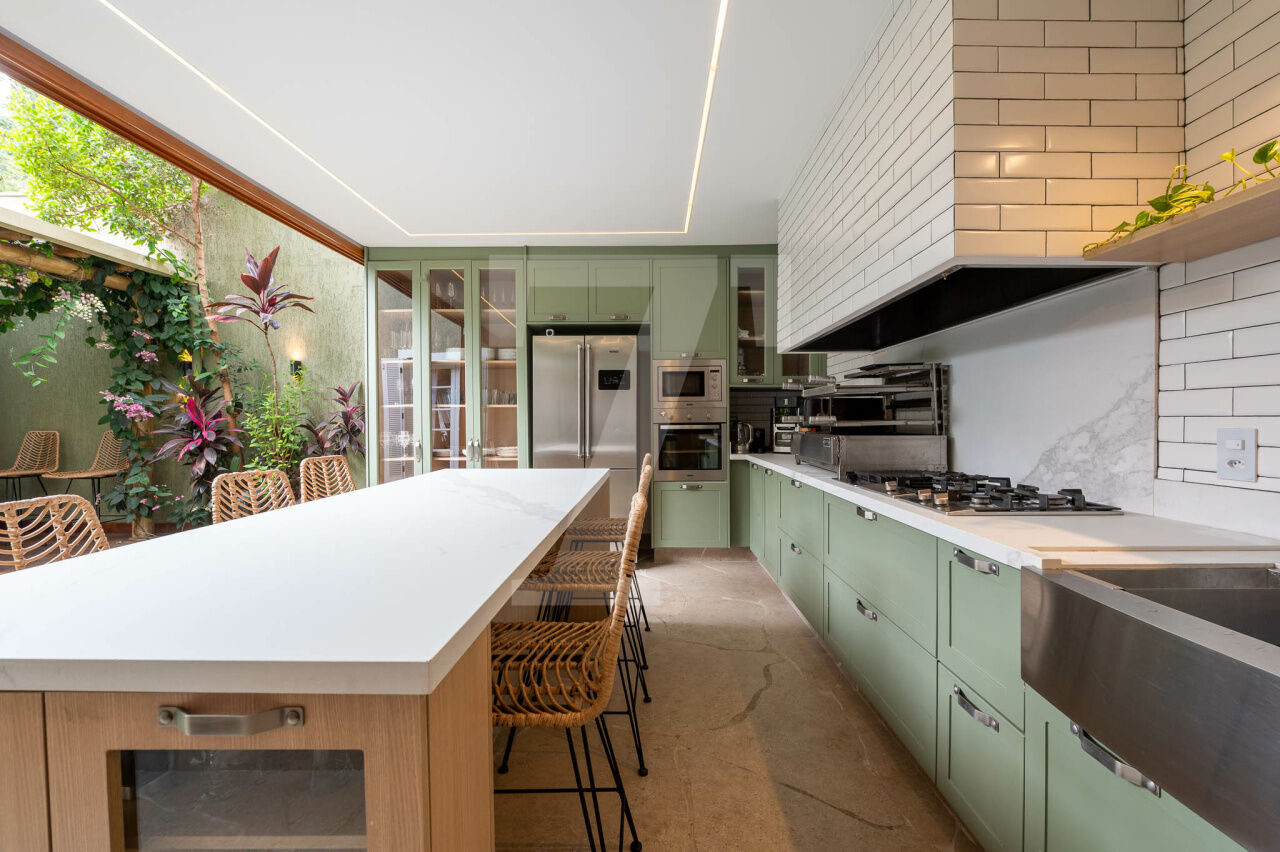 No térreo tem sala com três ambientes, cozinha moderna linda e jardim encantador. Também há lavabo, despensa e área de serviço.