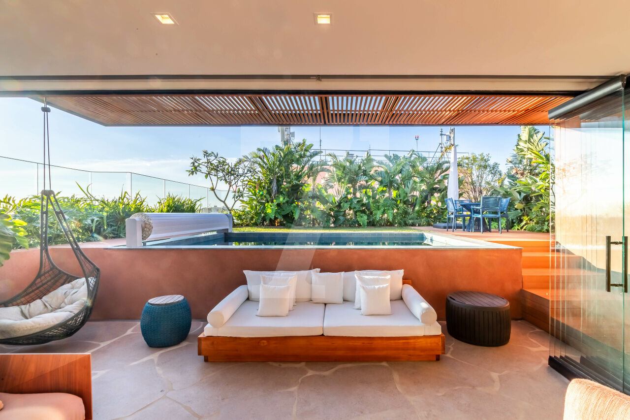No segundo piso, a área externa é o ponto de encontro entre a cidade e o silêncio. Piscina aquecida, deck em madeira, horta com irrigação automatizada e uma cozinha gourmet equipada fazem deste espaço um convite ao ar livre. Um terraço que acompanha o pôr do sol com serenidade e amplitude.