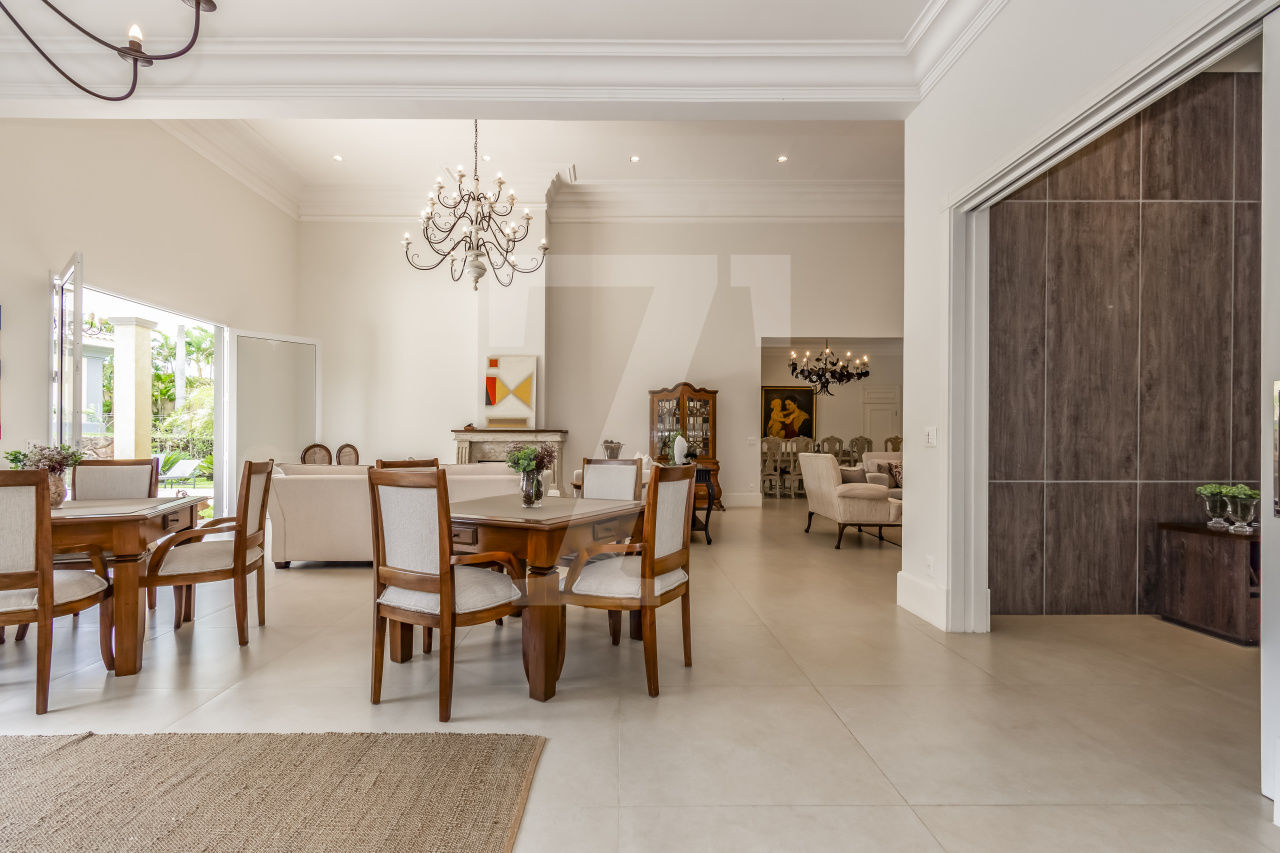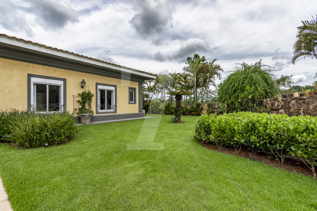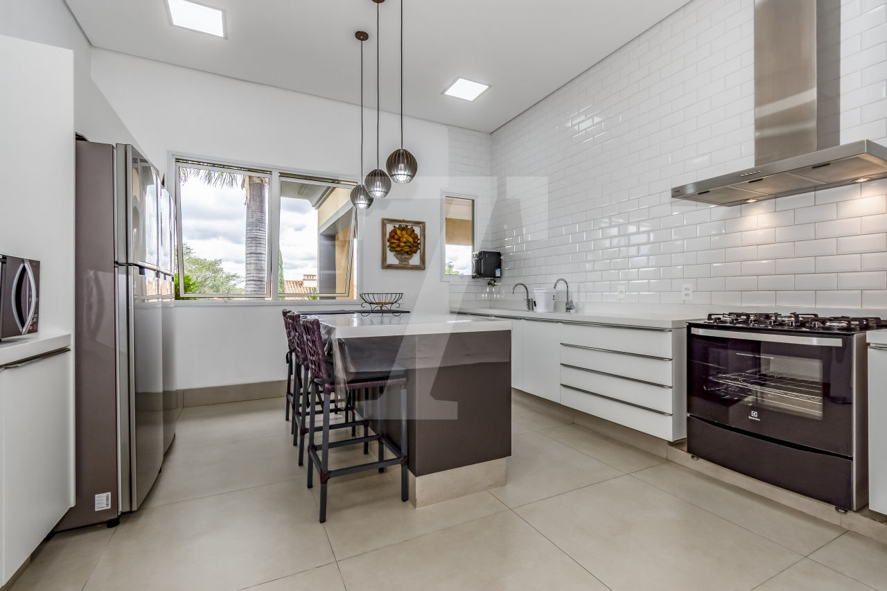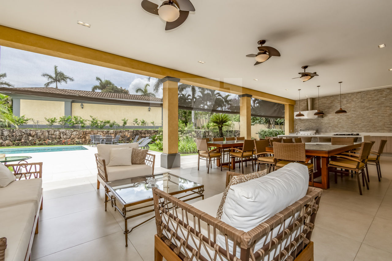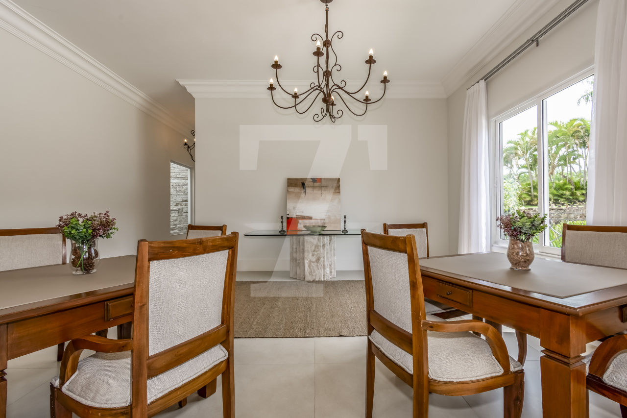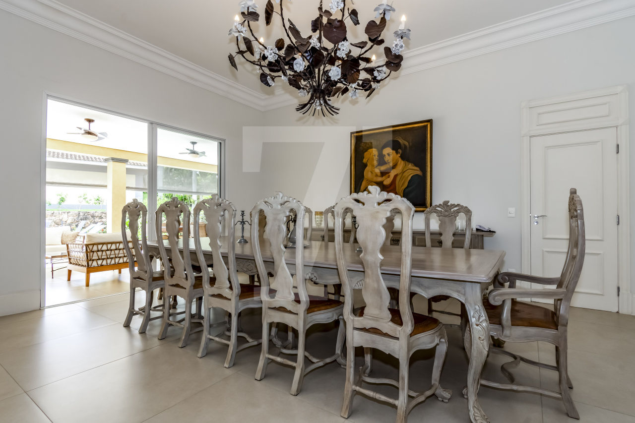 Casa com construção moderna com 3000 metros de terreno e 800 m² metros de área construída. Casa térrea com 5 suítes, uma master com closet e banheiros Sr. e Sra. Todas as suítes possuem varanda para área interna da residência. Sala de Estar com amplo living para 3 ambientes, sala de jantar, home, copa e cozinha, adega, espaço gourmet,. Amplo jardim com piscina e pomar. Sauna e casa com dependências de serviço completas. Garagem para 7 vagas. Atualizada e moderna.