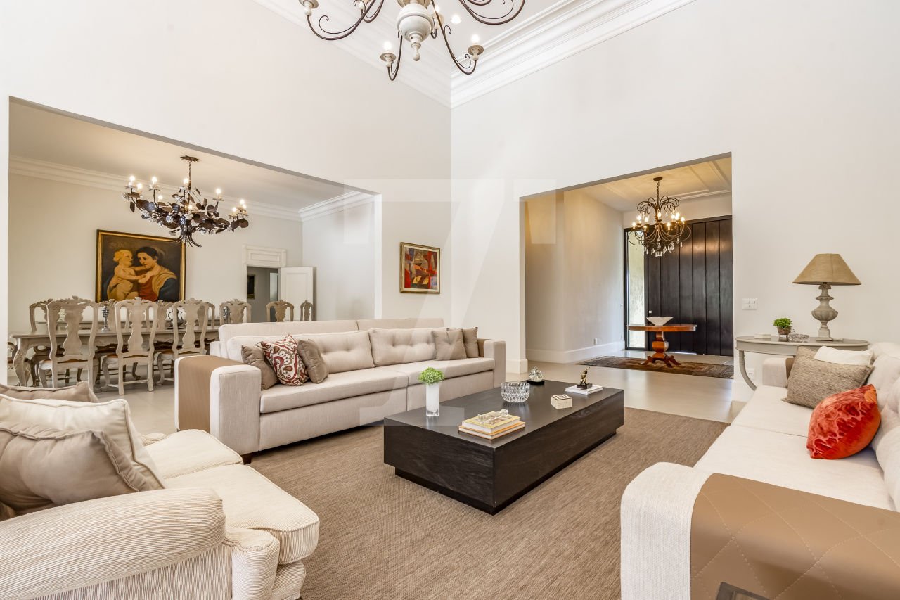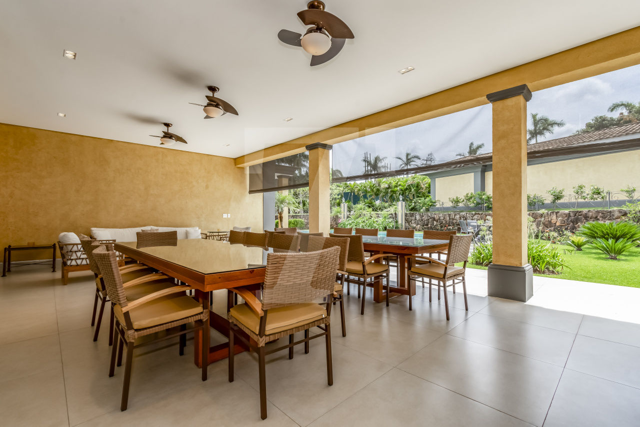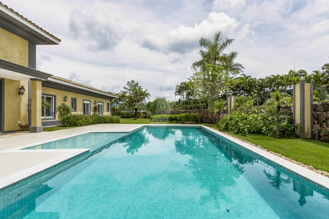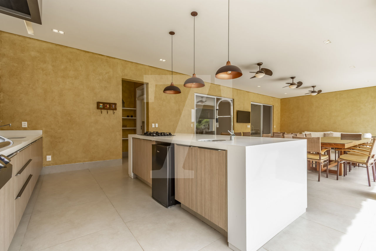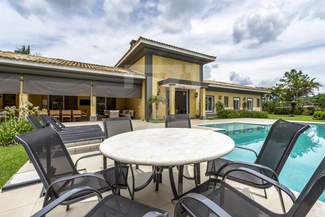Casa com construção moderna com 3000 metros de terreno e 800 m² metros de área construída. Casa térrea com 5 suítes, uma master com closet e banheiros Sr. e Sra. Todas as suítes possuem varanda para área interna da residência. Sala de Estar com amplo living para 3 ambientes, sala de jantar, home, copa e cozinha, adega, espaço gourmet,. Amplo jardim com piscina e pomar. Sauna e casa com dependências de serviço completas. Garagem para 7 vagas. Atualizada e moderna.