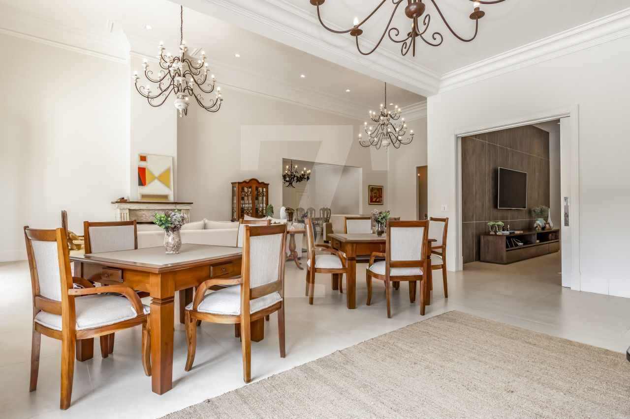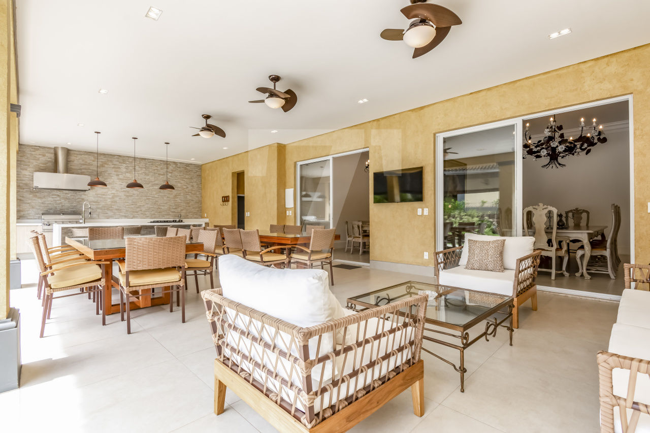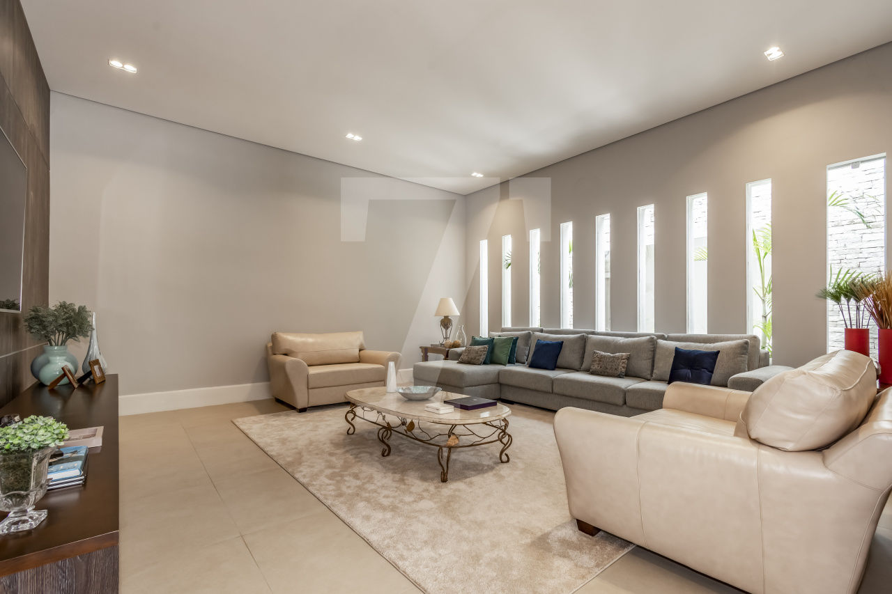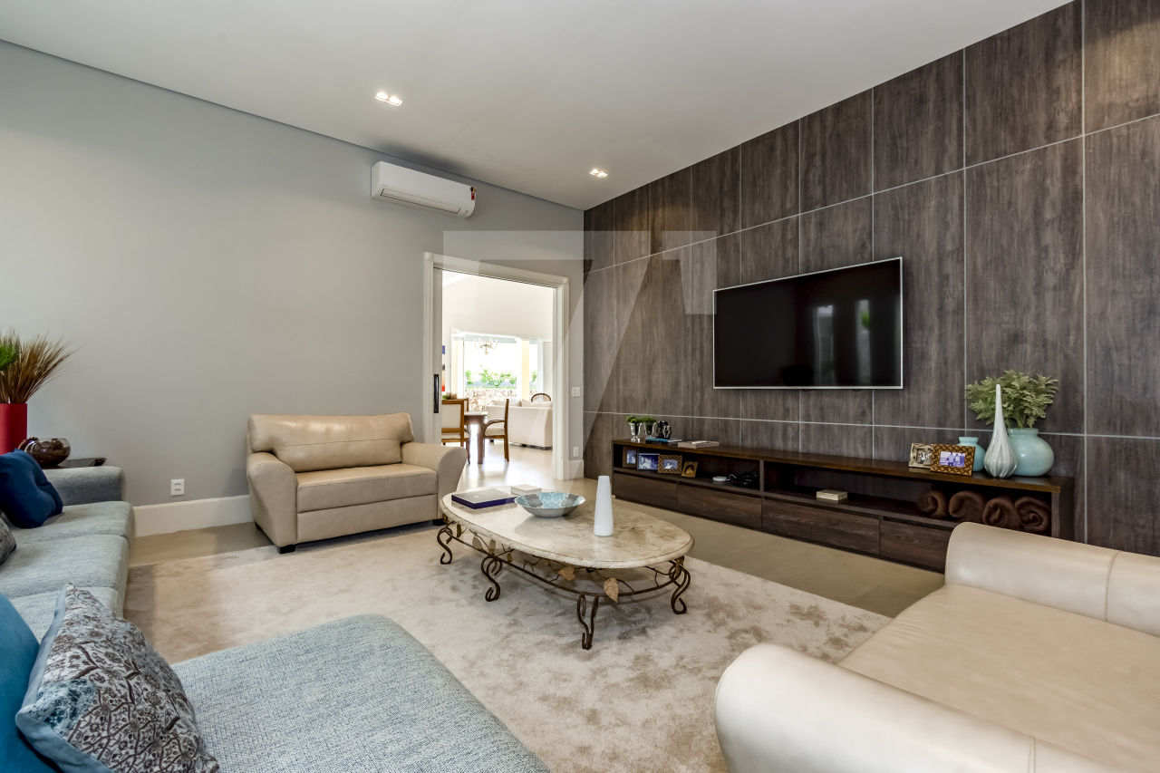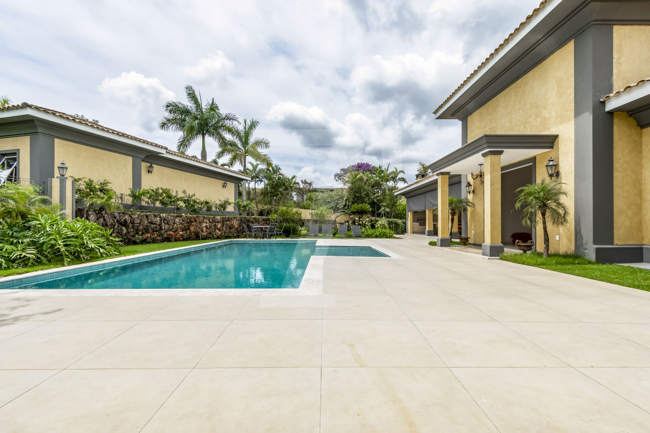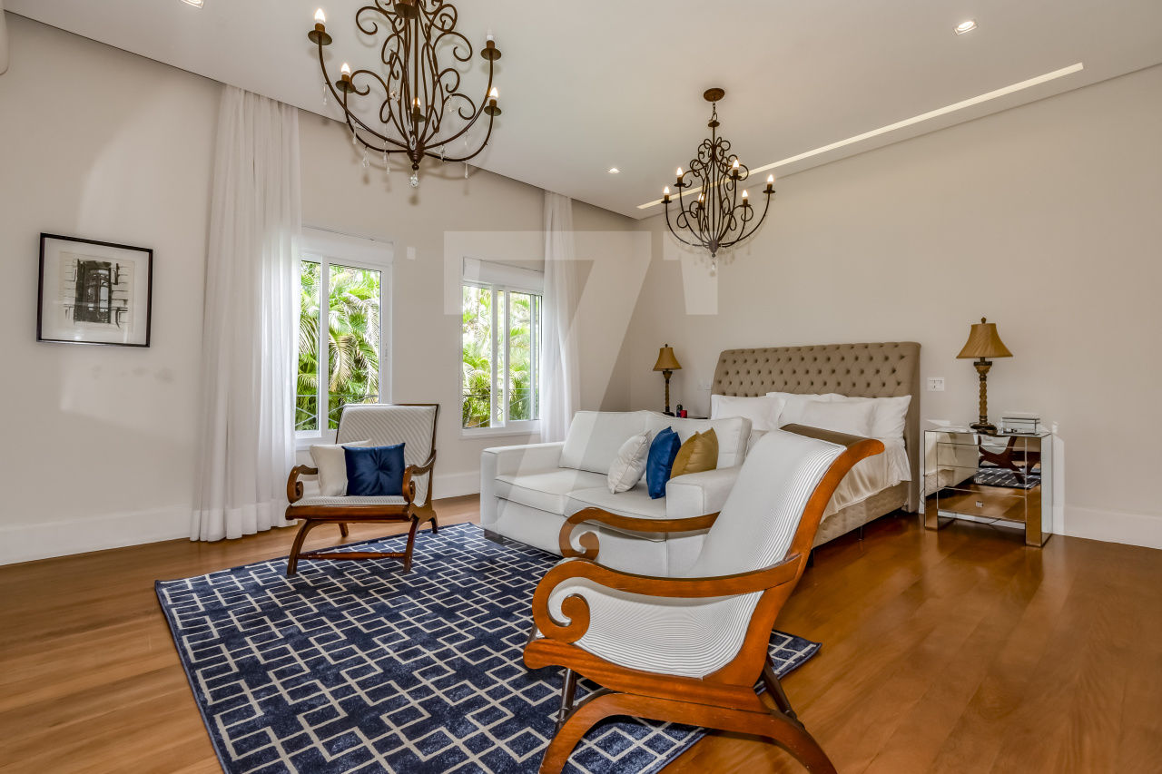 Casa com construção moderna com 3000 metros de terreno e 800 m² metros de área construída. Casa térrea com 5 suítes, uma master com closet e banheiros Sr. e Sra. Todas as suítes possuem varanda para área interna da residência. Sala de Estar com amplo living para 3 ambientes, sala de jantar, home, copa e cozinha, adega, espaço gourmet,. Amplo jardim com piscina e pomar. Sauna e casa com dependências de serviço completas. Garagem para 7 vagas. Atualizada e moderna.