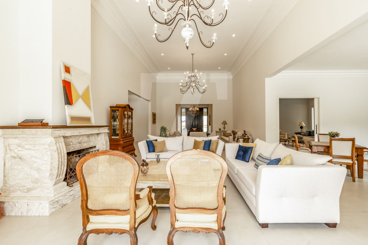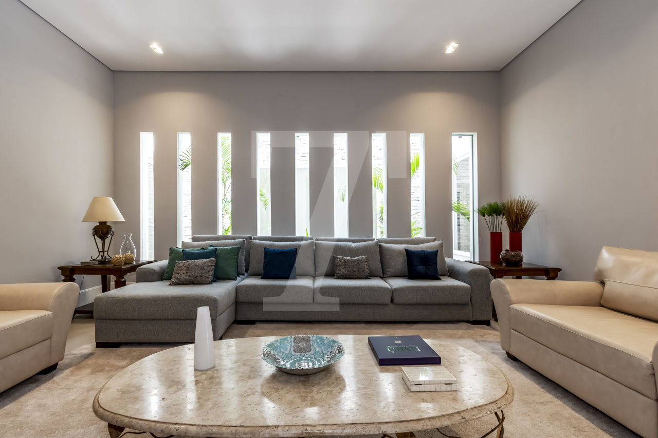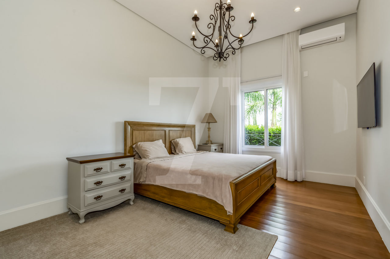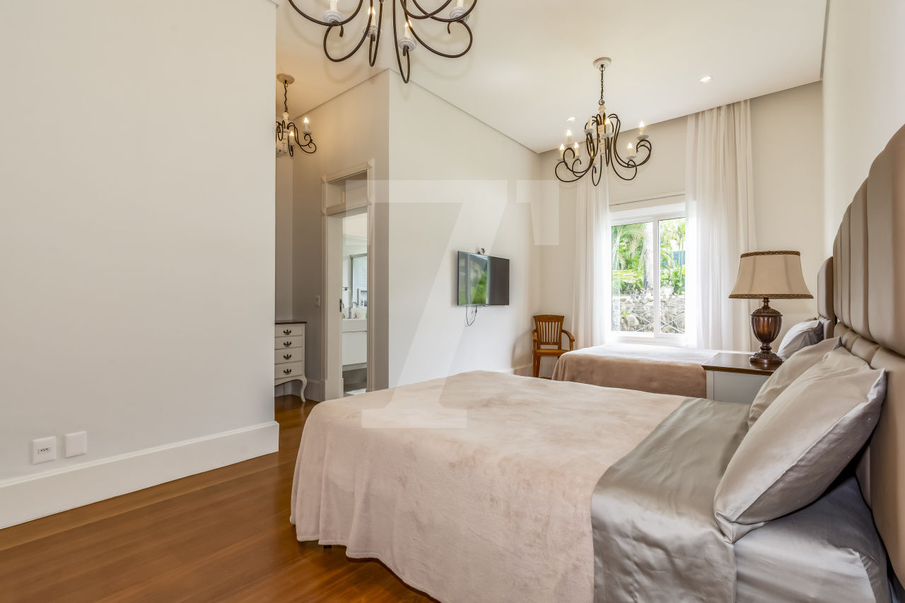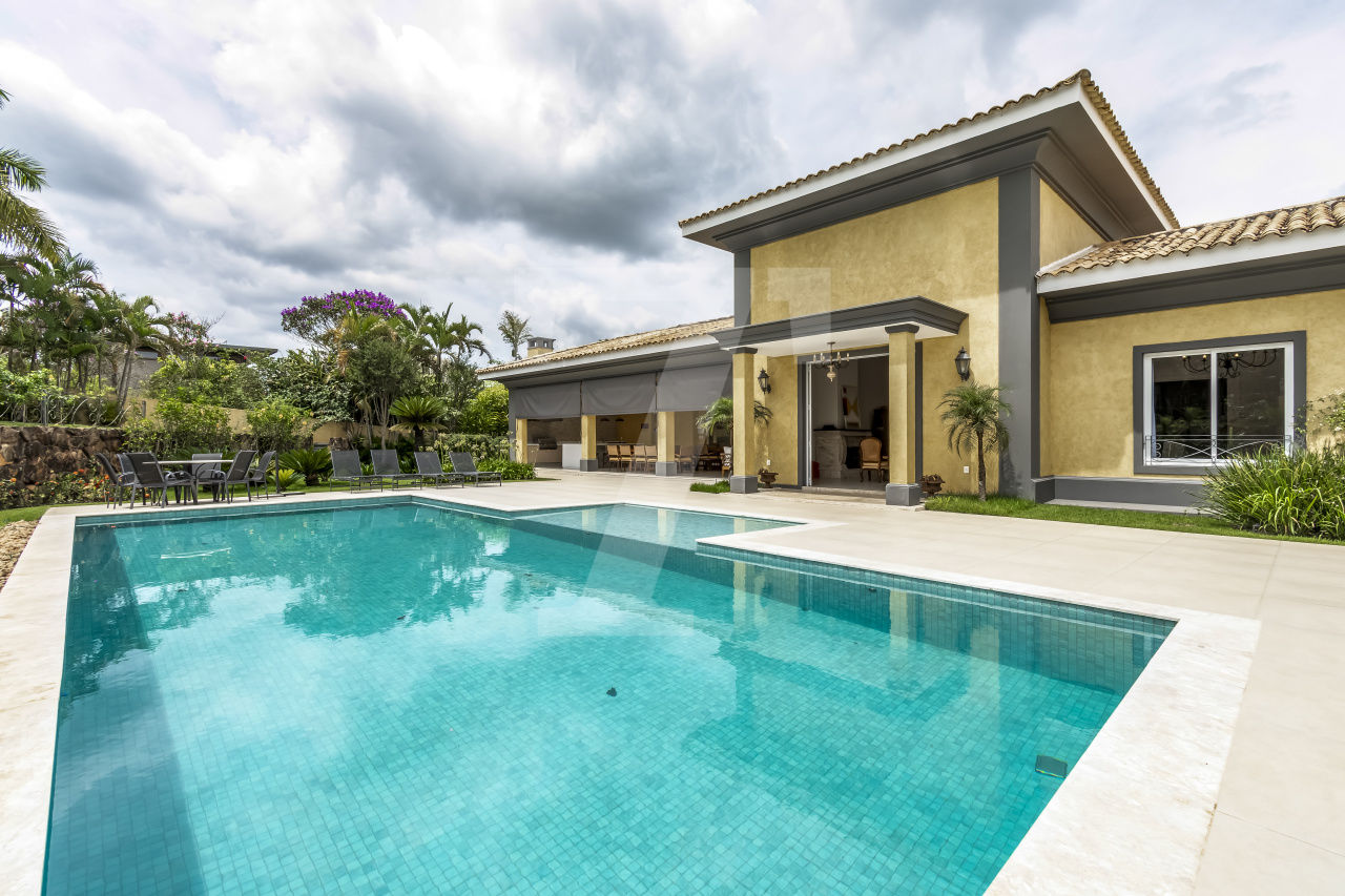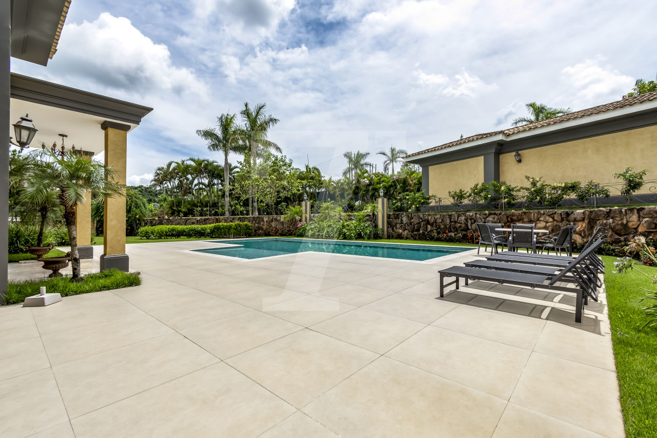 Casa com construção moderna com 3000 metros de terreno e 800 m² metros de área construída. Casa térrea com 5 suítes, uma master com closet e banheiros Sr. e Sra. Todas as suítes possuem varanda para área interna da residência. Sala de Estar com amplo living para 3 ambientes, sala de jantar, home, copa e cozinha, adega, espaço gourmet,. Amplo jardim com piscina e pomar. Sauna e casa com dependências de serviço completas. Garagem para 7 vagas. Atualizada e moderna.