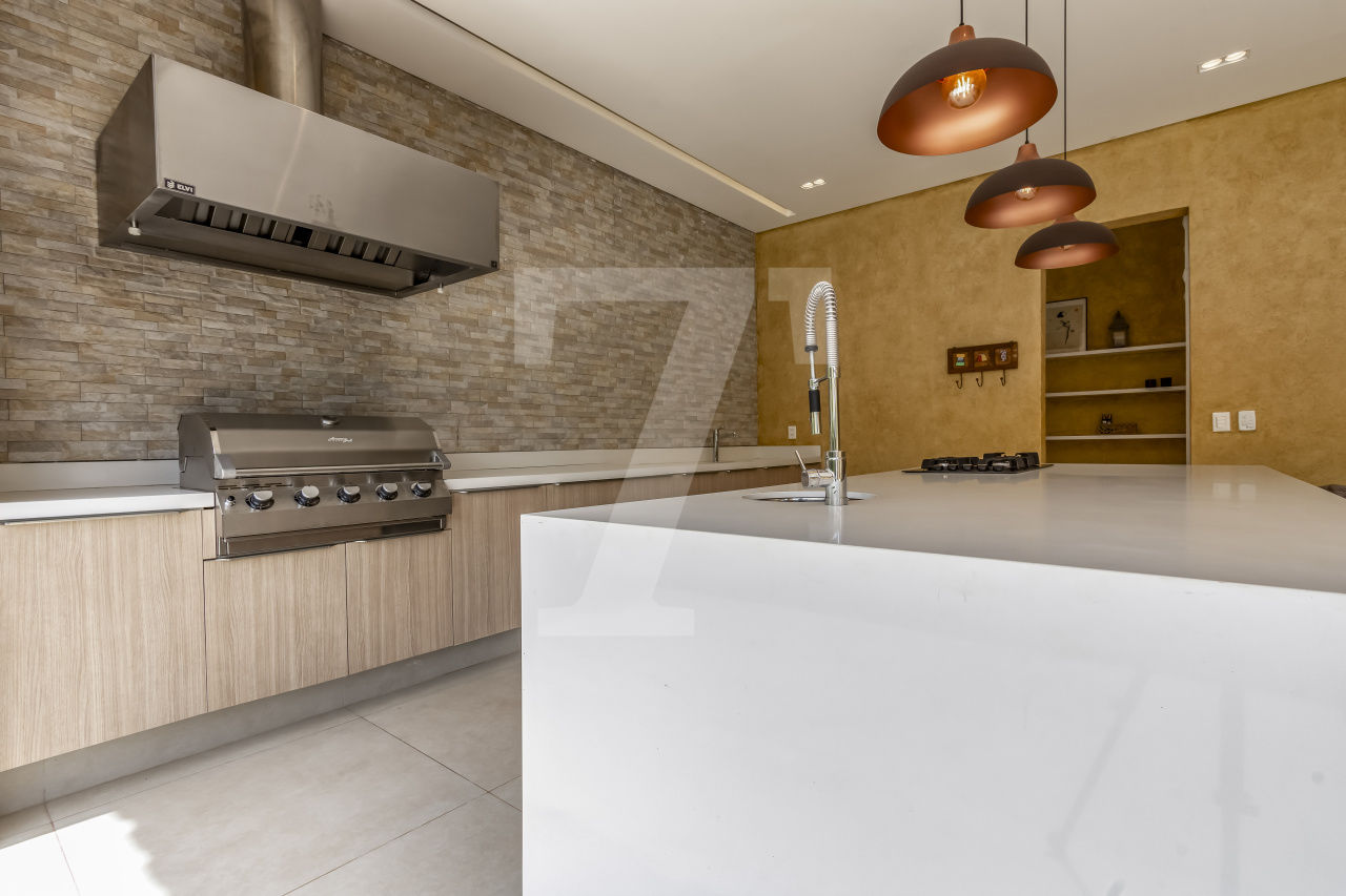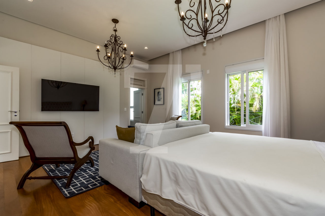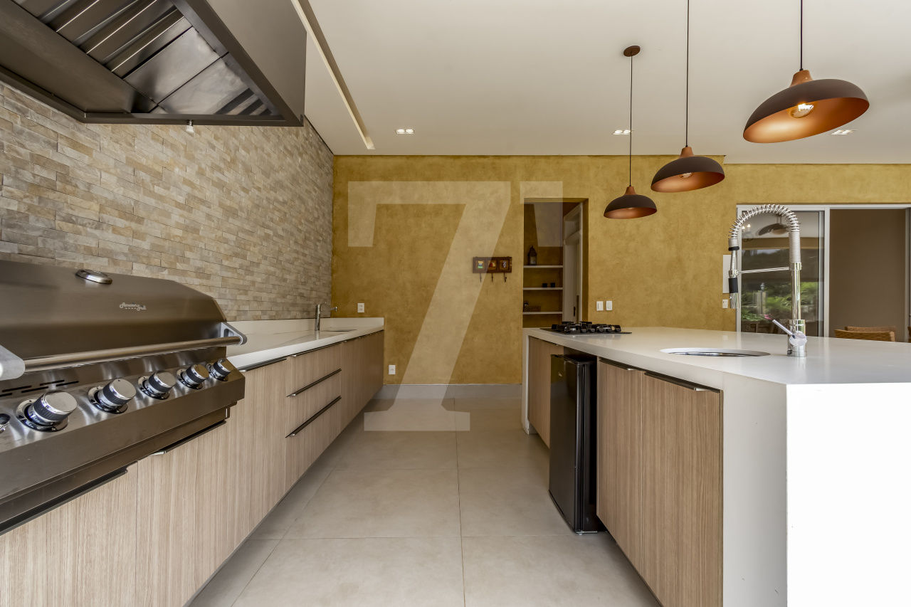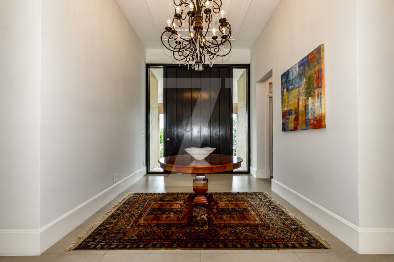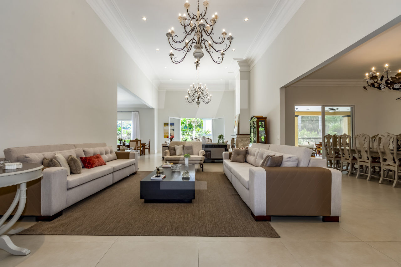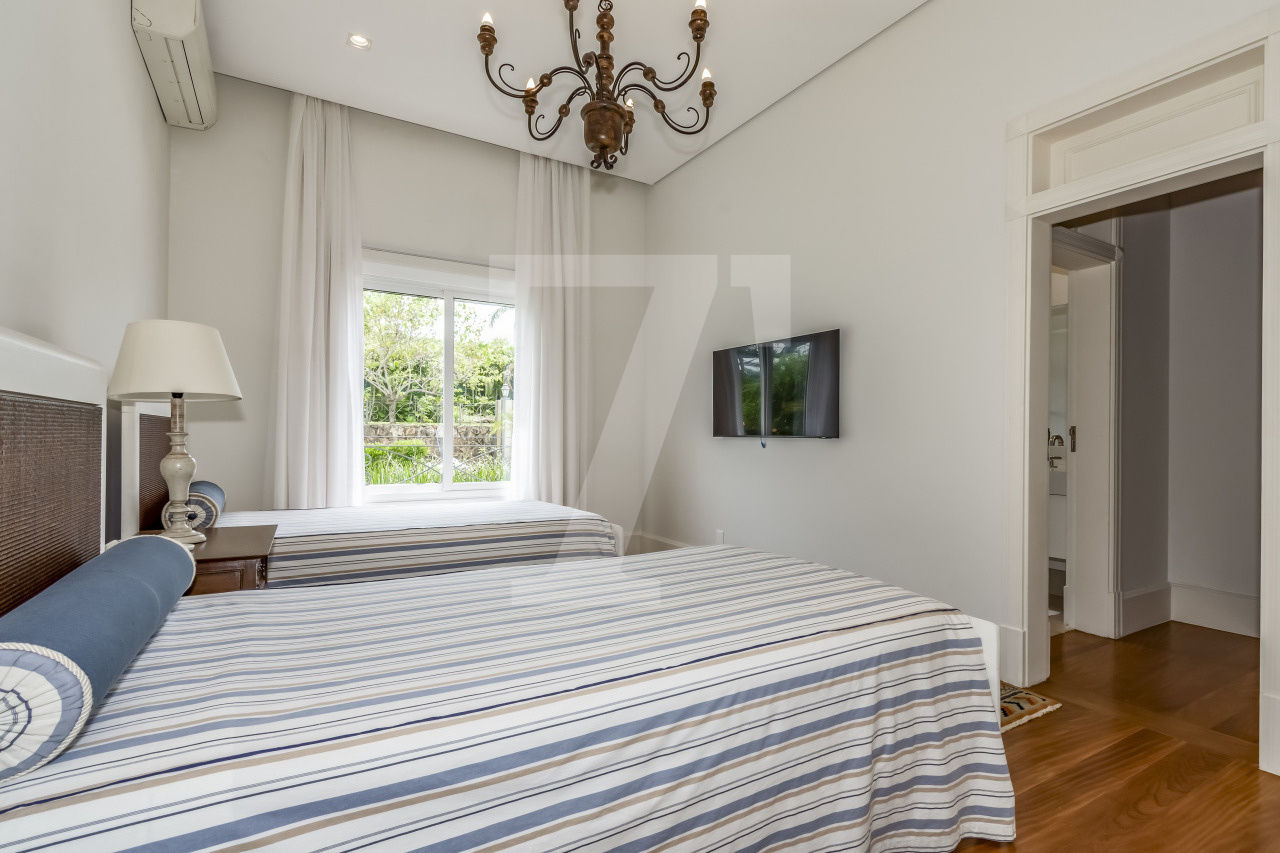 Casa com construção moderna com 3000 metros de terreno e 800 m² metros de área construída. Casa térrea com 5 suítes, uma master com closet e banheiros Sr. e Sra. Todas as suítes possuem varanda para área interna da residência. Sala de Estar com amplo living para 3 ambientes, sala de jantar, home, copa e cozinha, adega, espaço gourmet,. Amplo jardim com piscina e pomar. Sauna e casa com dependências de serviço completas. Garagem para 7 vagas. Atualizada e moderna.