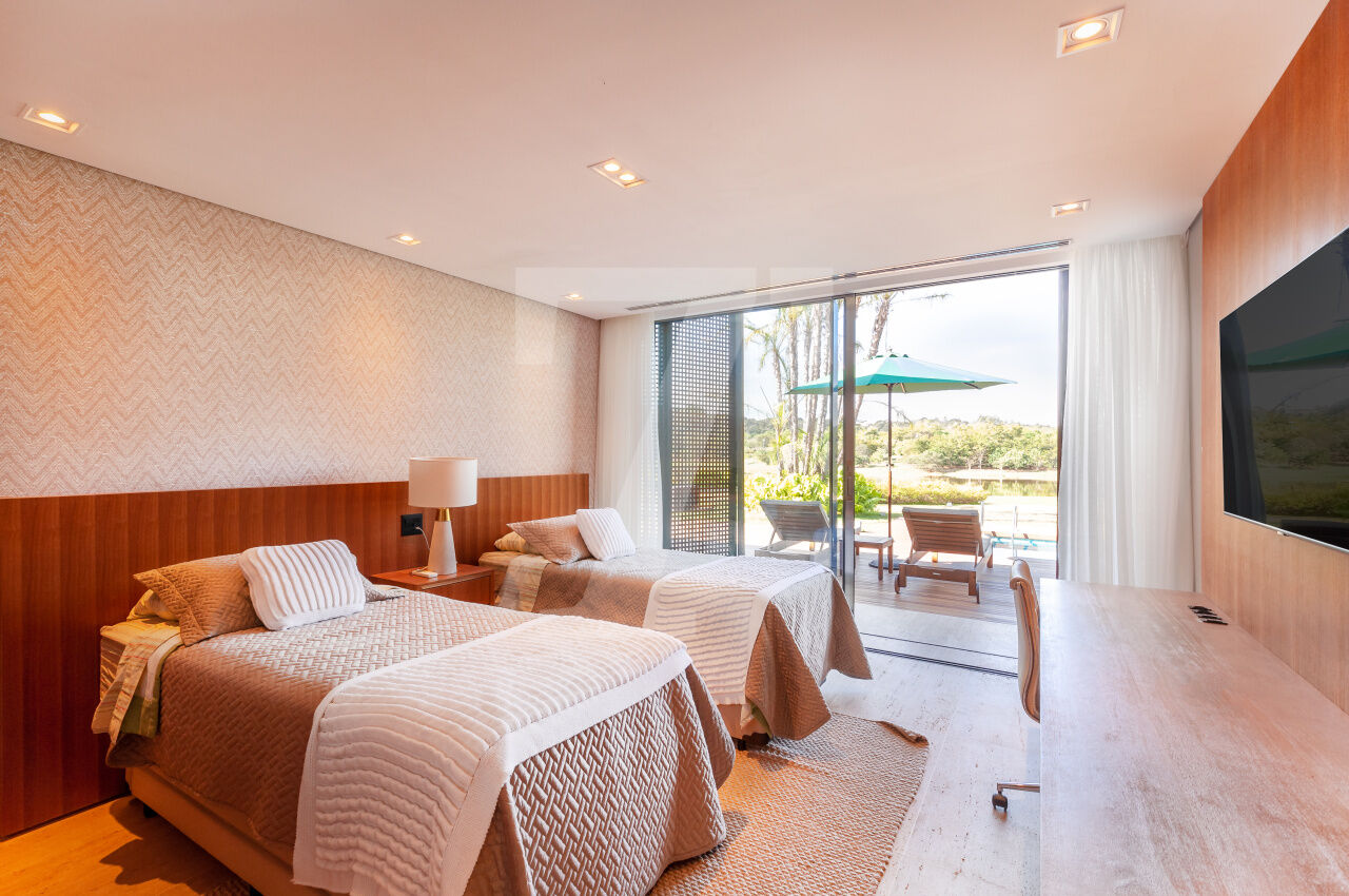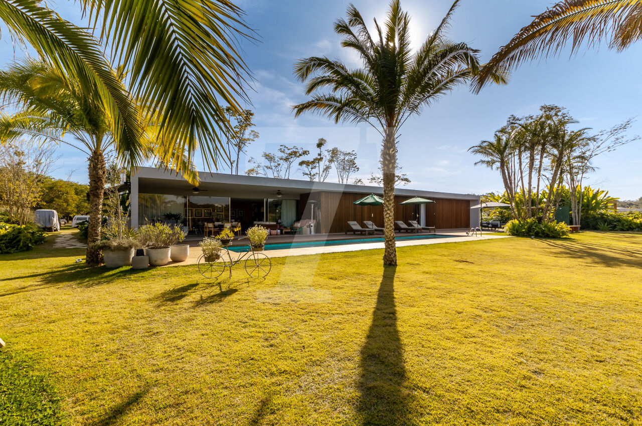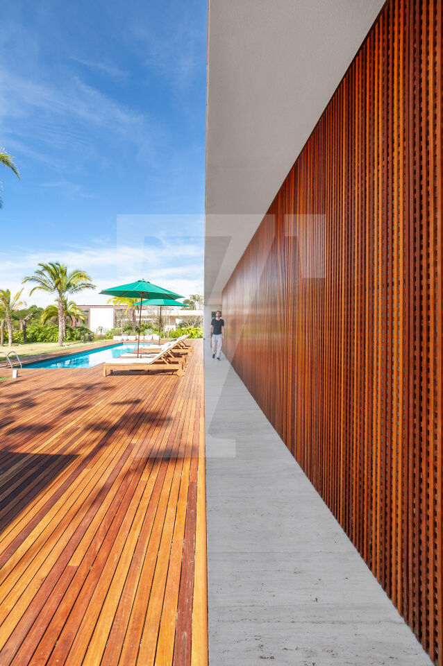 Paisagismo integrado, com decks, piscina, e amplos espaços externos que valorizam o entorno ? comum em outras residências da Fazenda Boa Vista, como as Villas Fasano do Lago