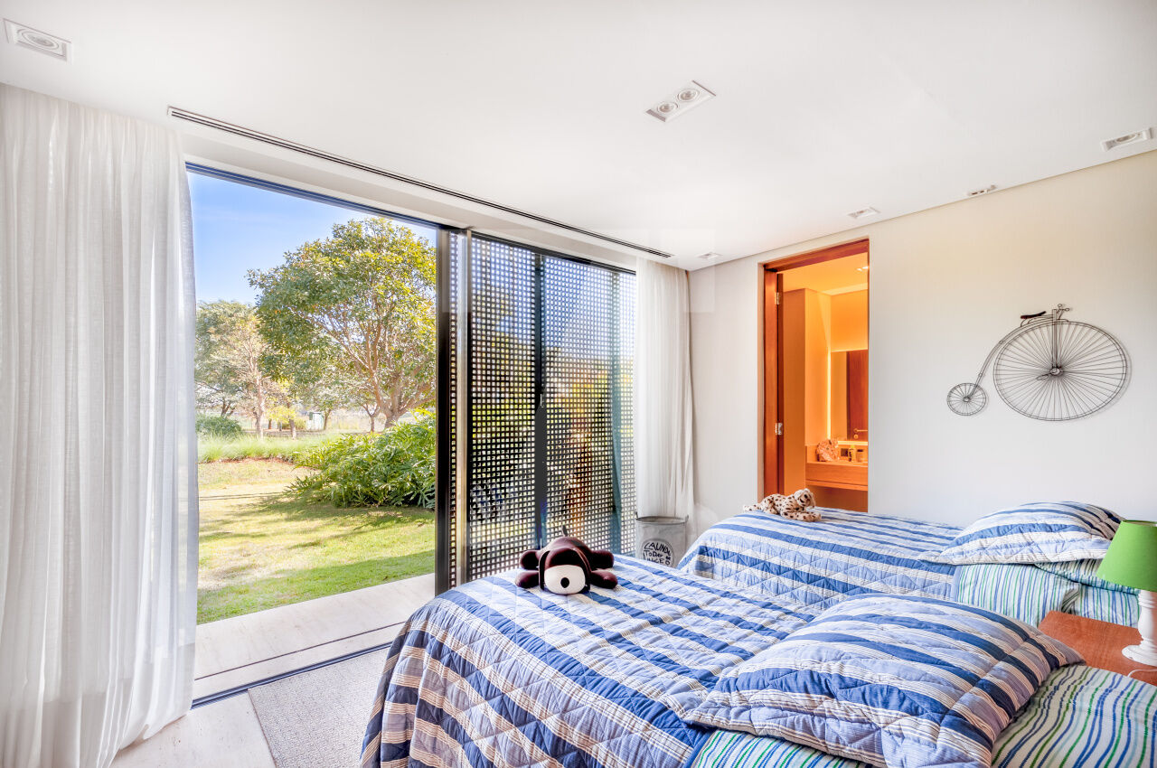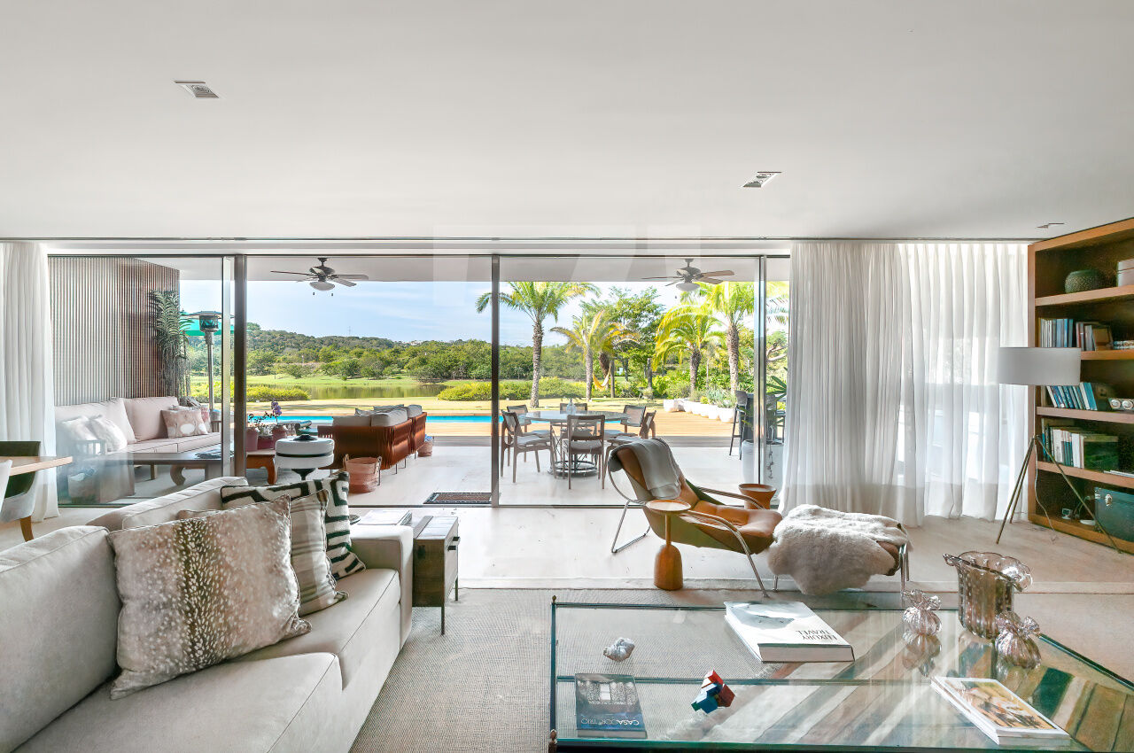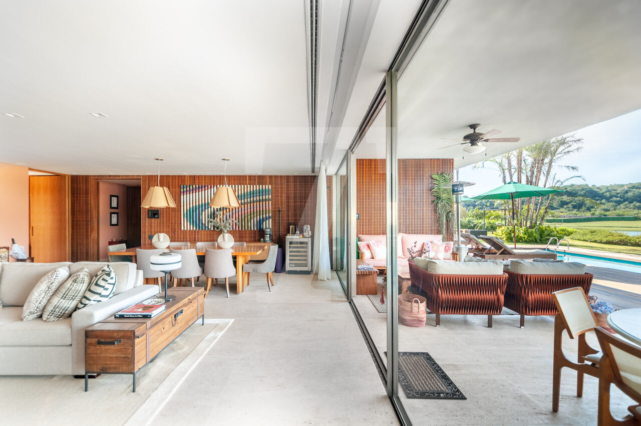 Ambientes integrados com grandes aberturas de vidro, favorecendo a luminosidade e a conexão com o exterior;