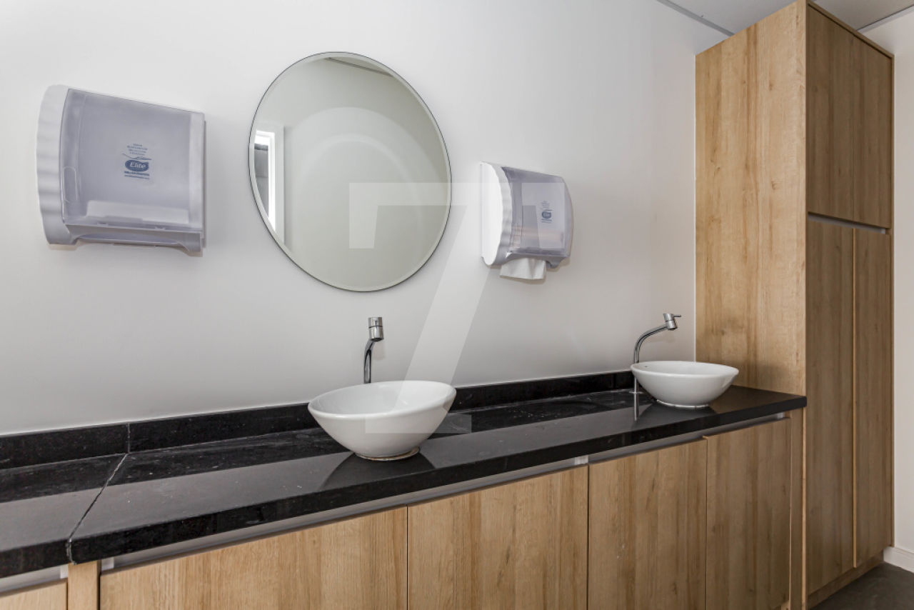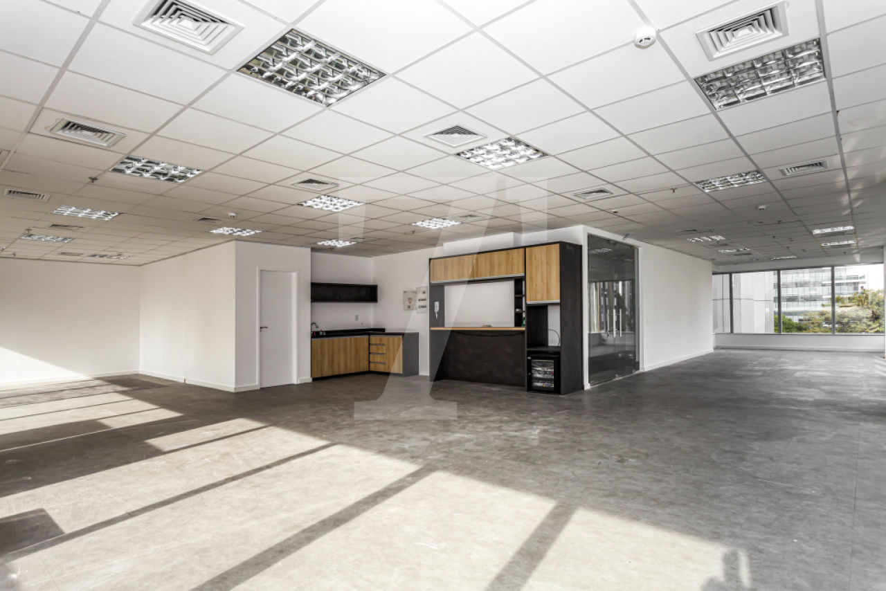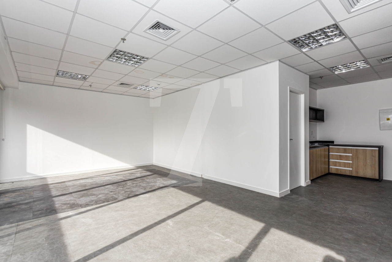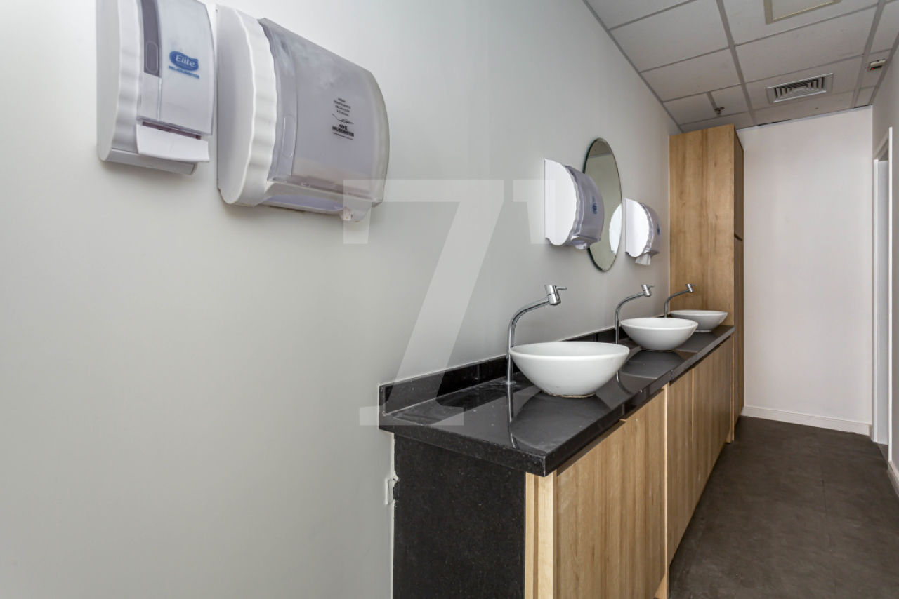 Possui piso elevado, forro modular e 6 vagas de garagem.
